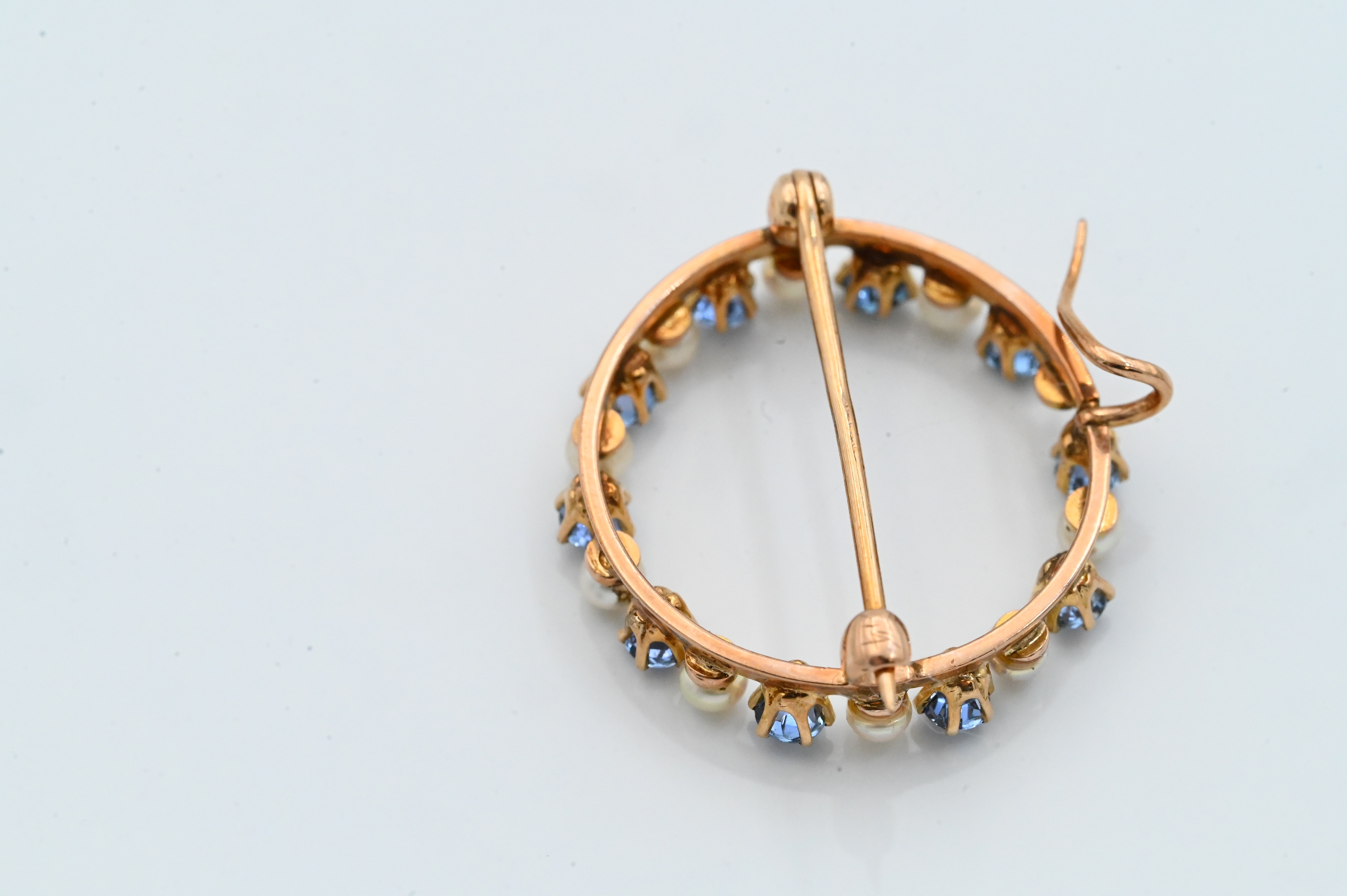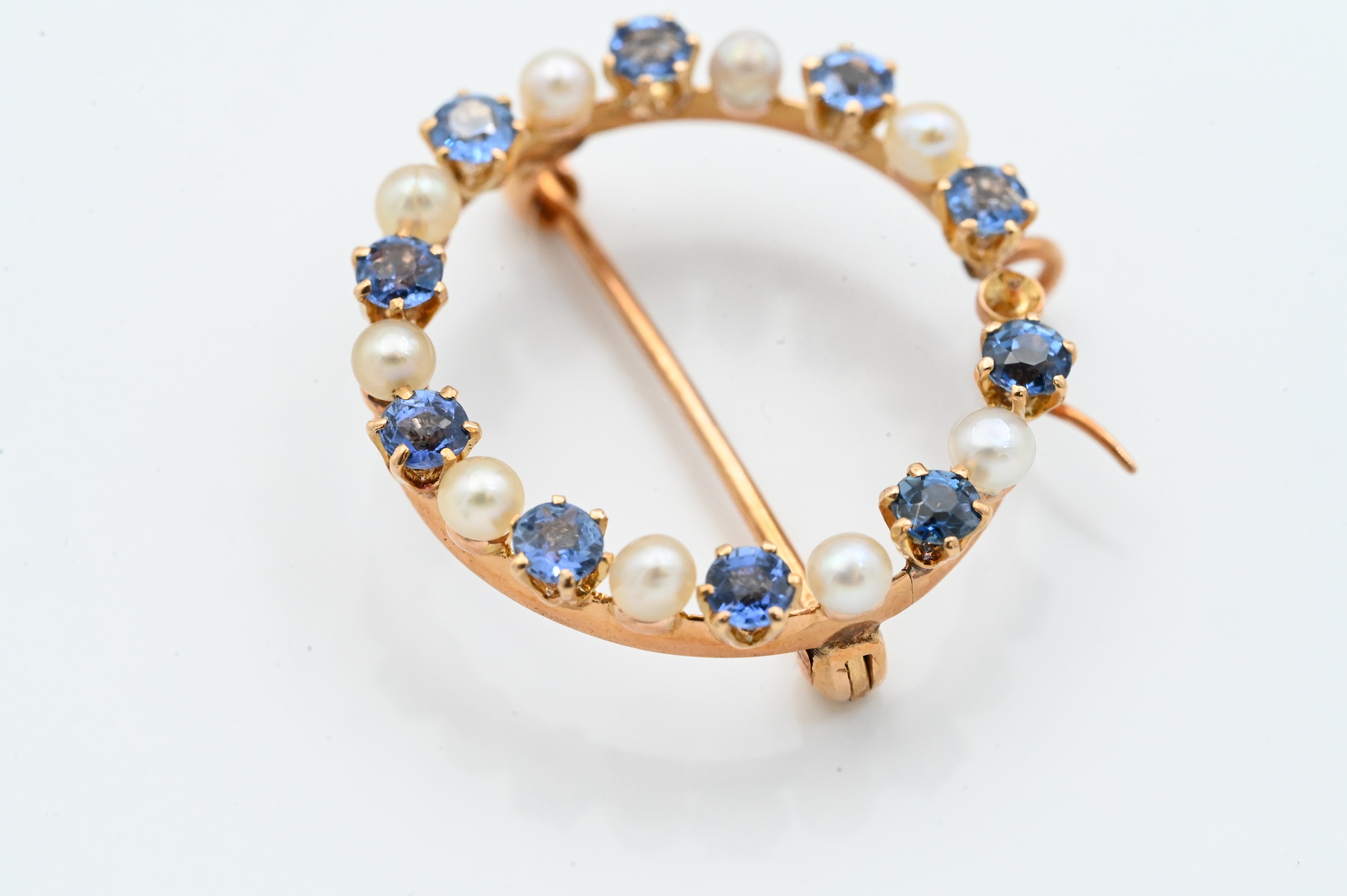 Lot 263: 14K Yellow Gold Sapphire and Pearl Brooch