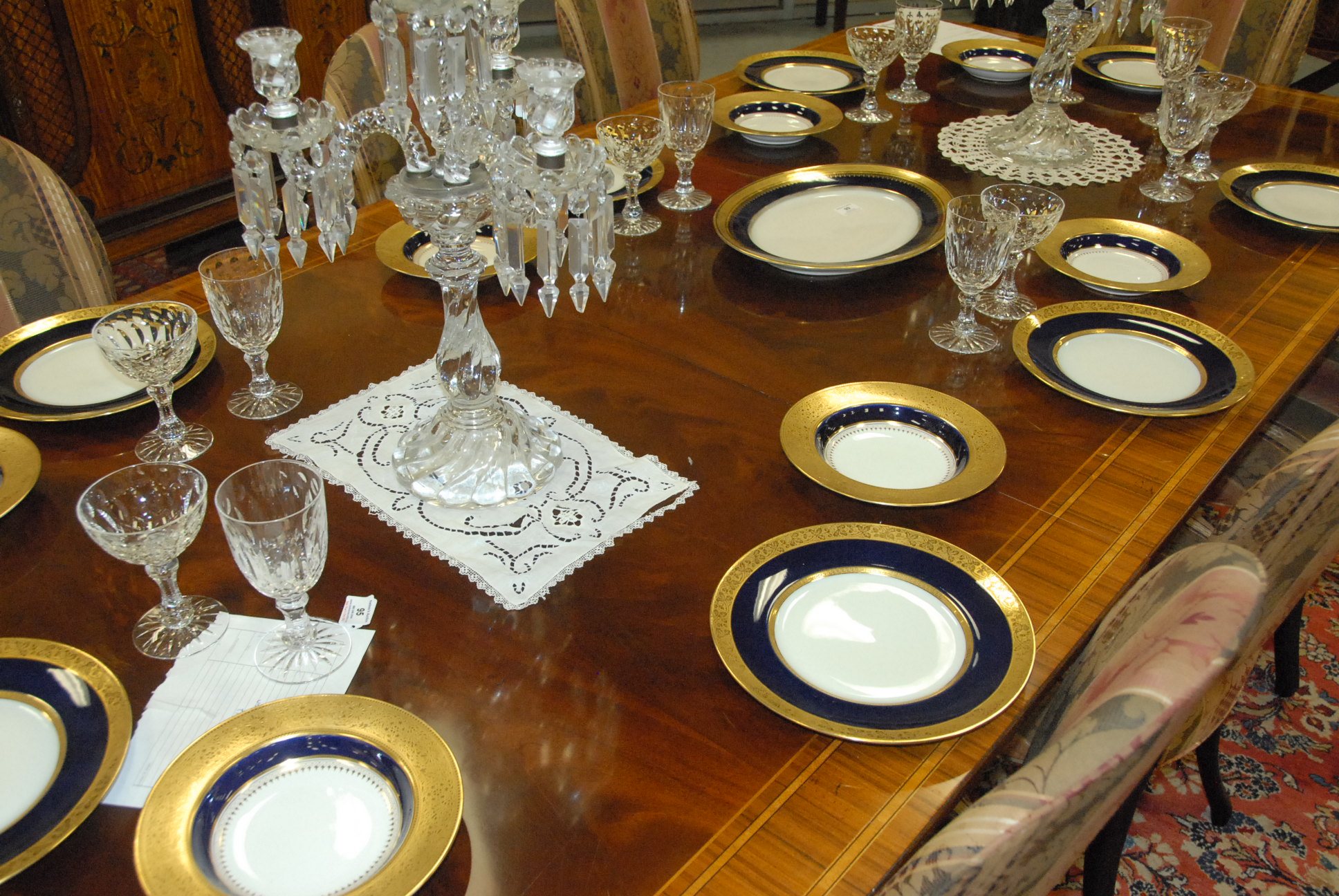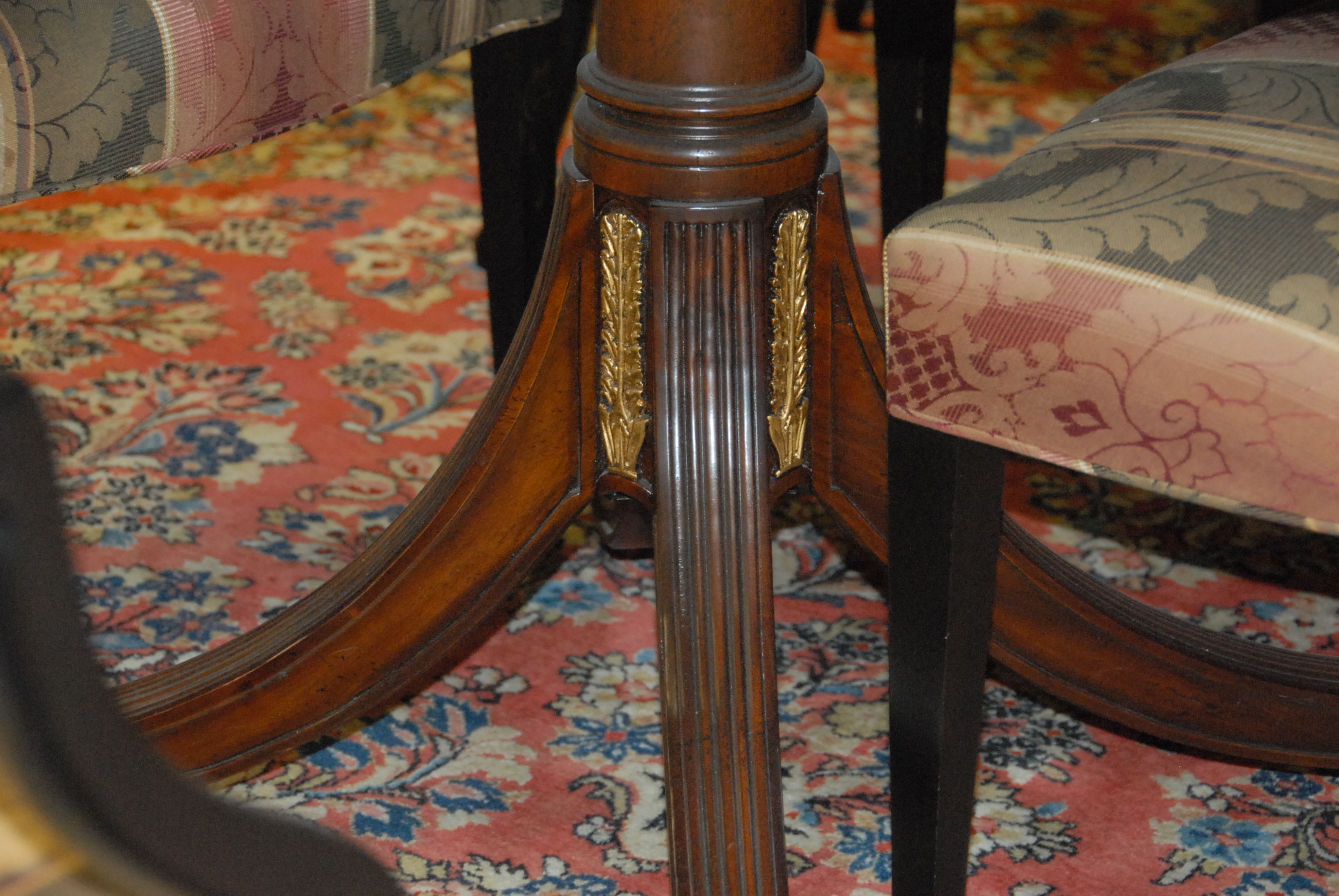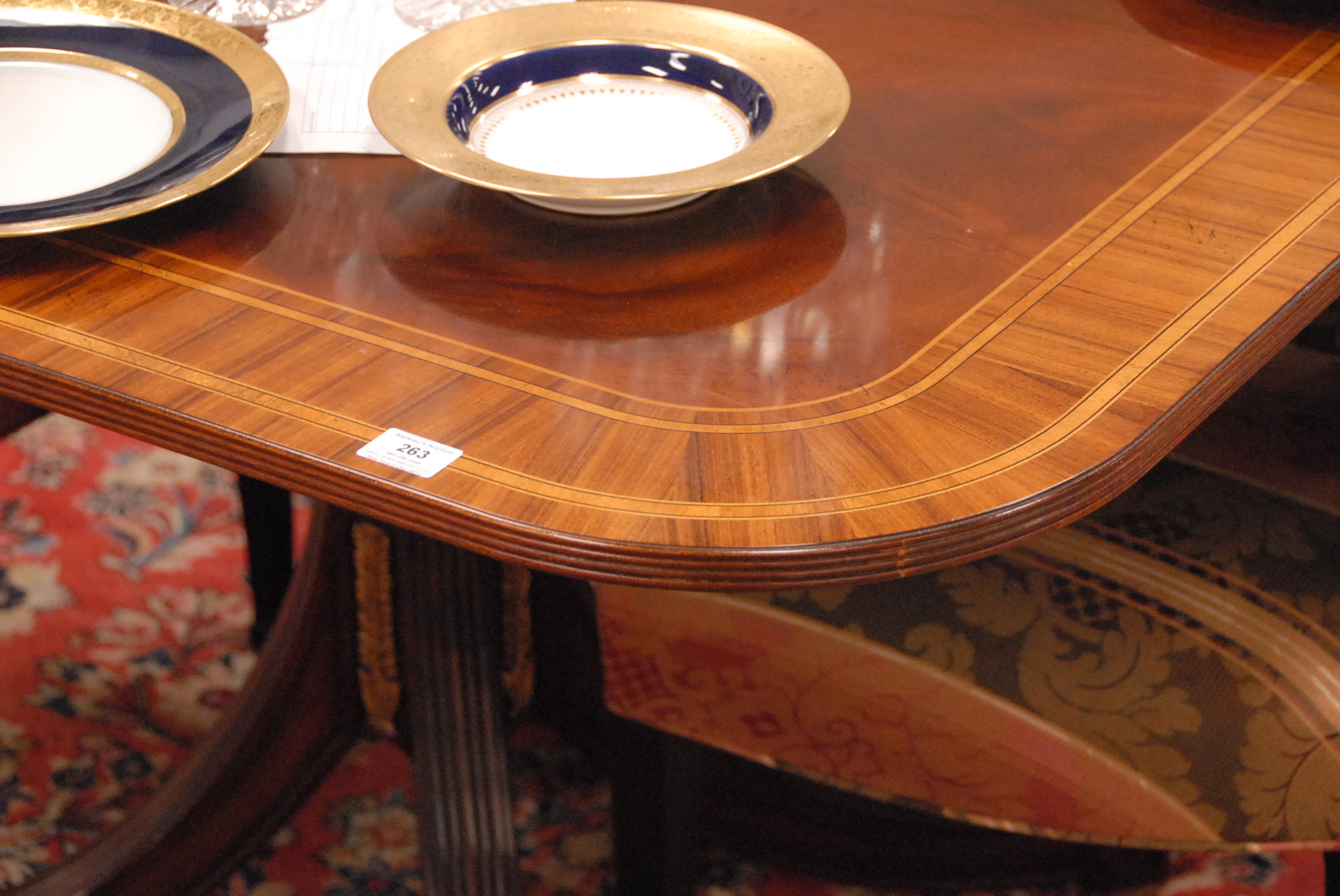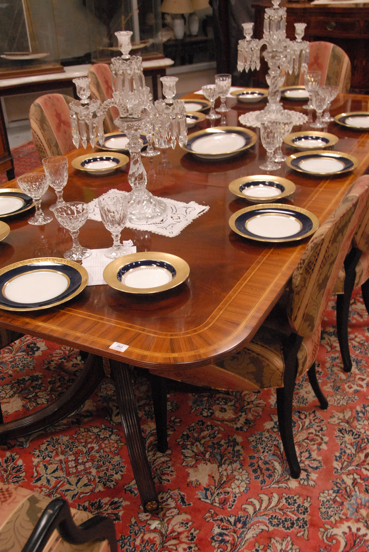 Lot 263: Baker mahogany dining table, rectangular top on double pedestal base, top with large banded various wood inlays, along with three 22inch leaves and pads. ht. 29 1/2in. wd. 48in. lg. 79in. open: 48 x 145