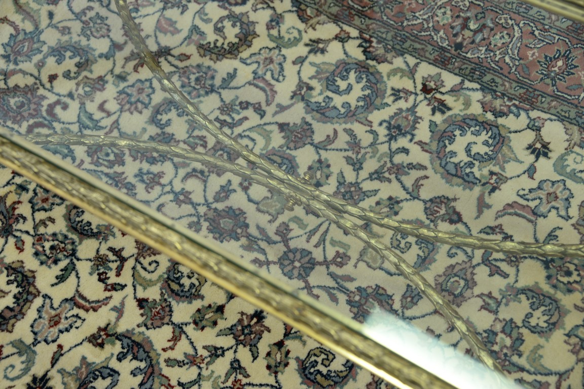Brass and glass coffee table, legs and frame with leaf motif. ht. 16in., top: 20 x 41
