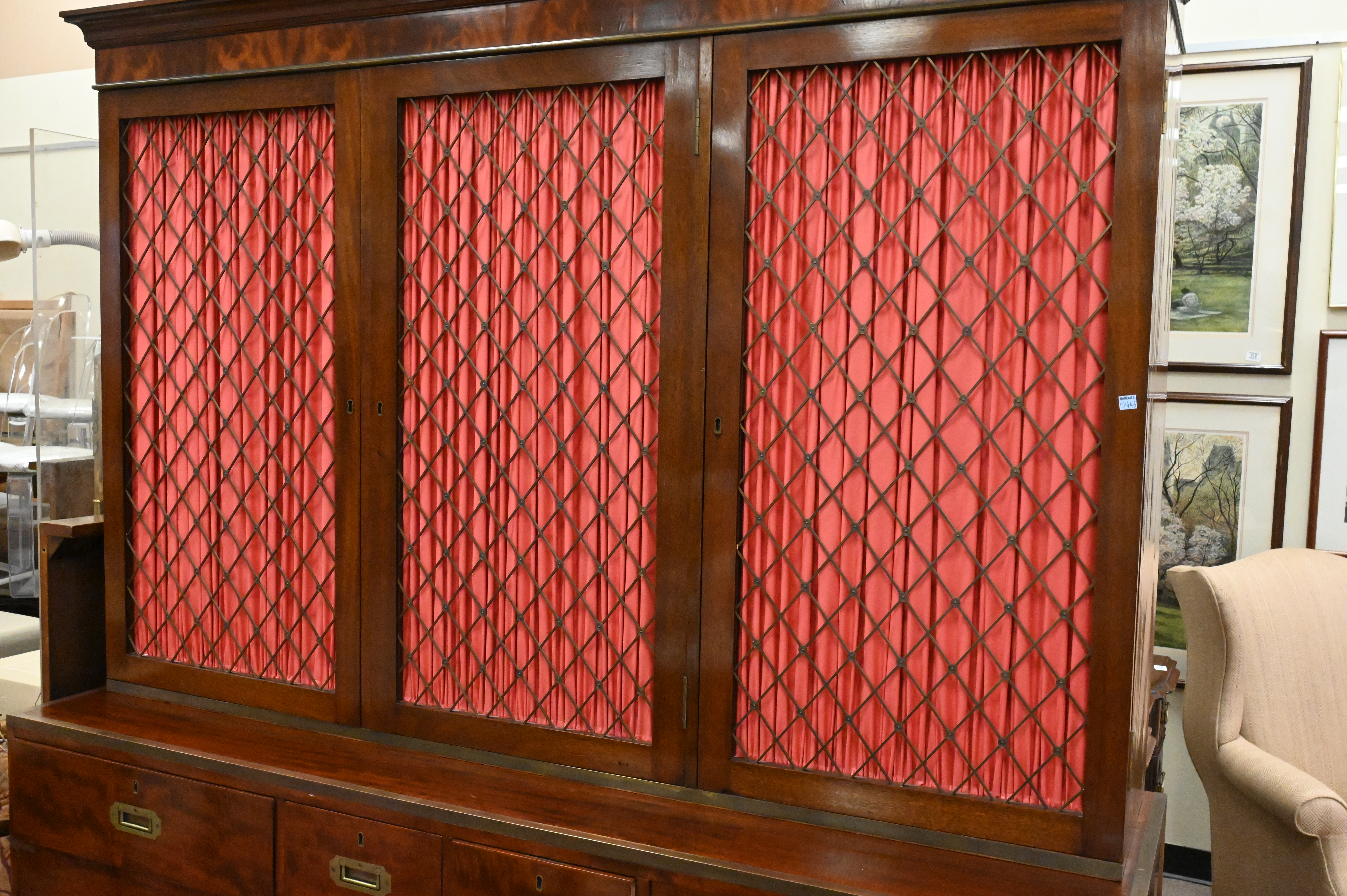 in three parts with four grill work doors over base with 16 drawers, with brass trim, late 19th early 20th century