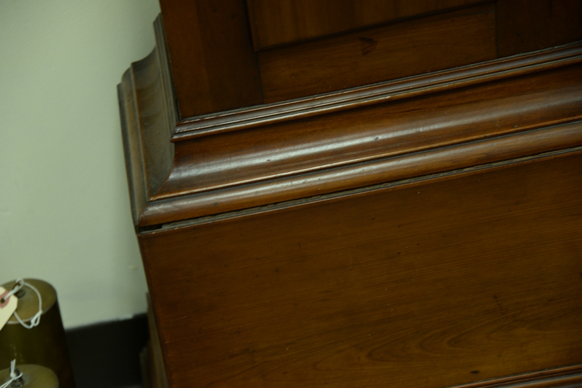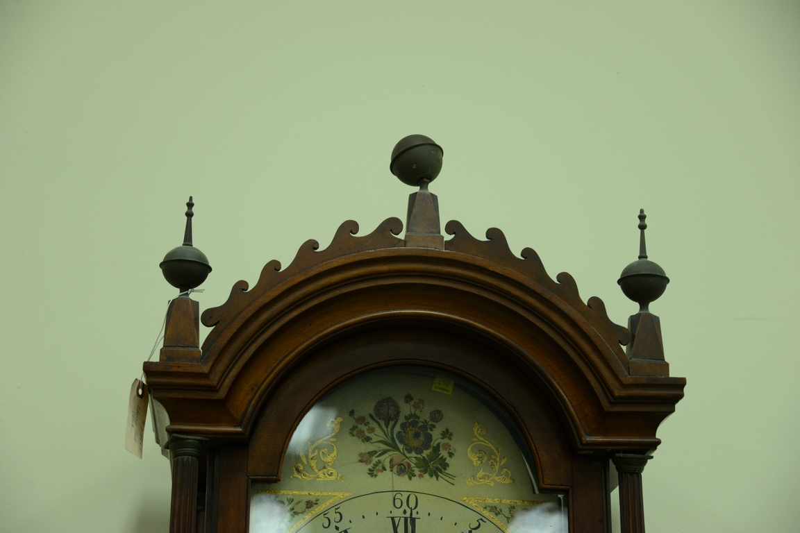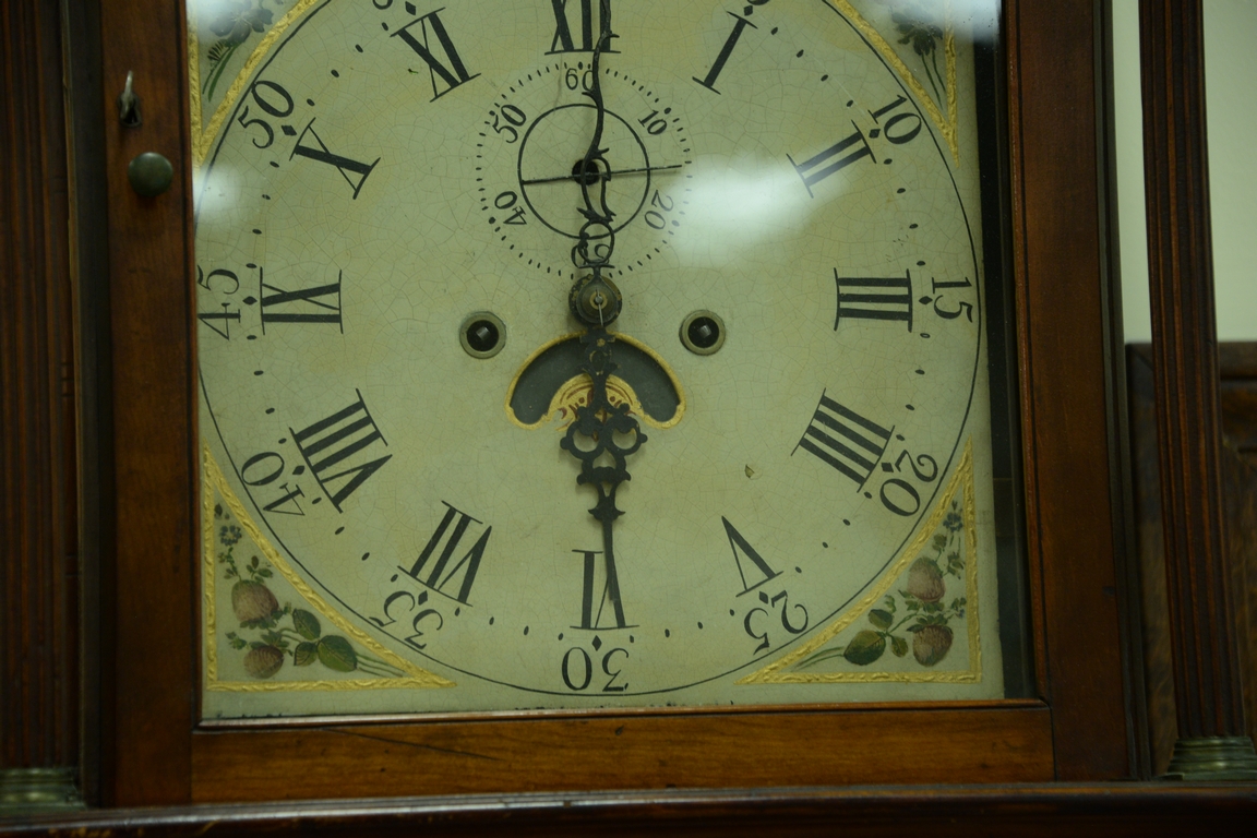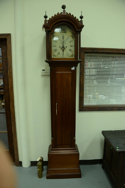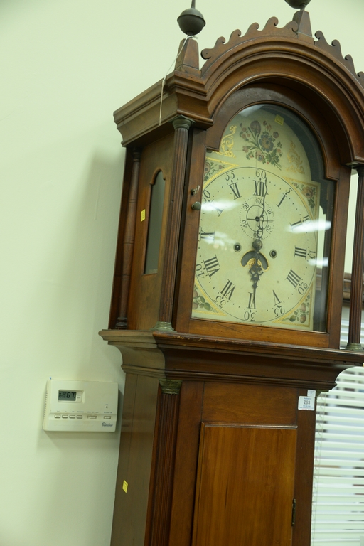 Lot 263: Cherry tall clock having tombstone dial with brass works, case with fluted columns all set on plain base one finial missing steeple…