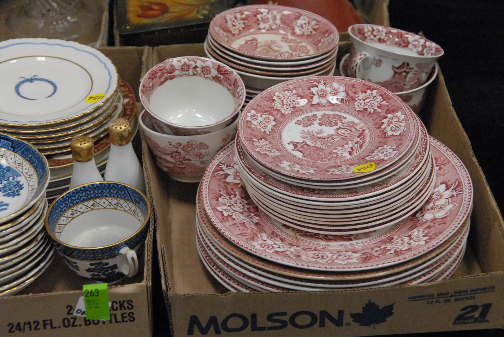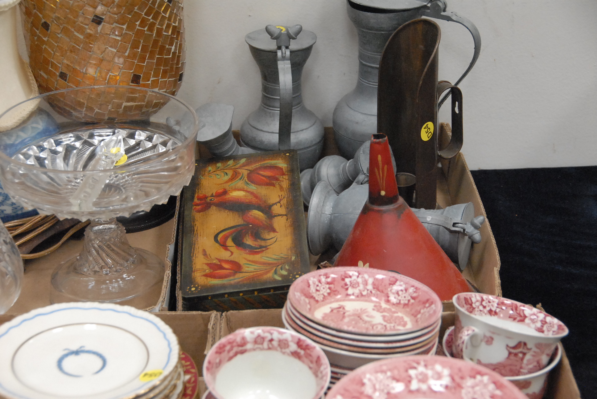 Four box lots of red and white china, blue and white china, some crystal, blue and white lamp, and pewter measures.