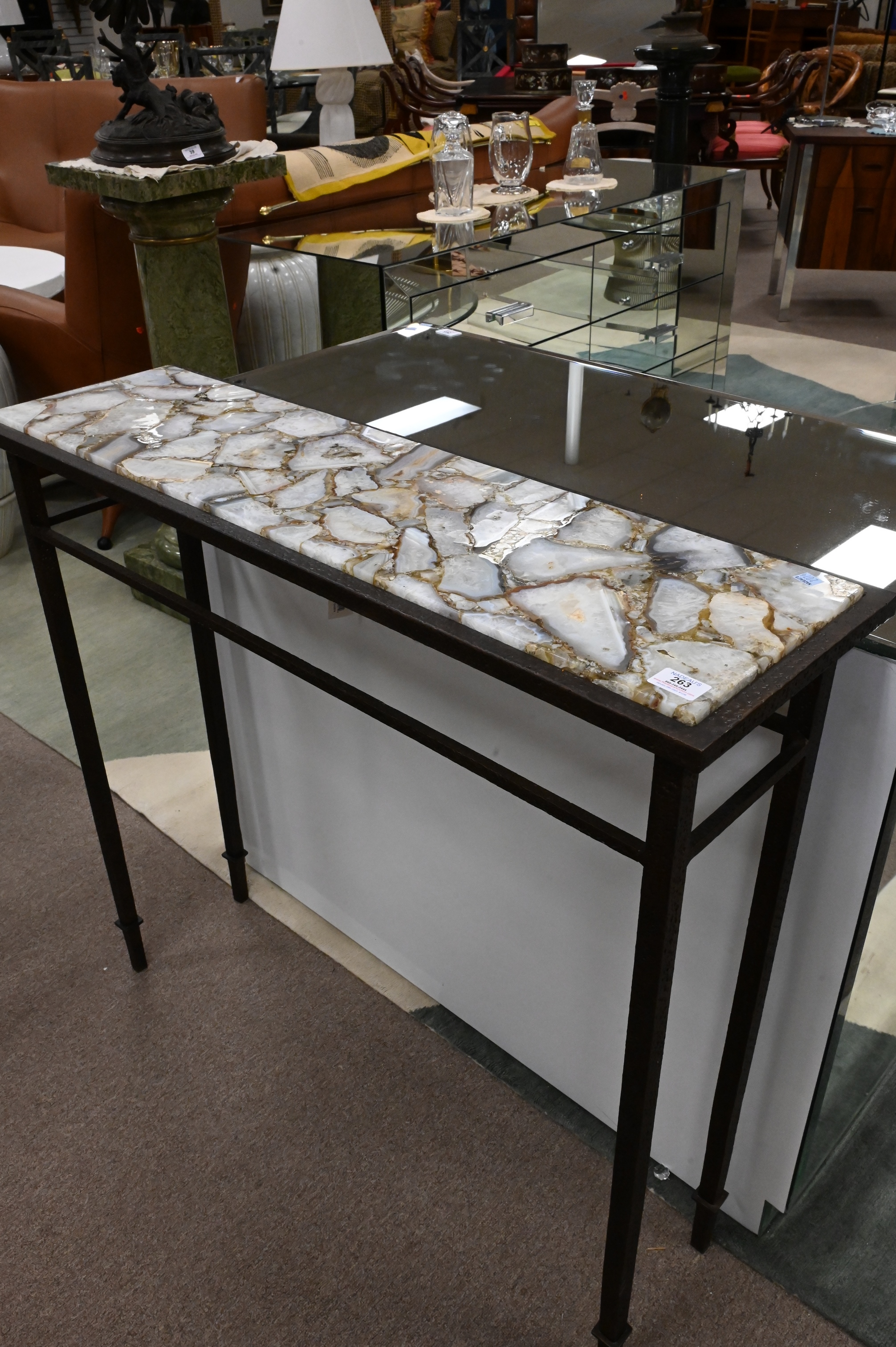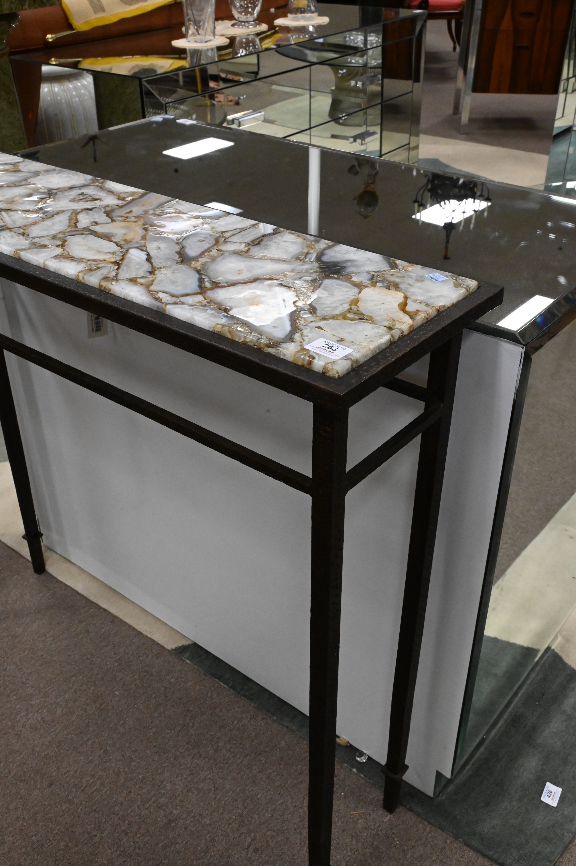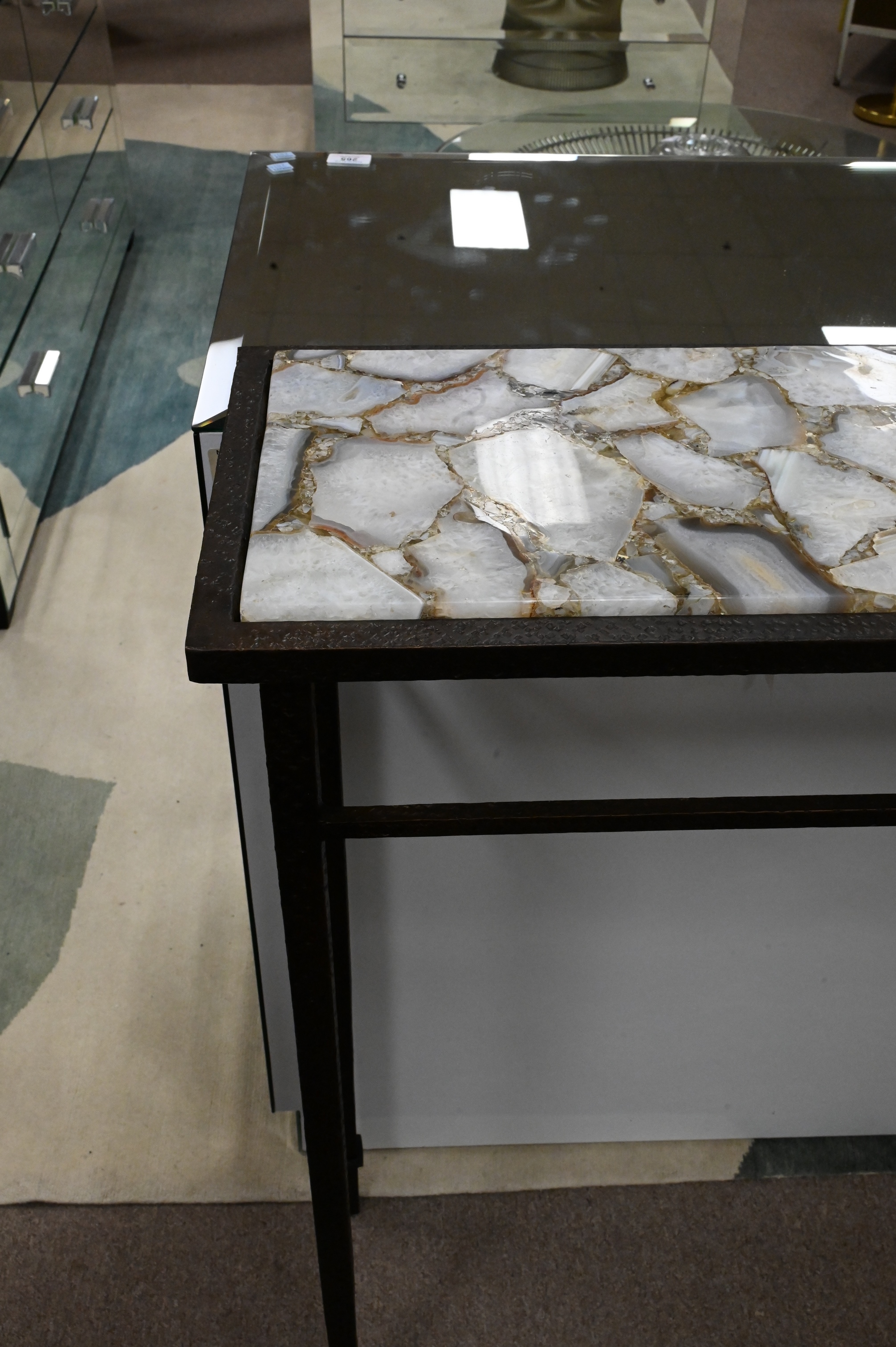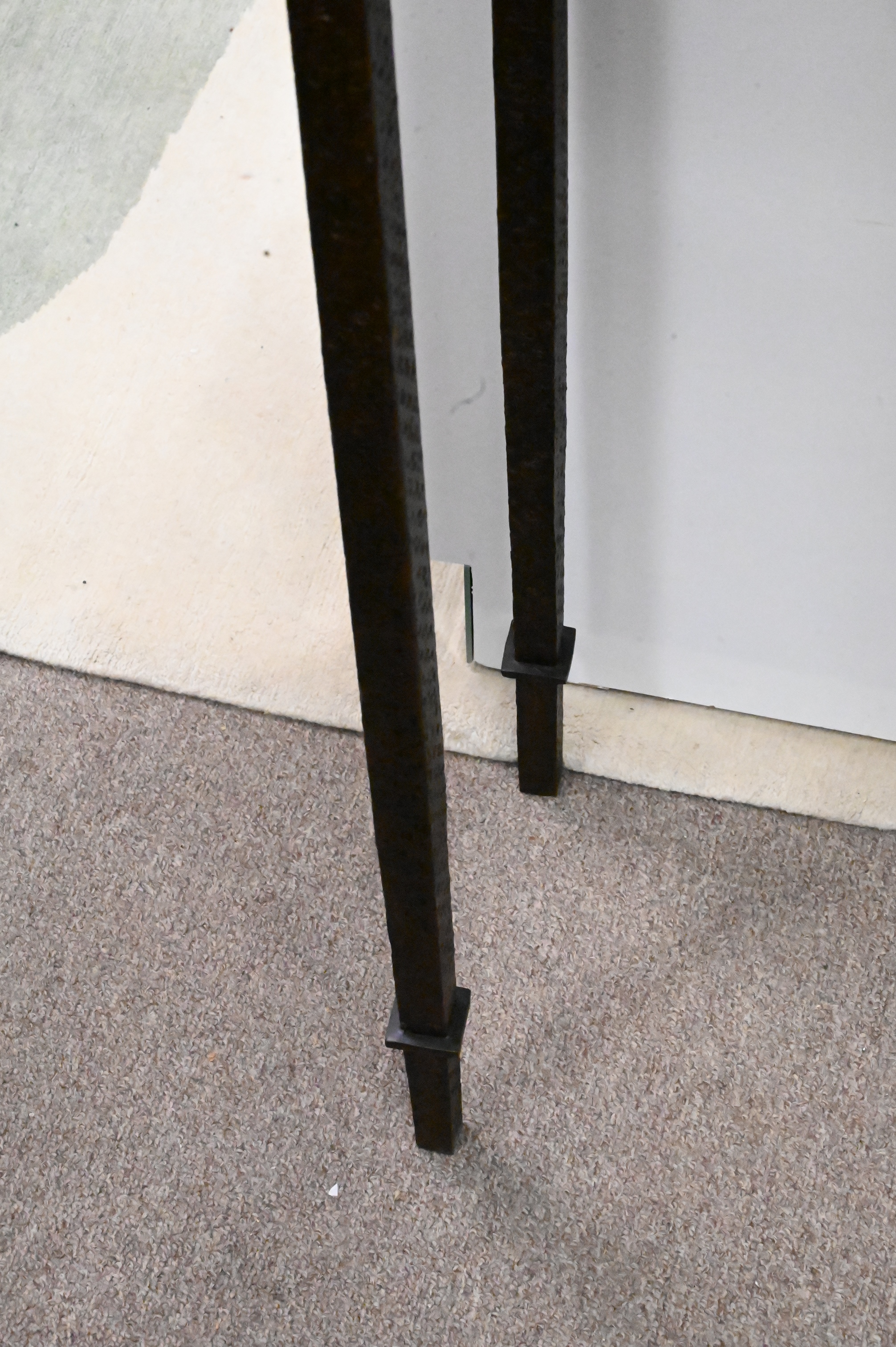 Global Views Studio Iron Hall Table, having quartz stone top along with a hammered iron base, height 36 inches, top 11 1/2″ x 39 1/2″.