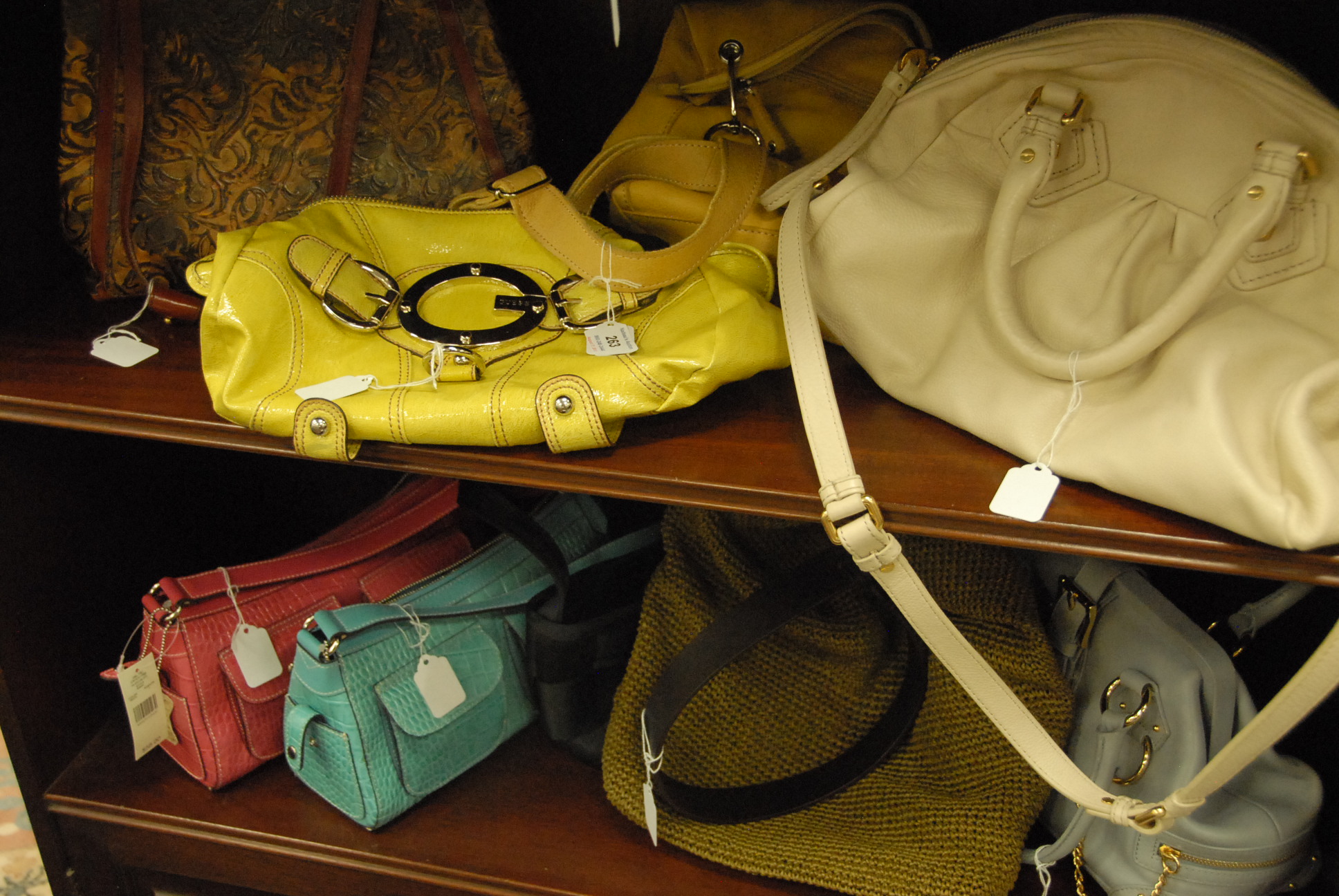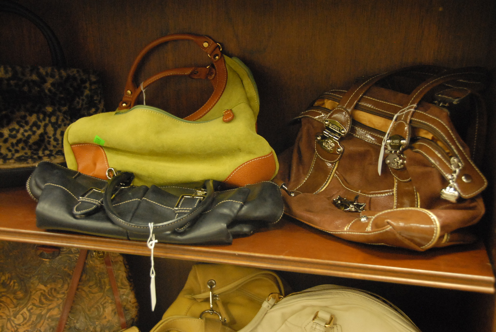 Lot 263: Group of 16 purses and hand bags, some new with tags including Tumi, Tignanello, Guess, Marc Jacobs, etc.