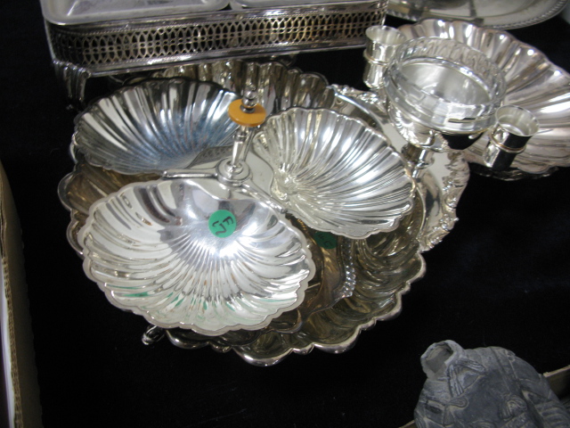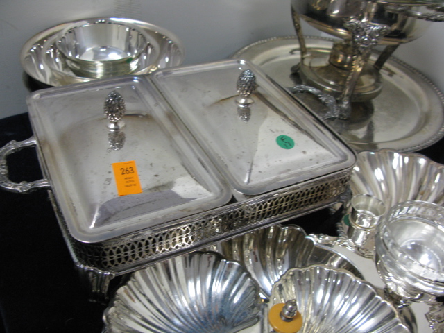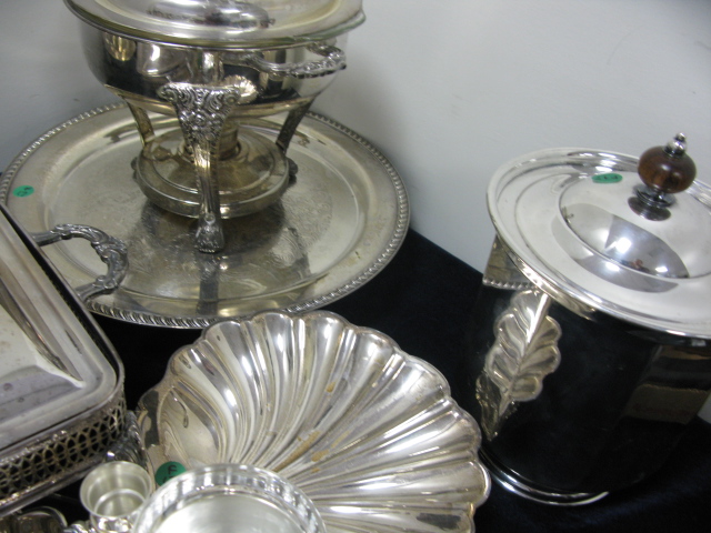 Group of silver plate to include Revere style bowls, chaffing dish, covered dish, shell shaped dishes, ice bucket and miscellaneous.