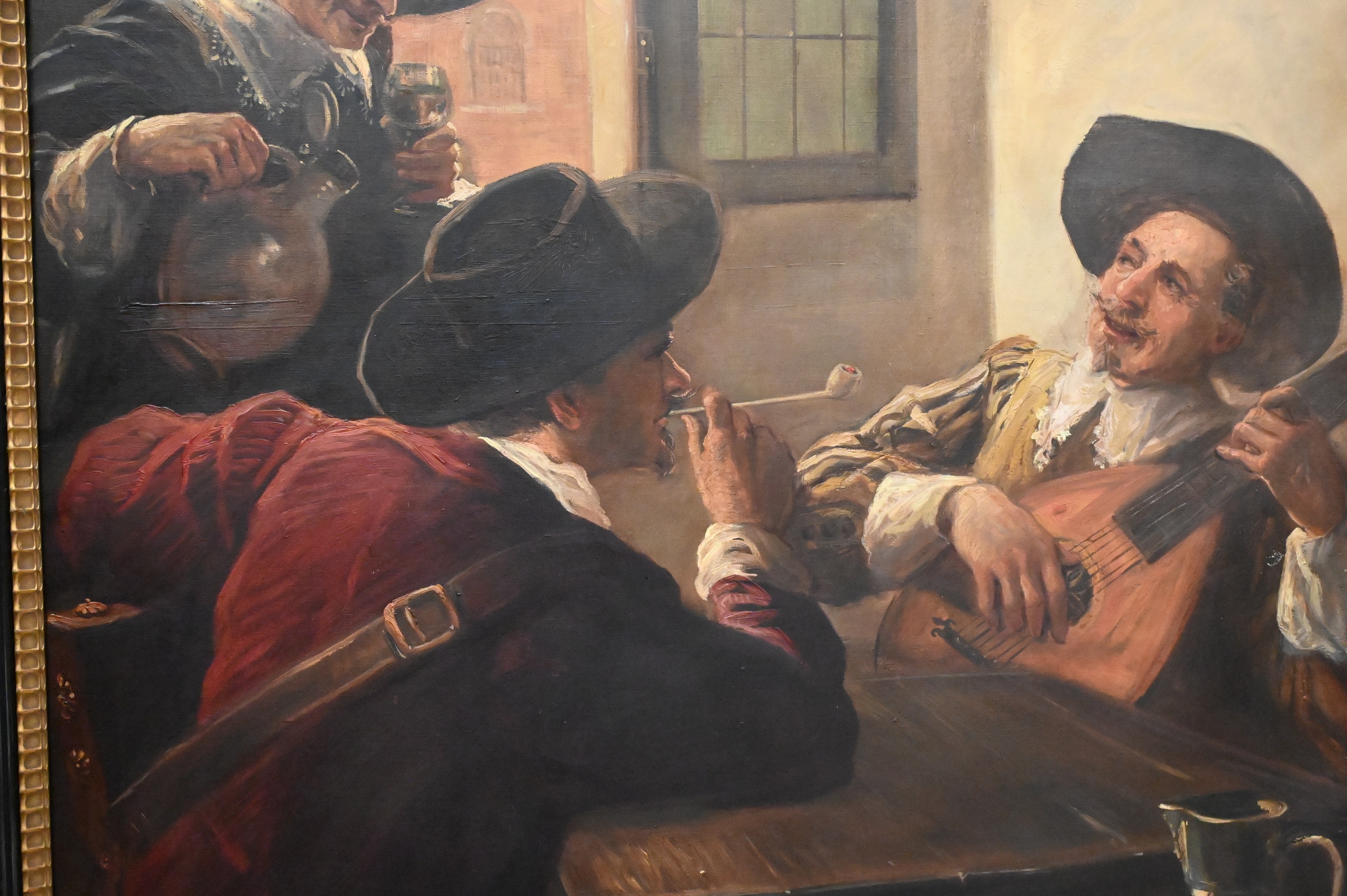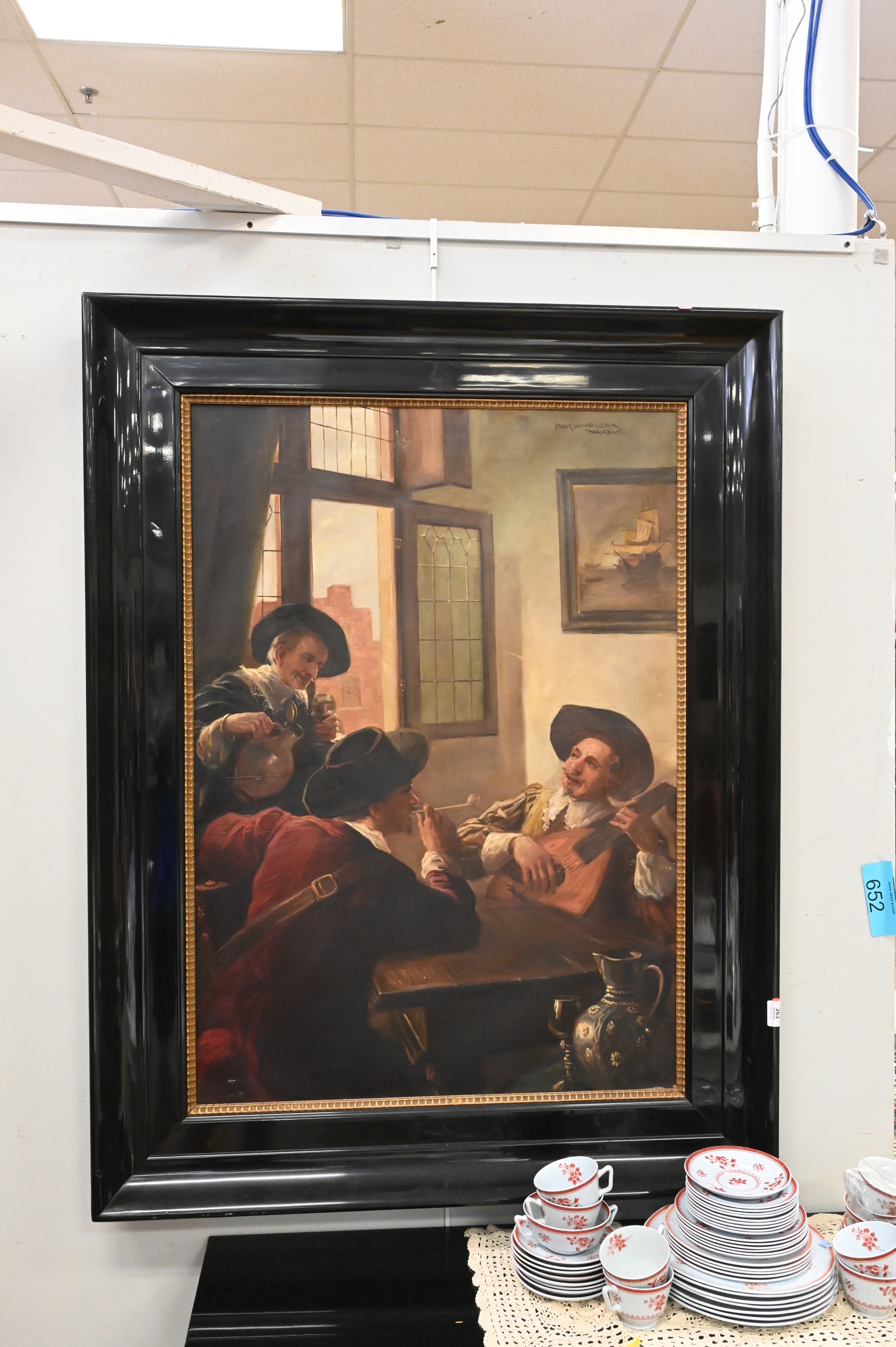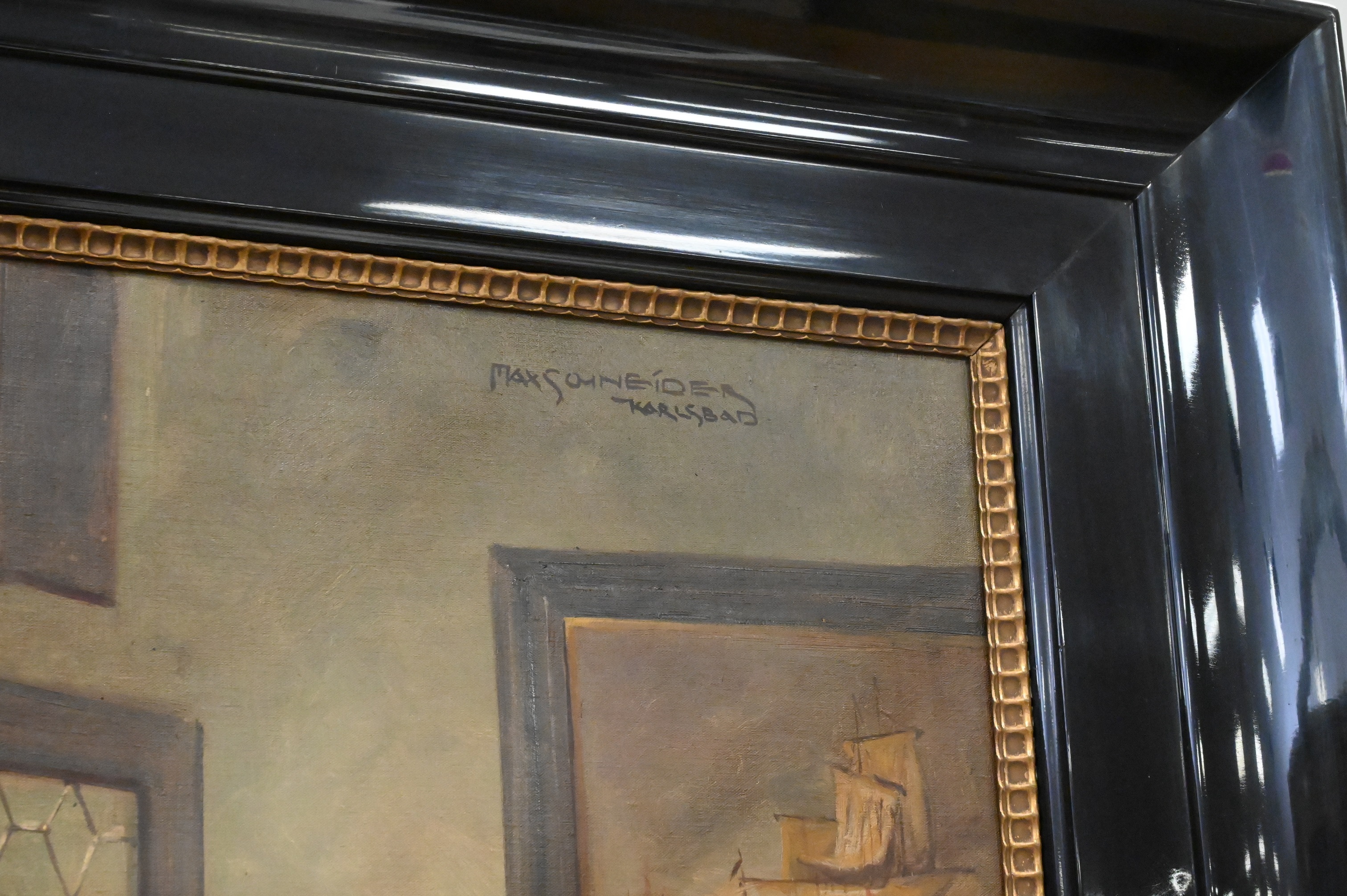 Max Schneider German 1903 – 1980 “3 Men Sitting at Tavern Sable” Oil on Canvas signature upper right lacquer frame 40″ x 29″