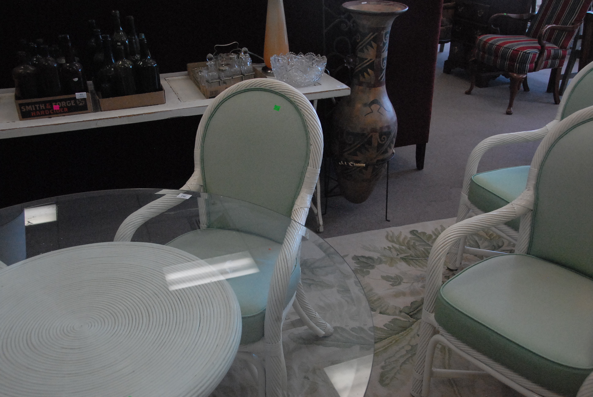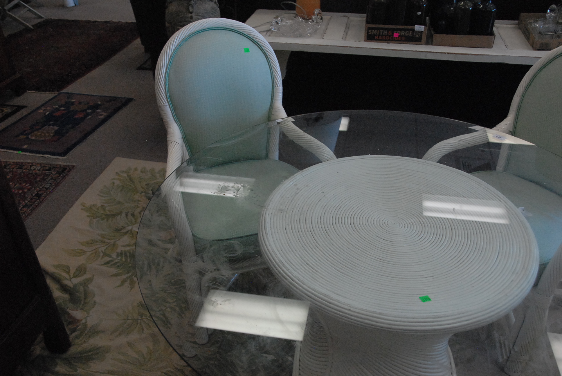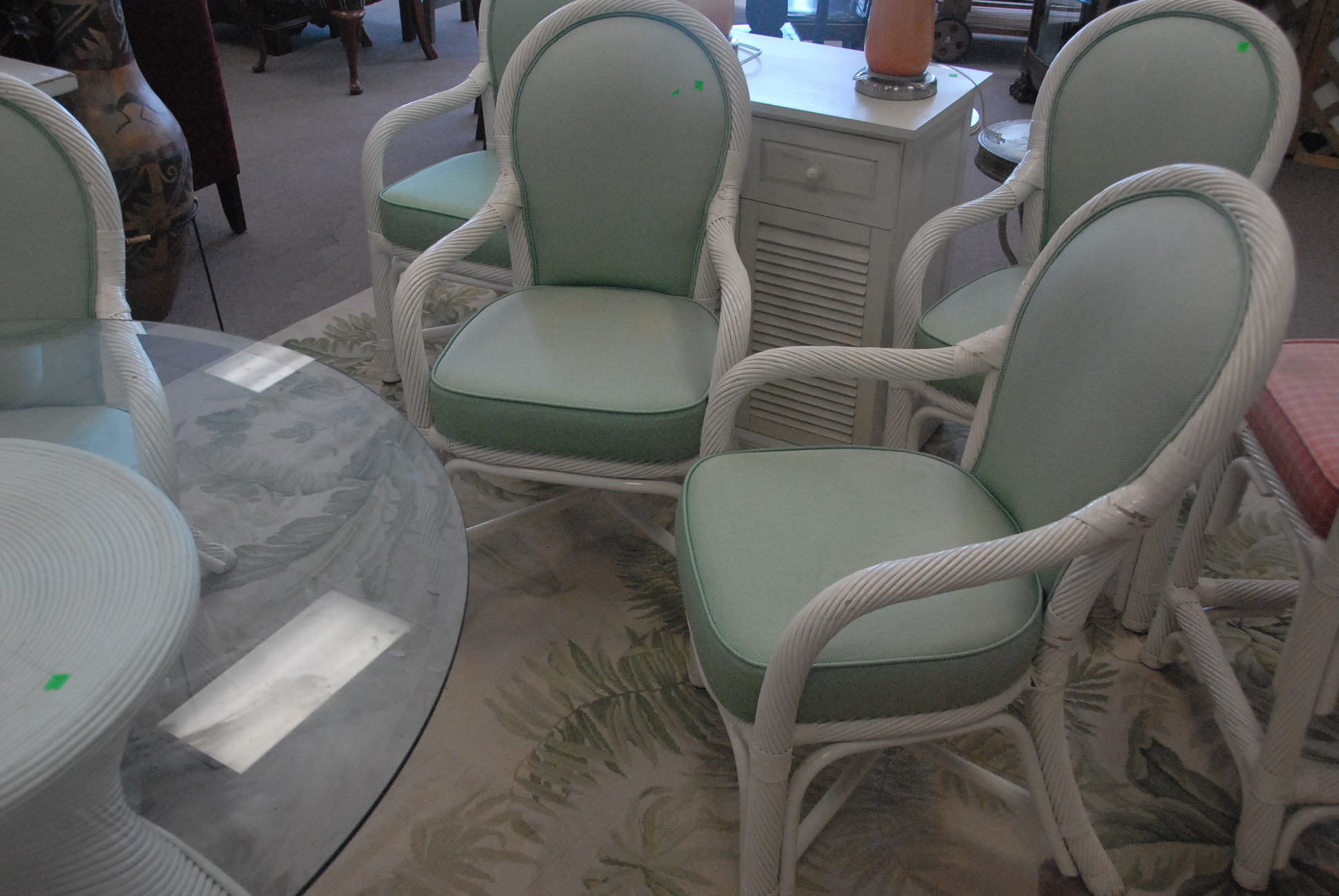 Nine piece Contemporary sun porch set with glass top table, six chairs, and two bar stools, ht. 28 1/2in. dia. 48in.