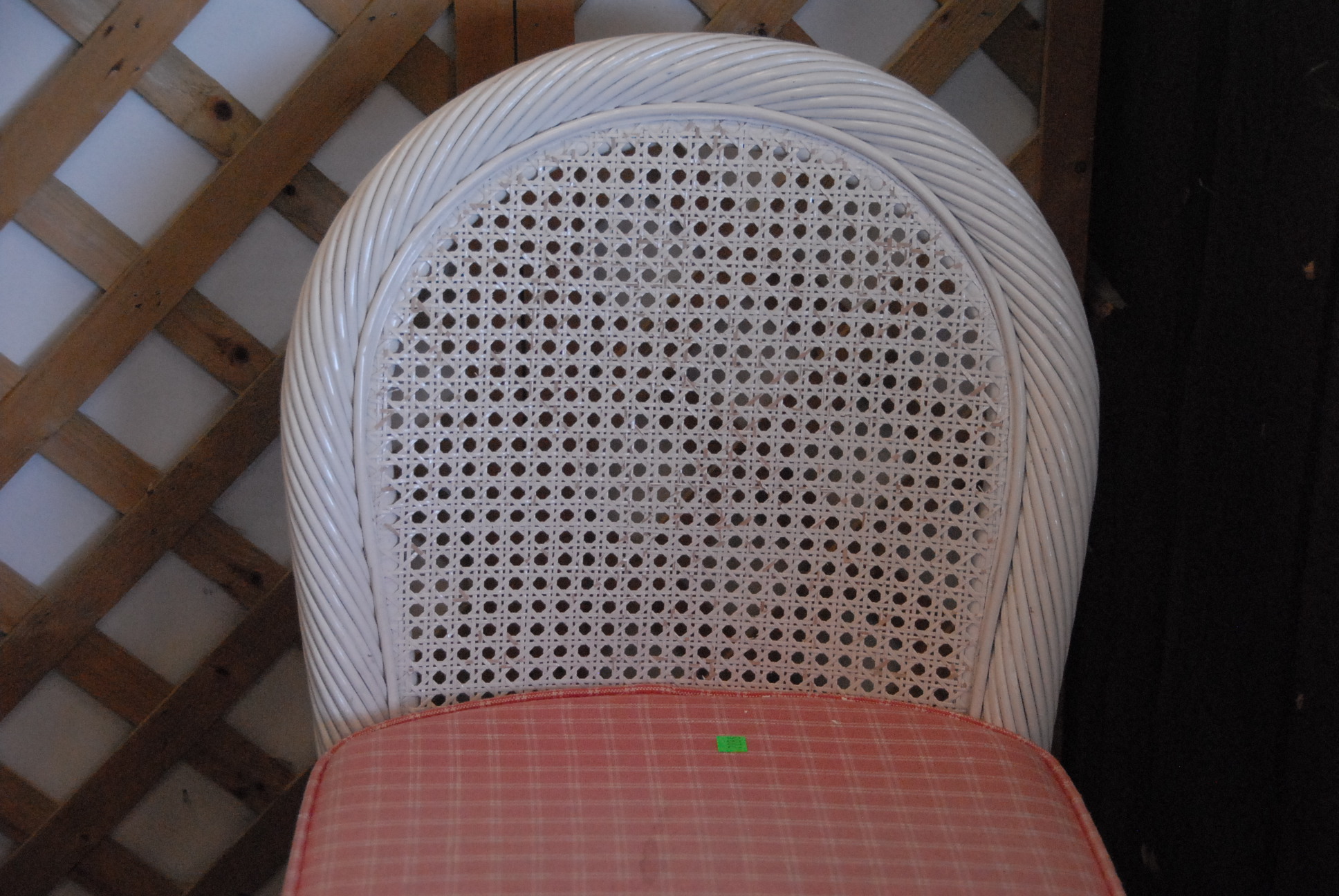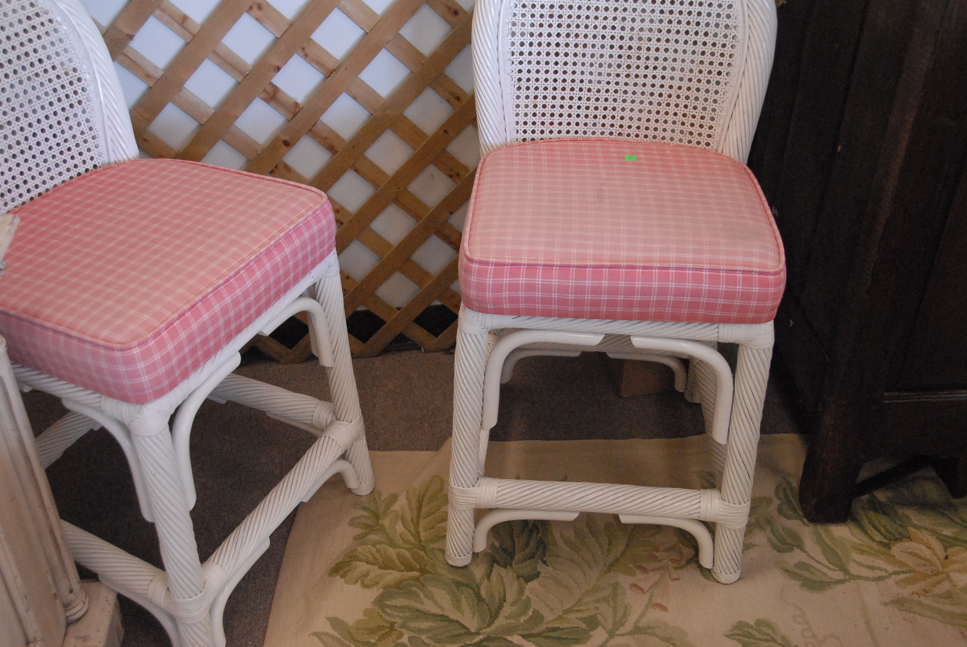 Lot 263: Nine piece Contemporary sun porch set with glass top table, six chairs, and two bar stools, ht. 28 1/2in. dia. 48in.