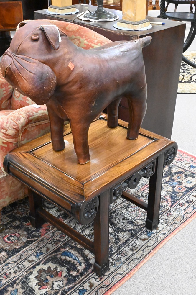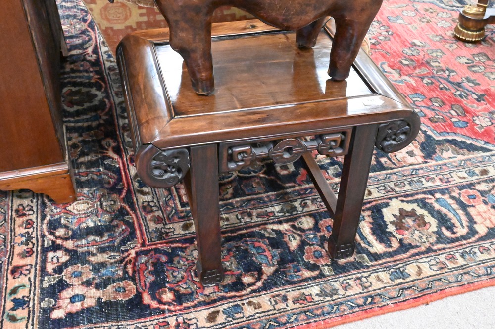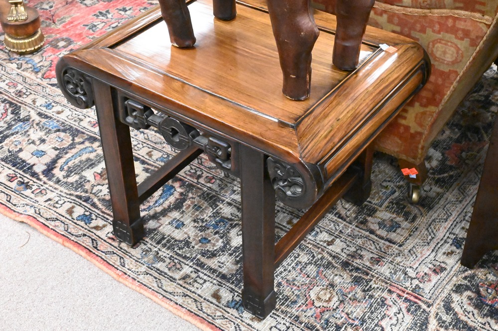 Pair of Carved Chinese Low Side Tables, height 18 inches, top 18″ x 23″.