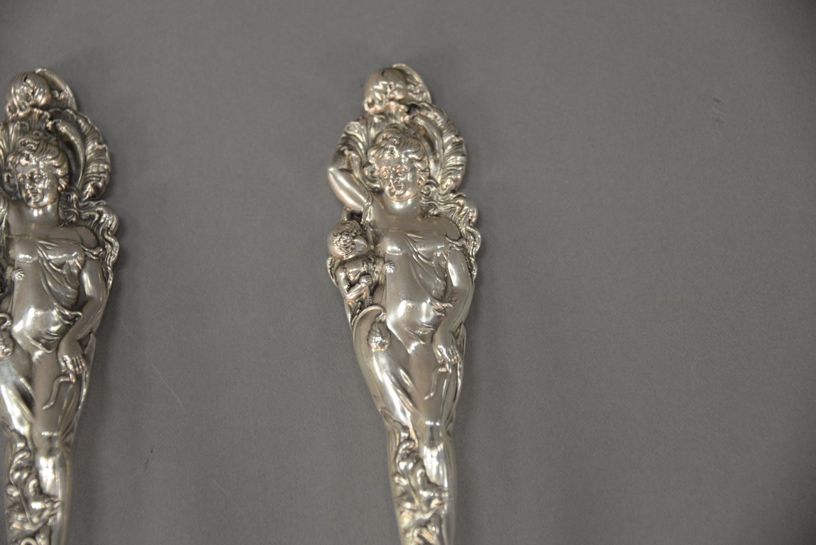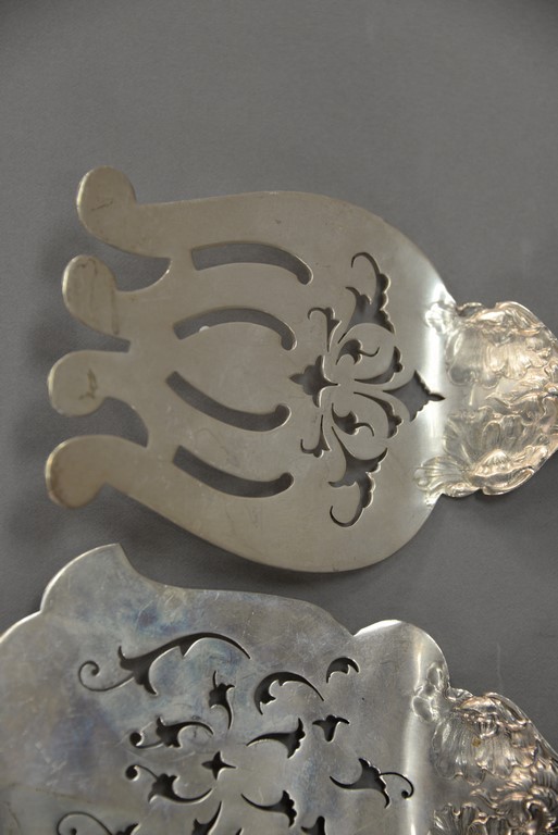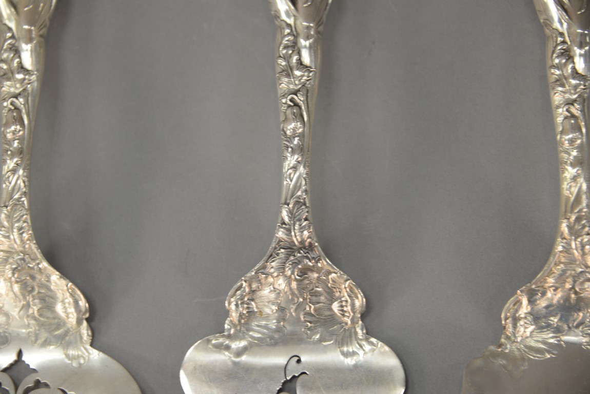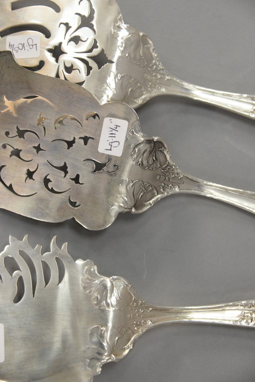 Lot 263: Reed & Barton Love Disarmed three sterling silver pieces including a waffle server lg. 11 1/4 in., asparagus server lg. 10 3/4 in., and macaroni server, lg. 11 1/4 in. 22.3 t oz.