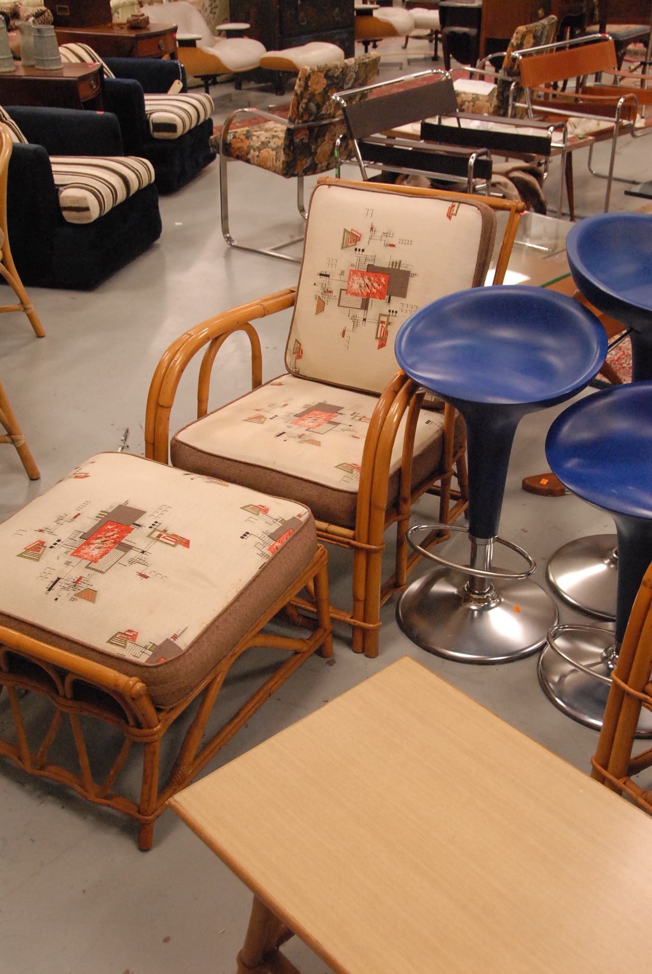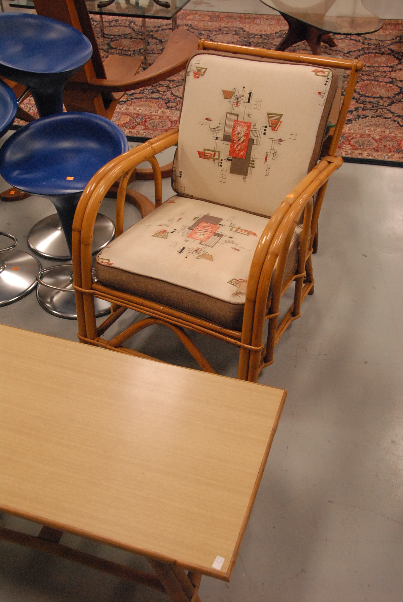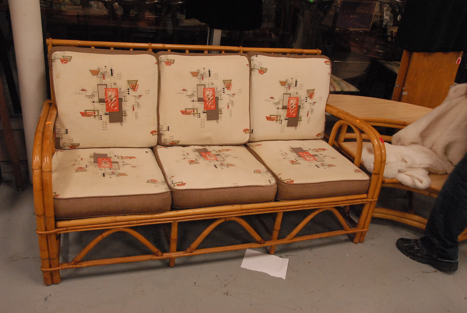 Lot 263: Six piece rattan lot to include sofa, two armchairs, footstools, coffee table, and half round two tier corner table.