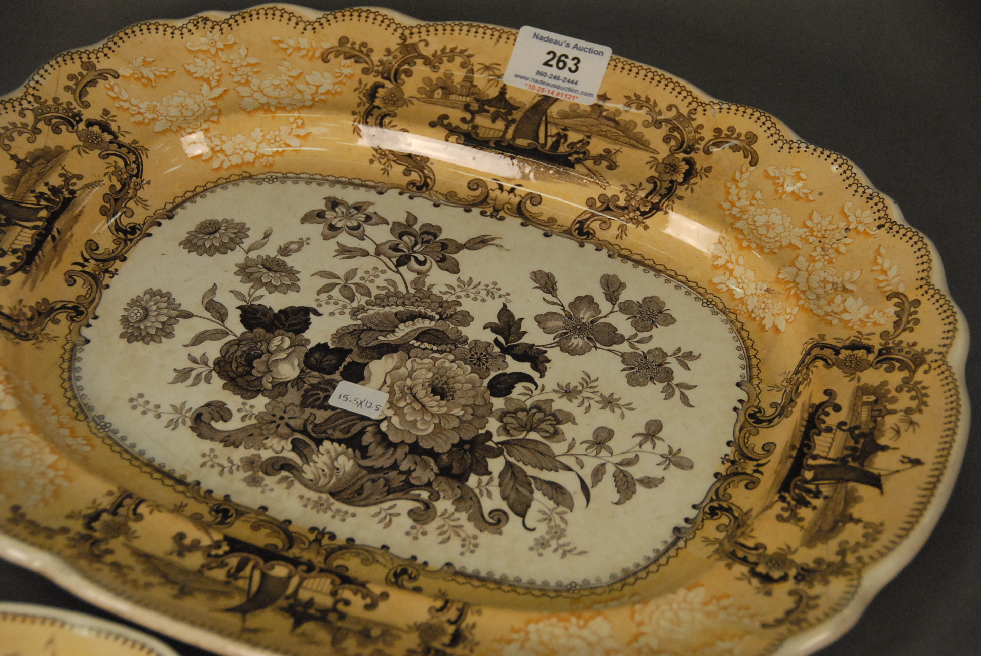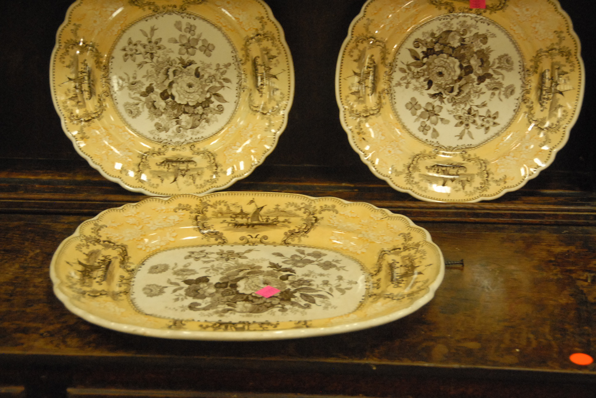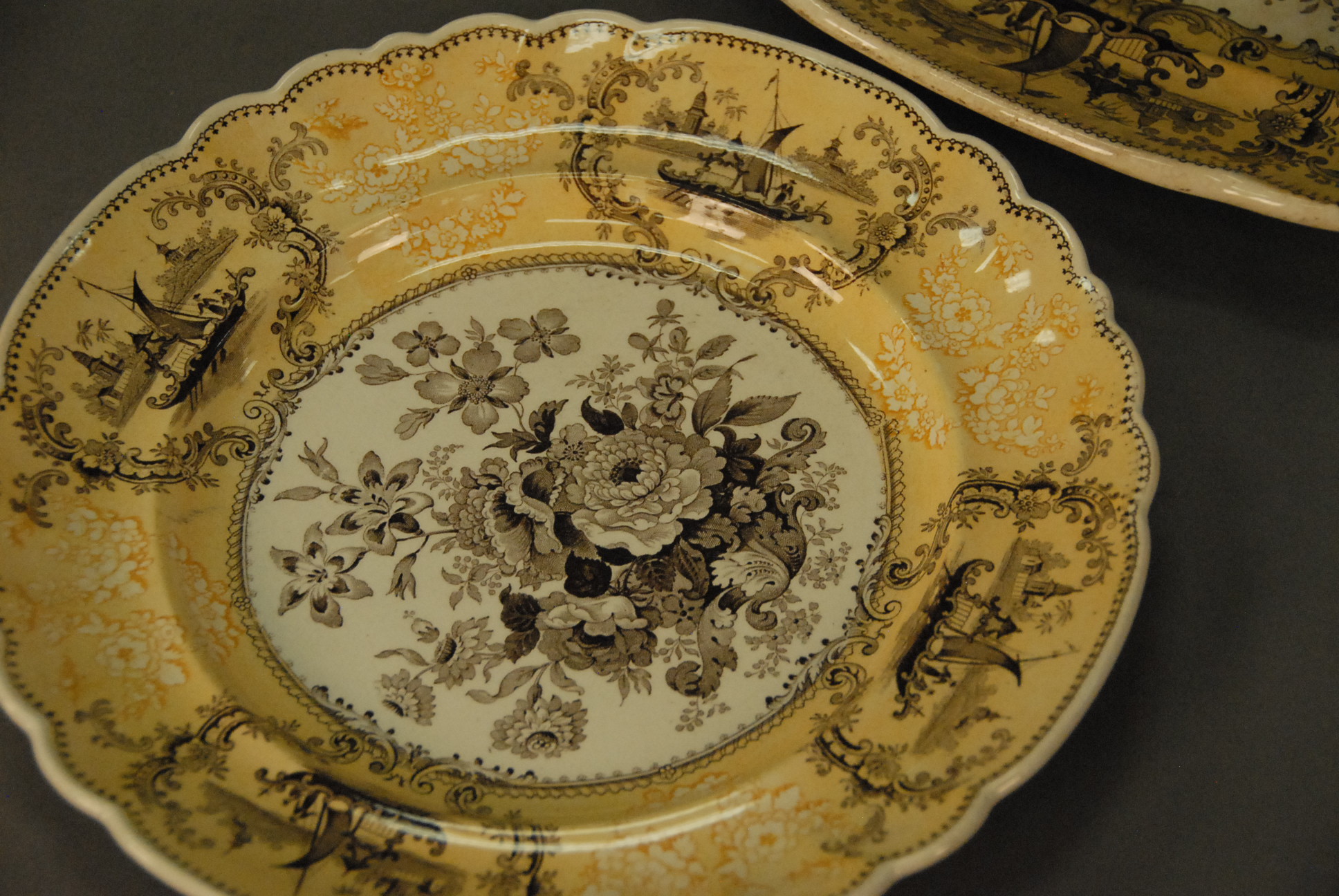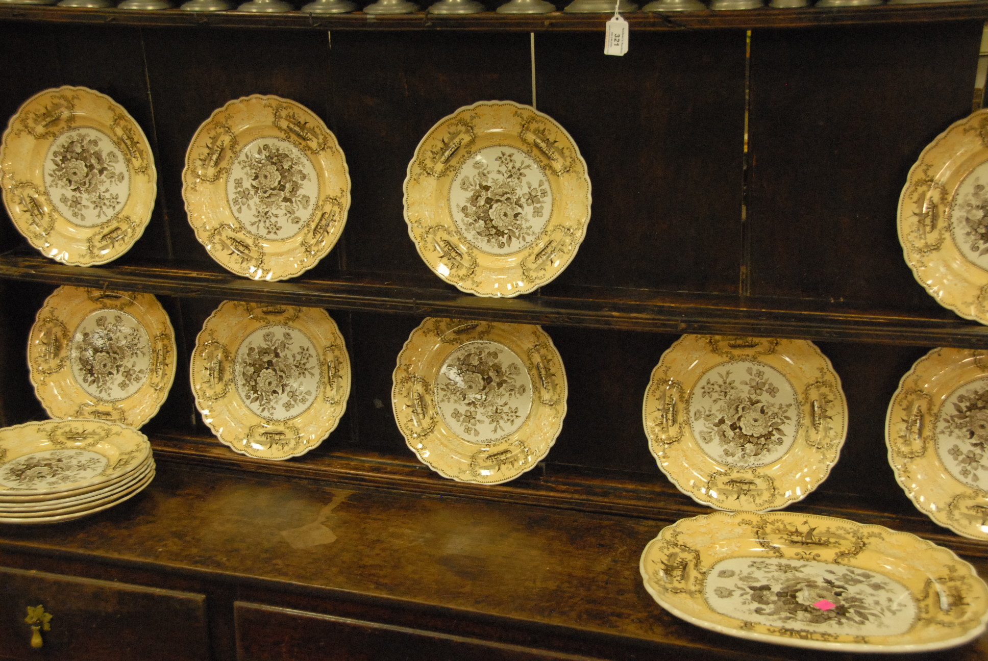 Lot 263: Staffordshire eighteen piece set including sixteen plates and two platters, brown, white, and yellow Shiraz, Shiraz Jr. platters: lg. 15 in. plates: dia. 10 1/2 in.