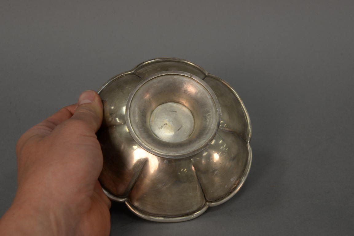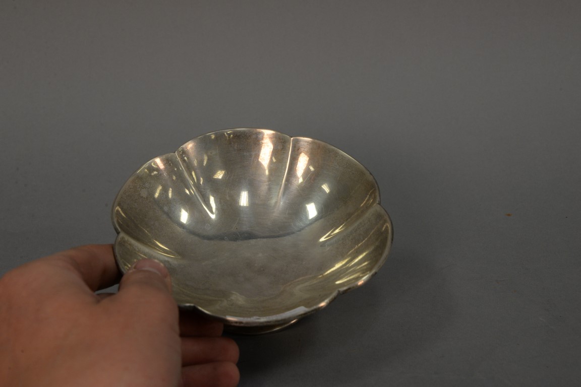 Lot 263: Sterling silver shaped and footed dish marked handmade with monogrammed initials. ht. 2in., dia. 5 1/2in., 8.13 toz.