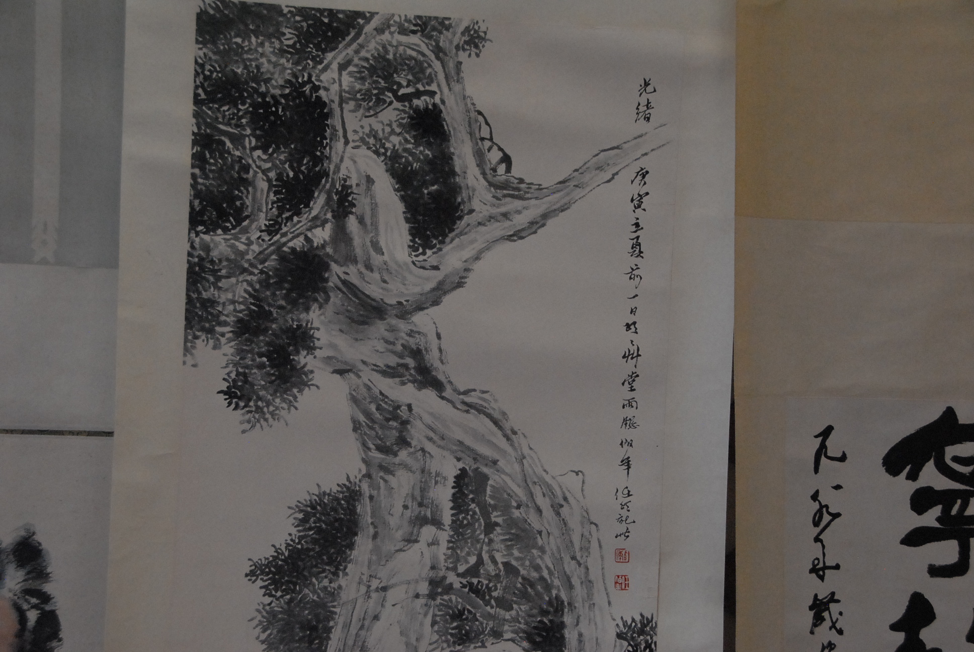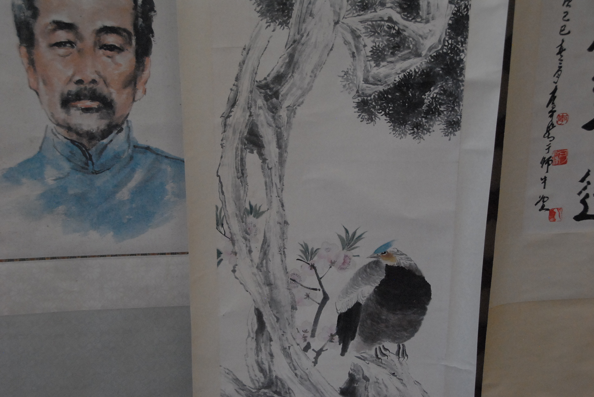 Three Oriental scrolls watercolor bust of man 27 x 17, watercolor bird under tree 70 x 19, and watercolor of characters 27 x 18.