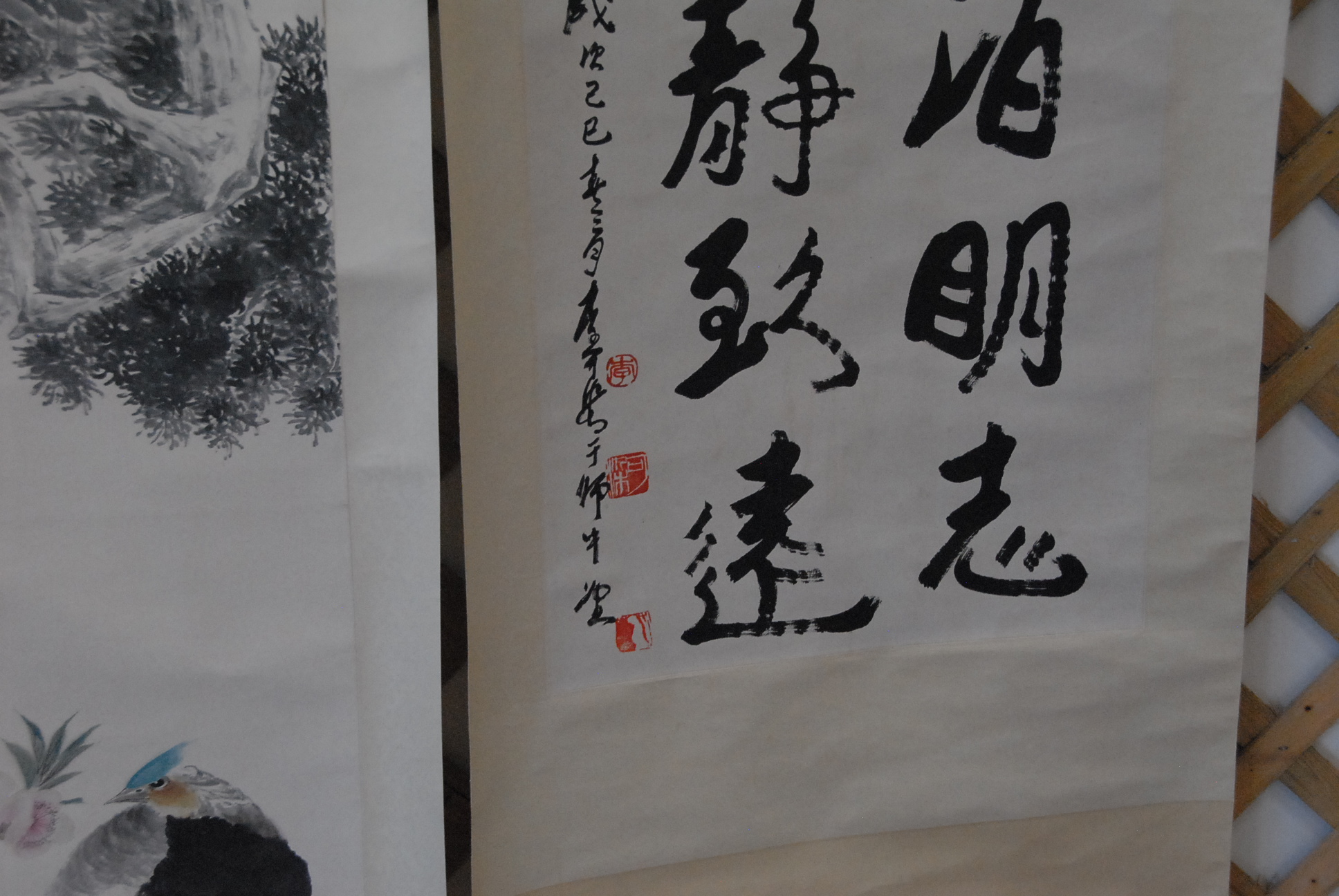 Lot 263: Three Oriental scrolls watercolor bust of man 27 x 17, watercolor bird under tree 70 x 19, and watercolor of characters 27 x 18.