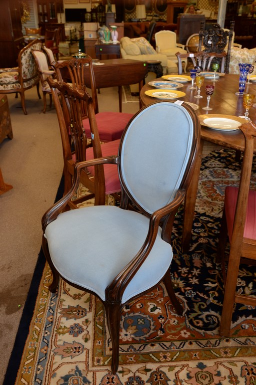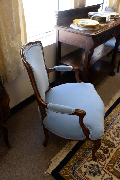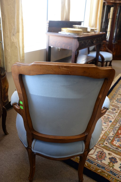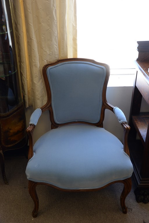 Two Louis XV style armchairs with blue upholstery in excellent condition.