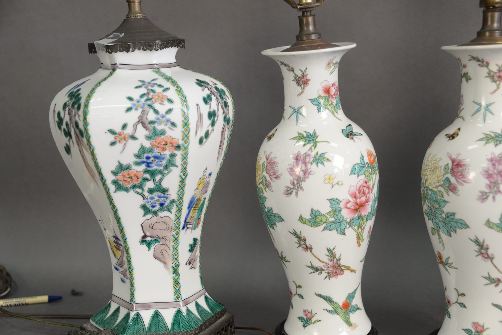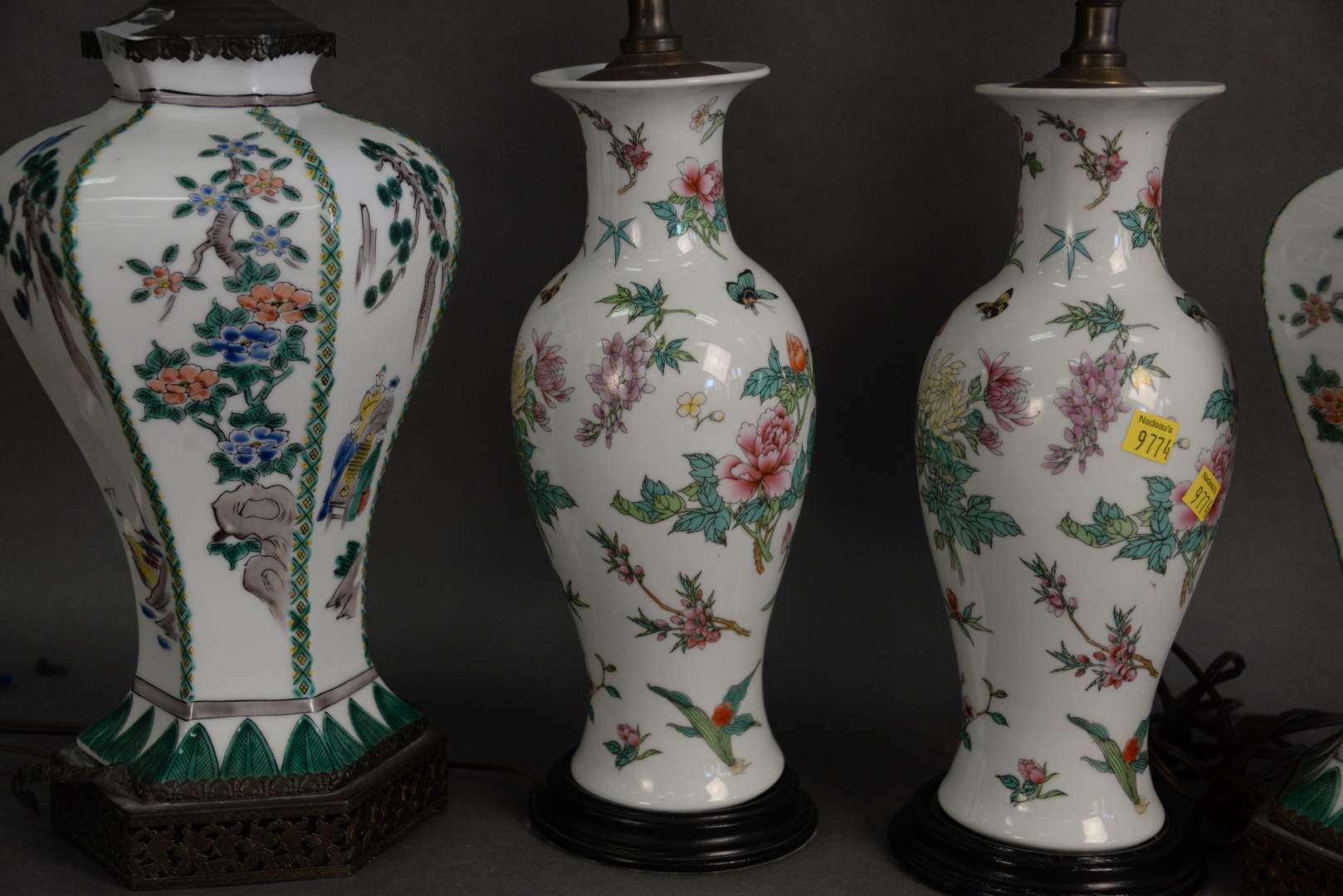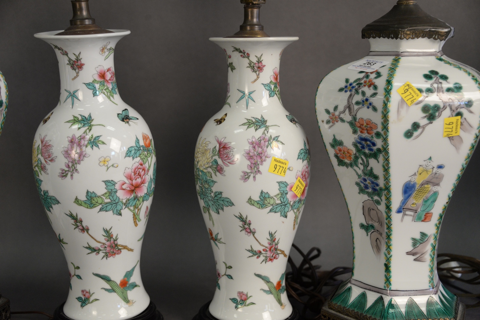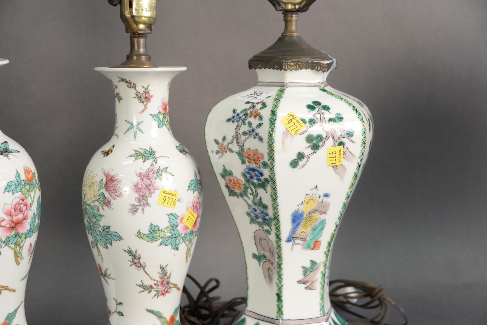 Lot 263: Two Pairs of Chinese Porcelain Lamps to include Chinese Export style in baluster form along with a hexagon famille verte, overall height 27 inches.