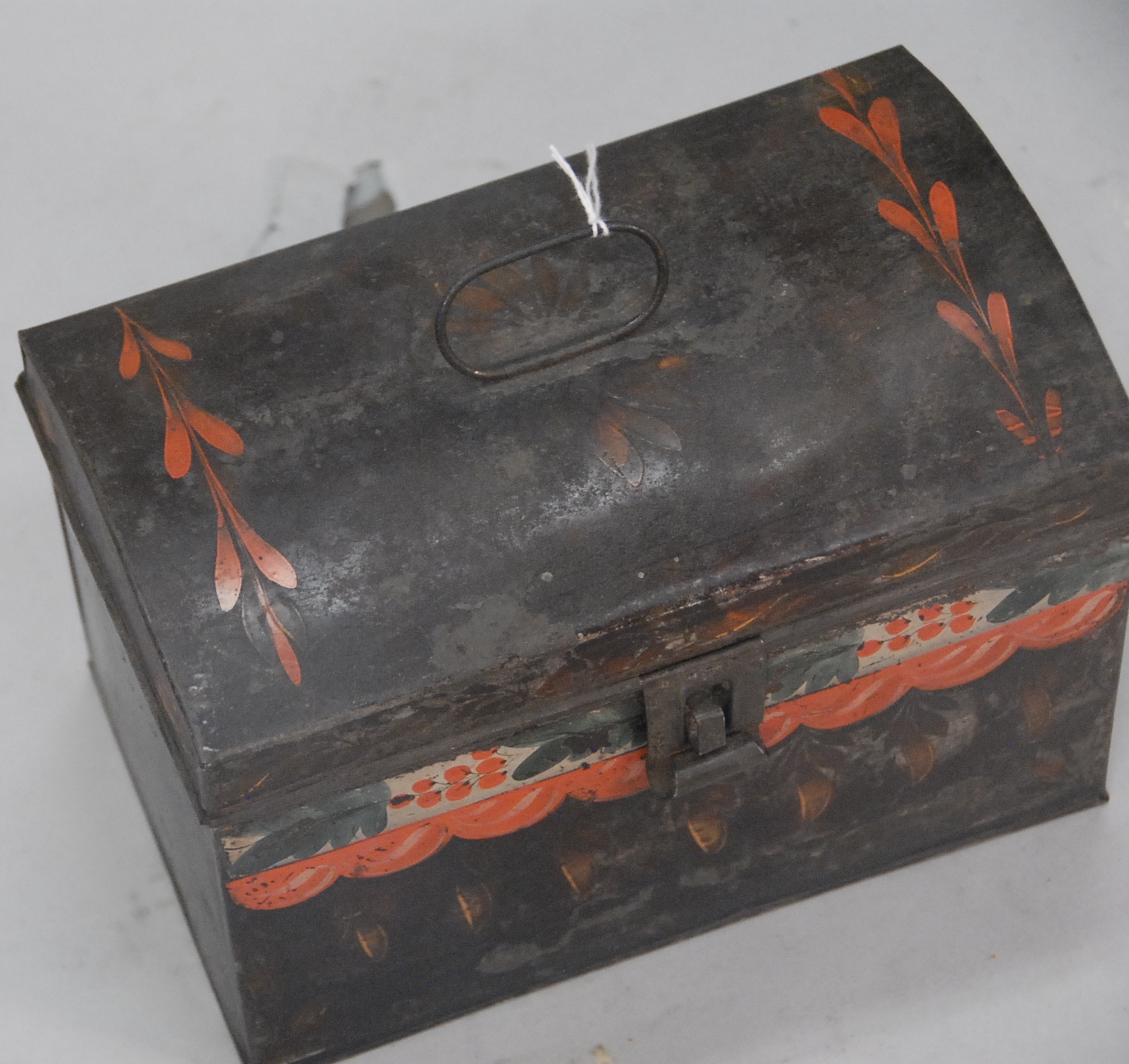 Tole box with dome top in original paint decoration. ht. 6 1/2in., wd. 9 1/2in.