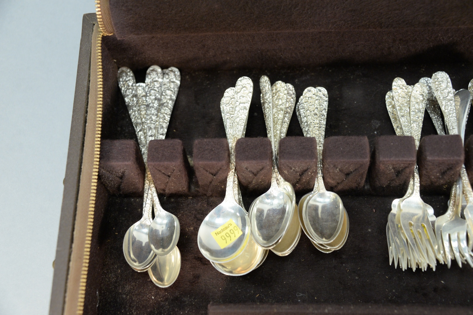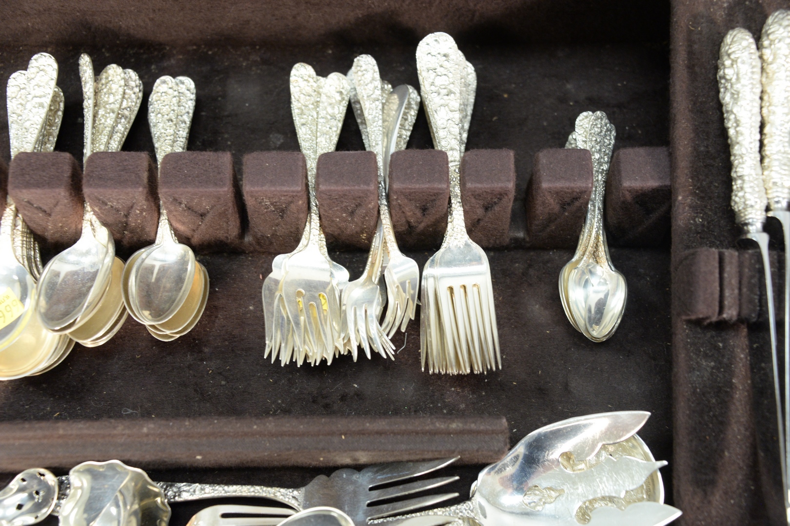 to include 6 iced tea spoons, 10 soup spoons, 18 teaspoons, 12 demitasse spoons, 9 salad forks, 10 dinner forks, 8 cocktail forks, 10 dinner knives, 10 butter knives, 15 serving pieces