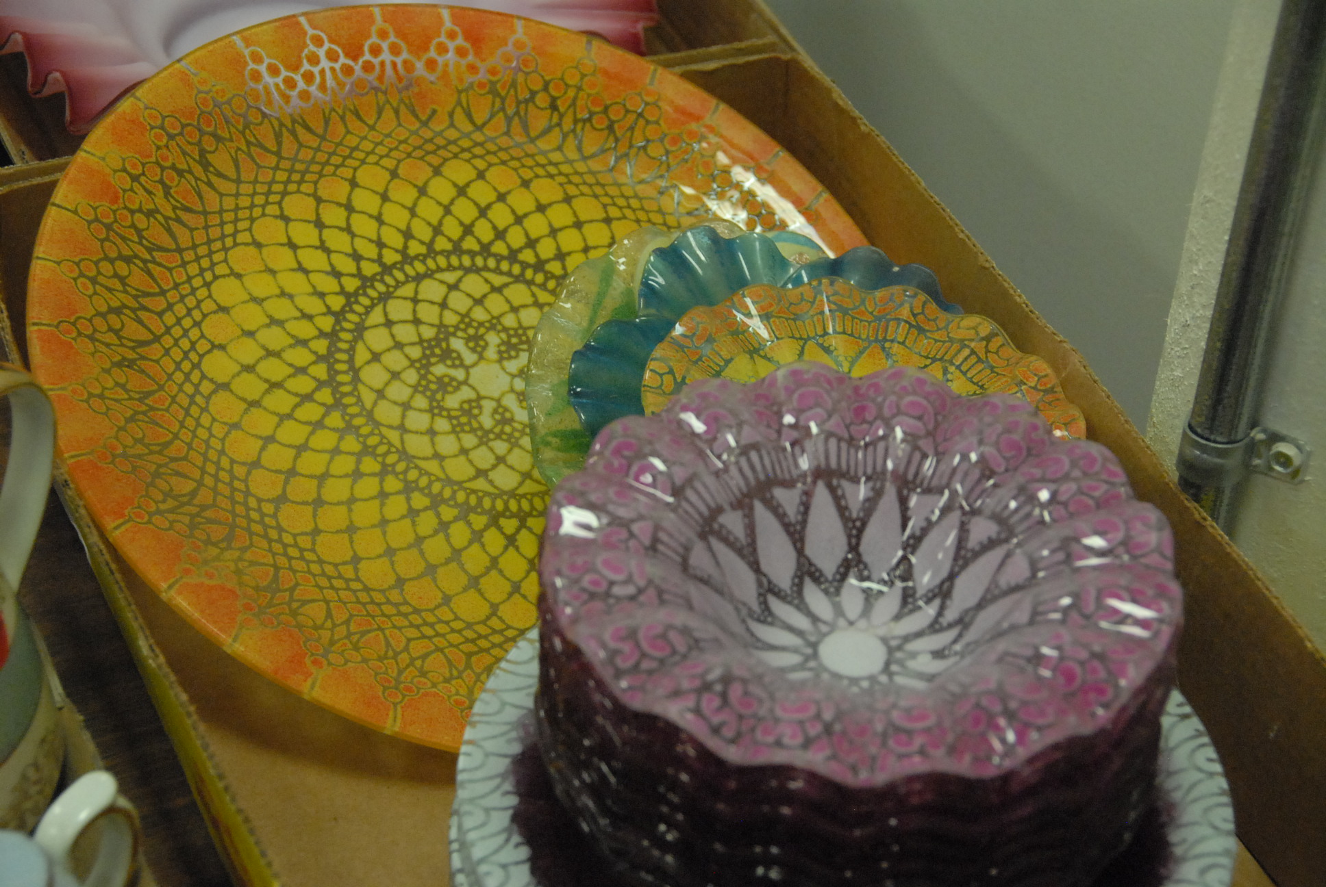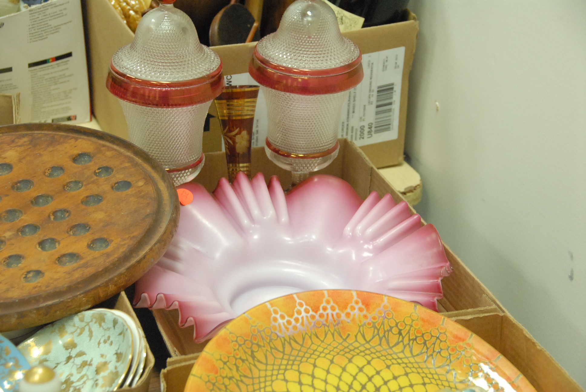 6 box lots to include artglass, bowls, plates, pair of Ruby decanters, cups and saucers etc.