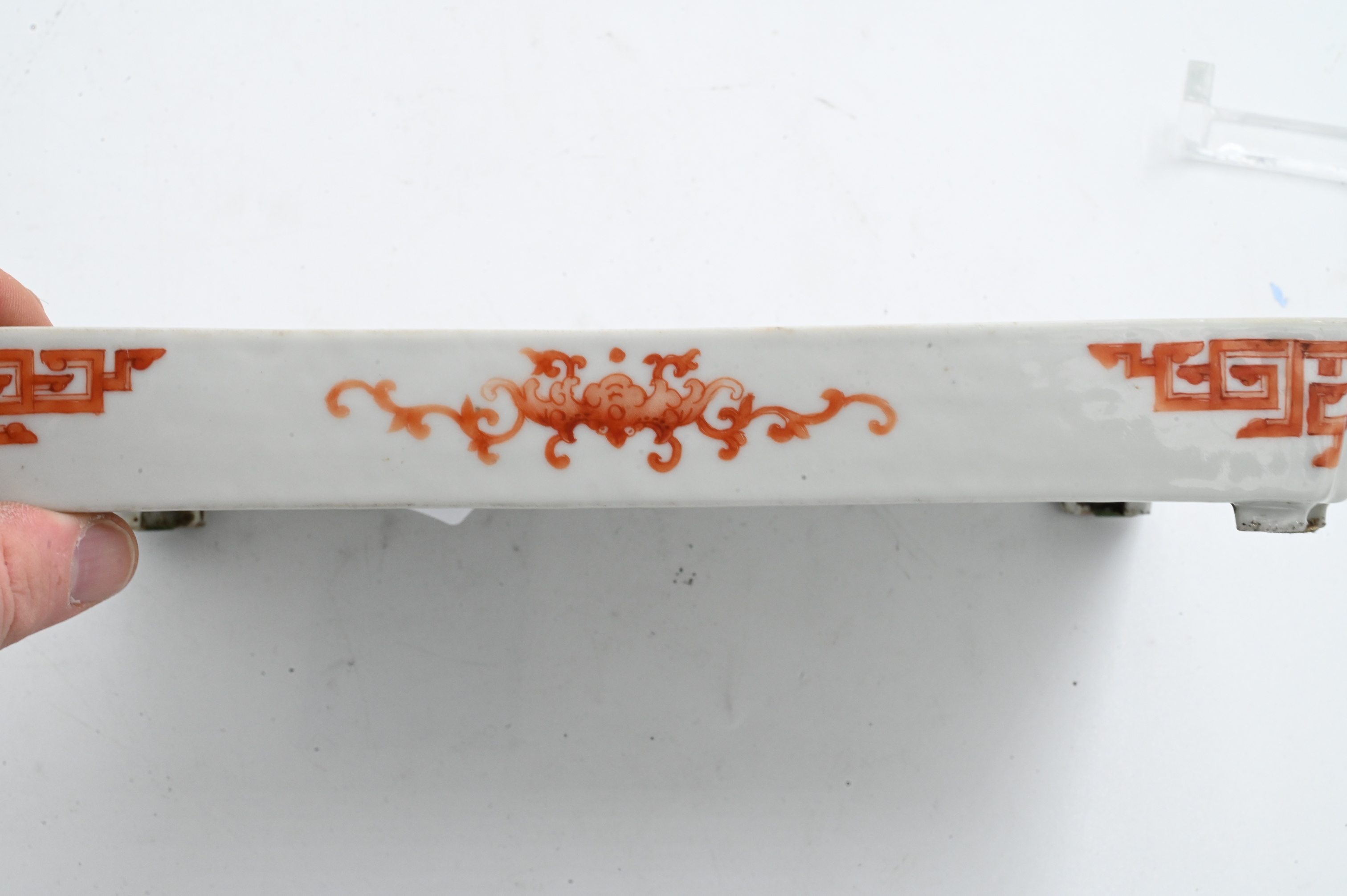 of rectangular form raised on four shaped feet, center depicting two Geishas, one woman with fan, the other bowing beside a potted plant on a bench bordered by butterfly and flower motif, exterior geometric design in iron red