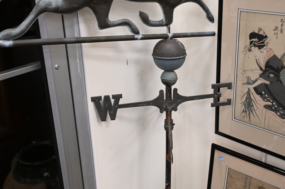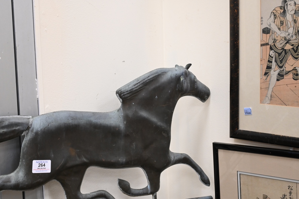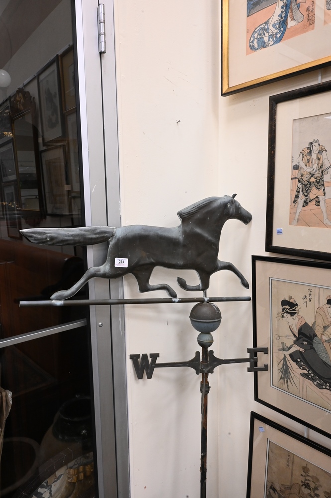 Copper Running Horse Weathervane, having directionals, height 61 inches, width 36 inches.