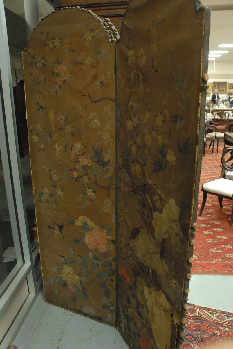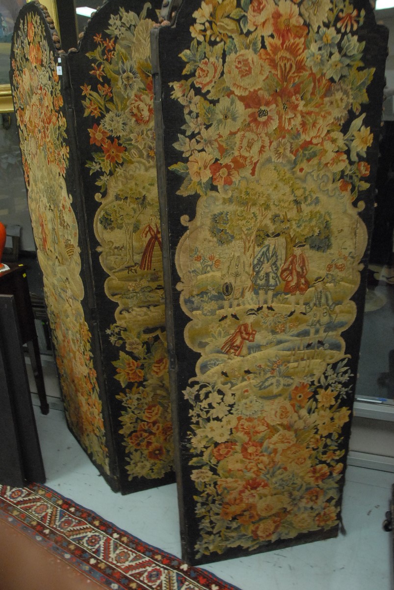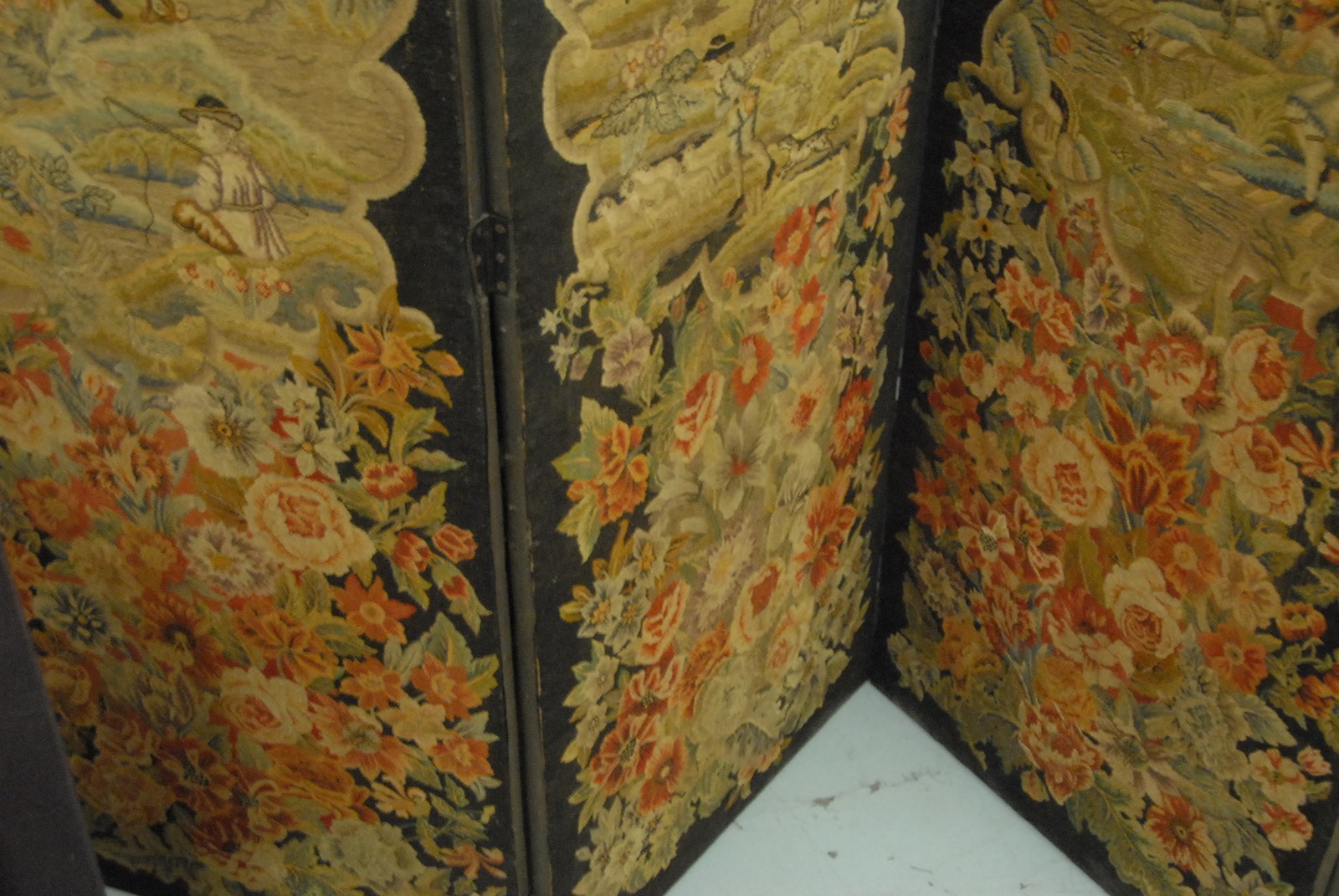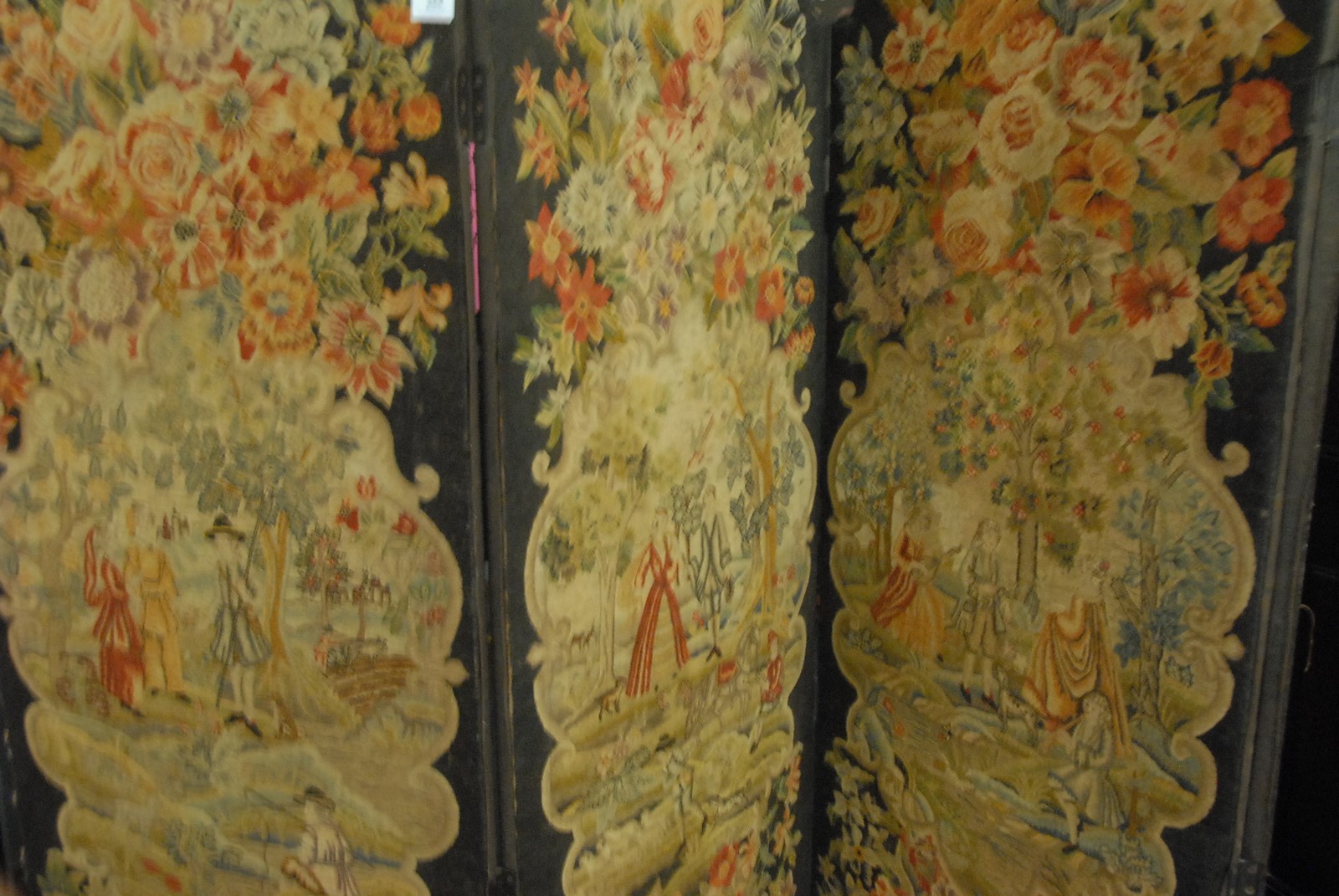 Lot 264: Four panel dressing screen, each panel with pettipoint, including romantic and fishing scenes having adults, children, sheep, horse, dogs, buildings, and flowers, reverse with hand painted paper, 19th century one panel with some damage. ht. 78 in.