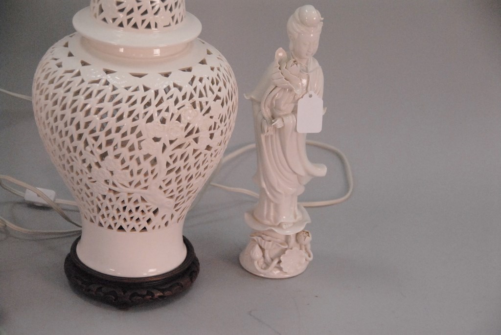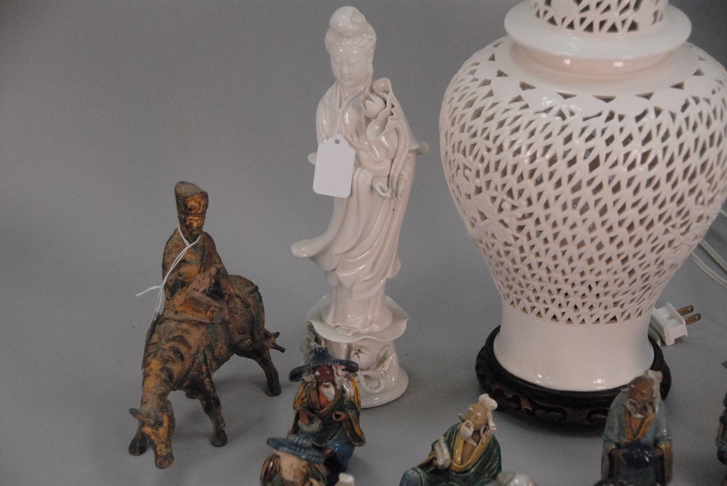 Lot 264: Group of Asian items to include mud figures, pair of white glazed Guanyin figures, pair of lamps, and bronze figure on a horse.