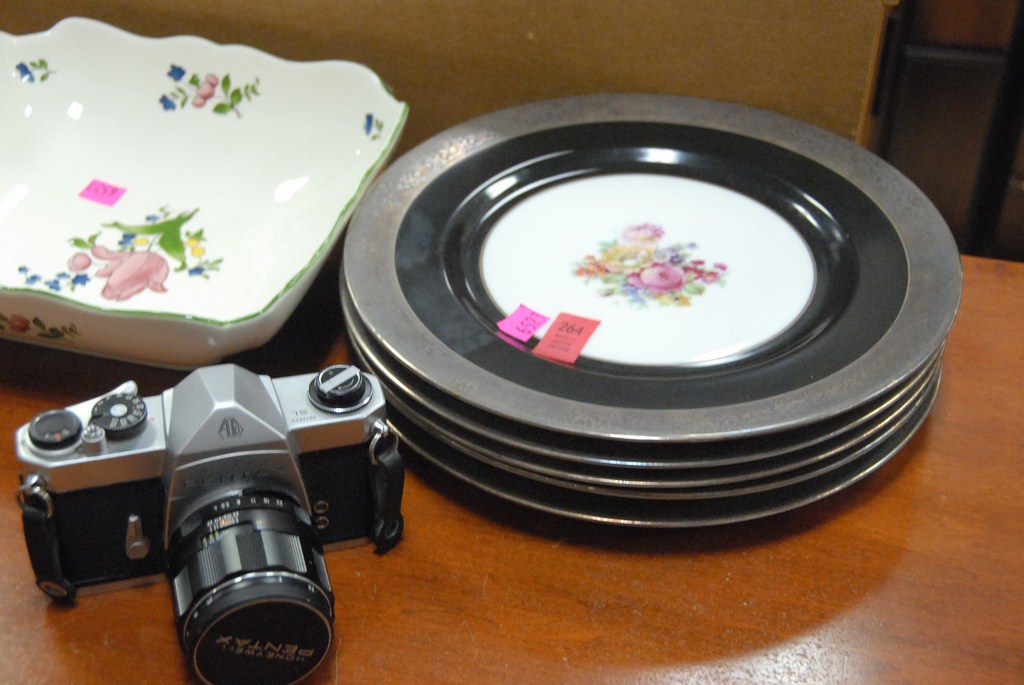 Group of china Glen Frans plates, Pentax camera, and set of Bavarian plates.