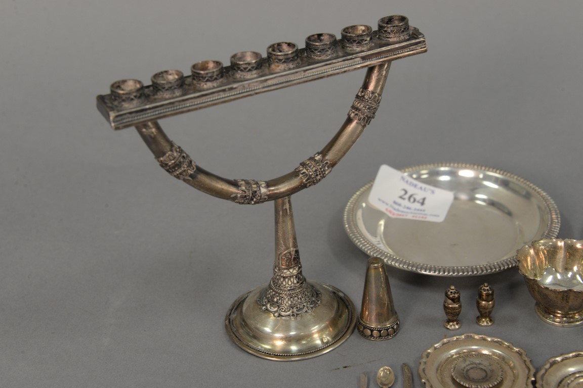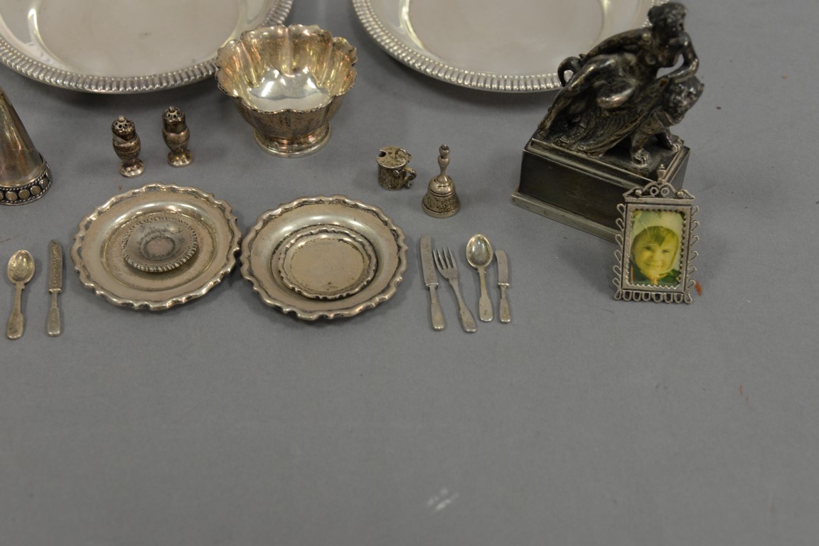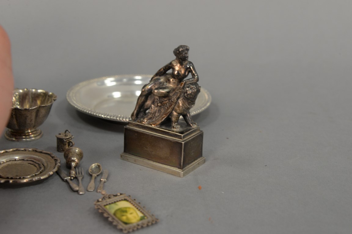 Group of silver and sterling to include miniature bowls, tray, plates, flatware, salt and pepper, silver figure seated on lion marked 800, and small minora ht. 4 3/4in., 9.8 t oz