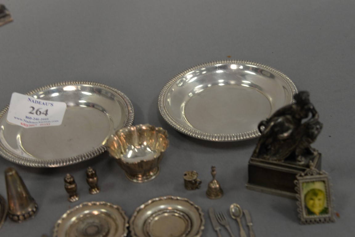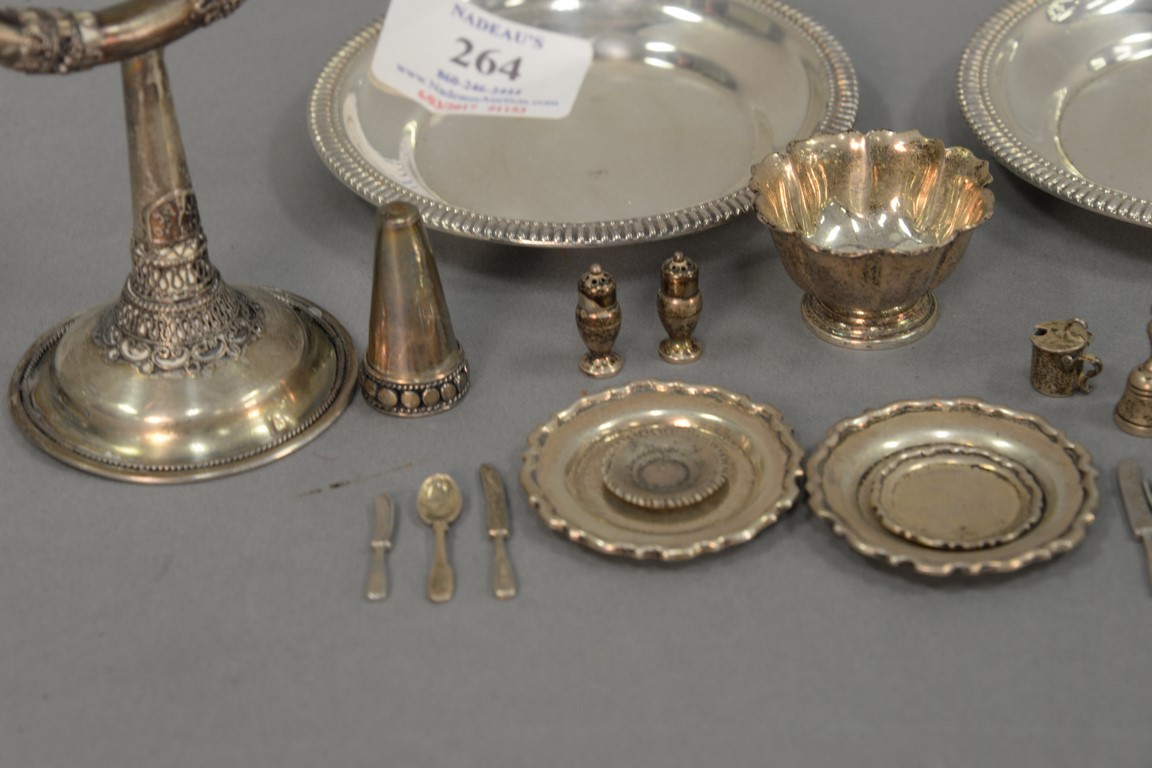Lot 264: Group of silver and sterling to include miniature bowls, tray, plates, flatware, salt and pepper, silver figure seated on lion marke…