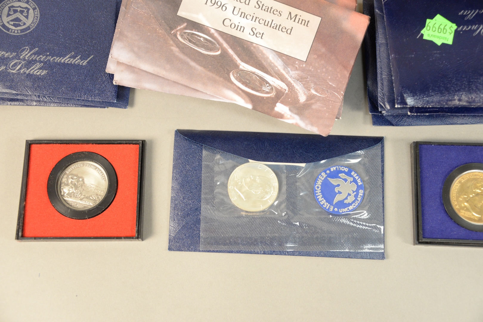 Large coin lot to include, 3 – 2003 proof mint quarters 2 – 1999 proof sets 1 – 1983 Olympic proof dollars 1 – 1994 three coin Liberty set 1 – 2 coin world war set 1 – 2001 2 coin buffalo set 1 – 1994 women in military proof coin, 1 – 1999 Dolly Madison coin proof 4 – 2000 uncirculated mint coin sets 1 – 1995 mint set 2 – 3 coin Susan B. Anthony coin sets 6 pewter medals 1 – 1985 mint set 1 – 1989 mint set, 1- 1998 mint set, 4 – 1971 uncirculated Ike dollars 5 – 1972 uncirculated Ike dollars 5 – 1973 uncirculated Ike dollars 2 – 1974 uncirculated Ike dollars 3 – 1996 mint sets 3 2 – 1997 mint sets 3 1 – 1998 mint sets 3.