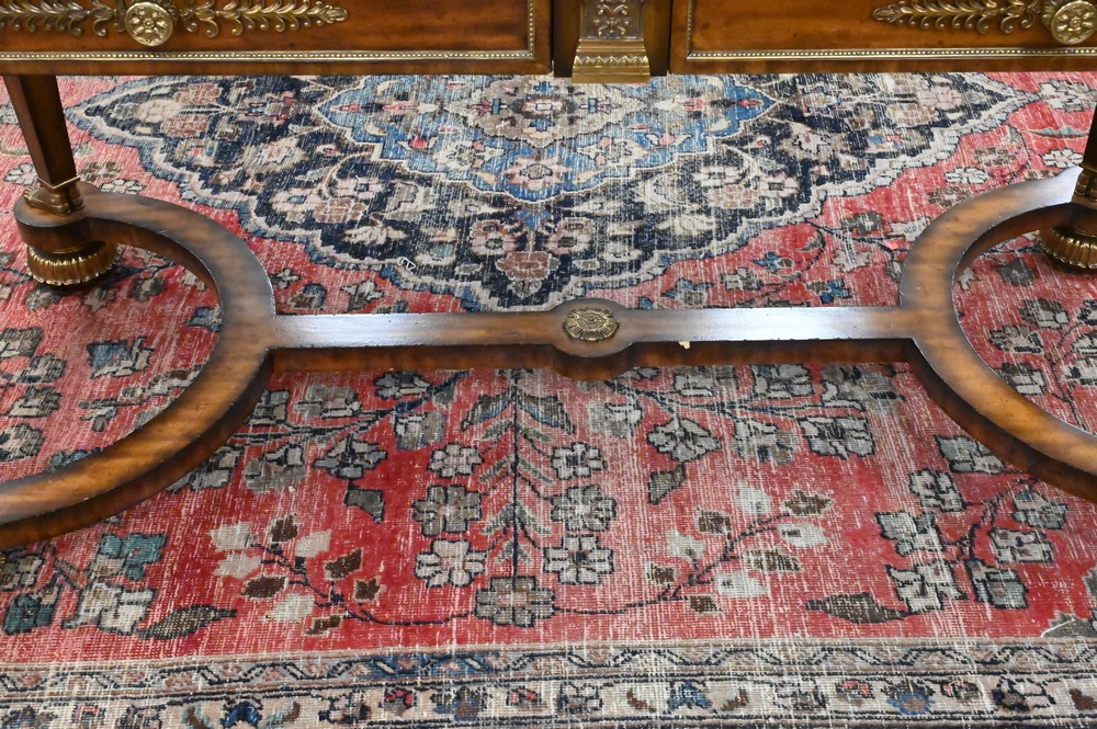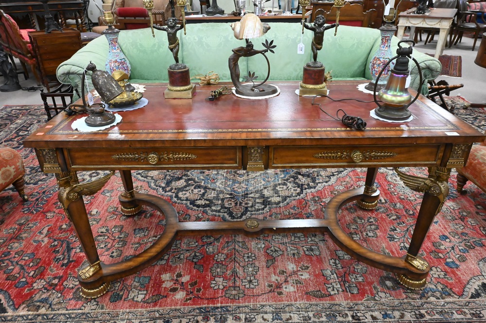 Maitland Smith French Empire Style Writing Table, having leather top and two drawers, height 29 1/2 inches, top 28″ x 60″.
