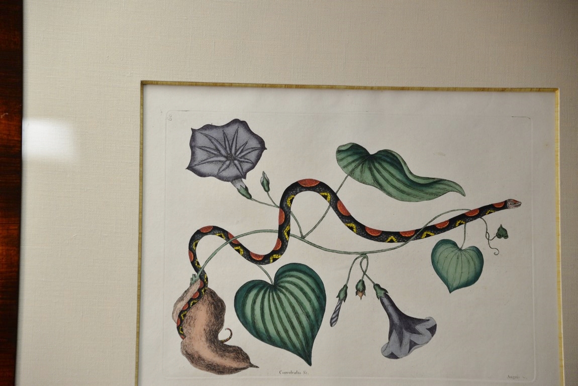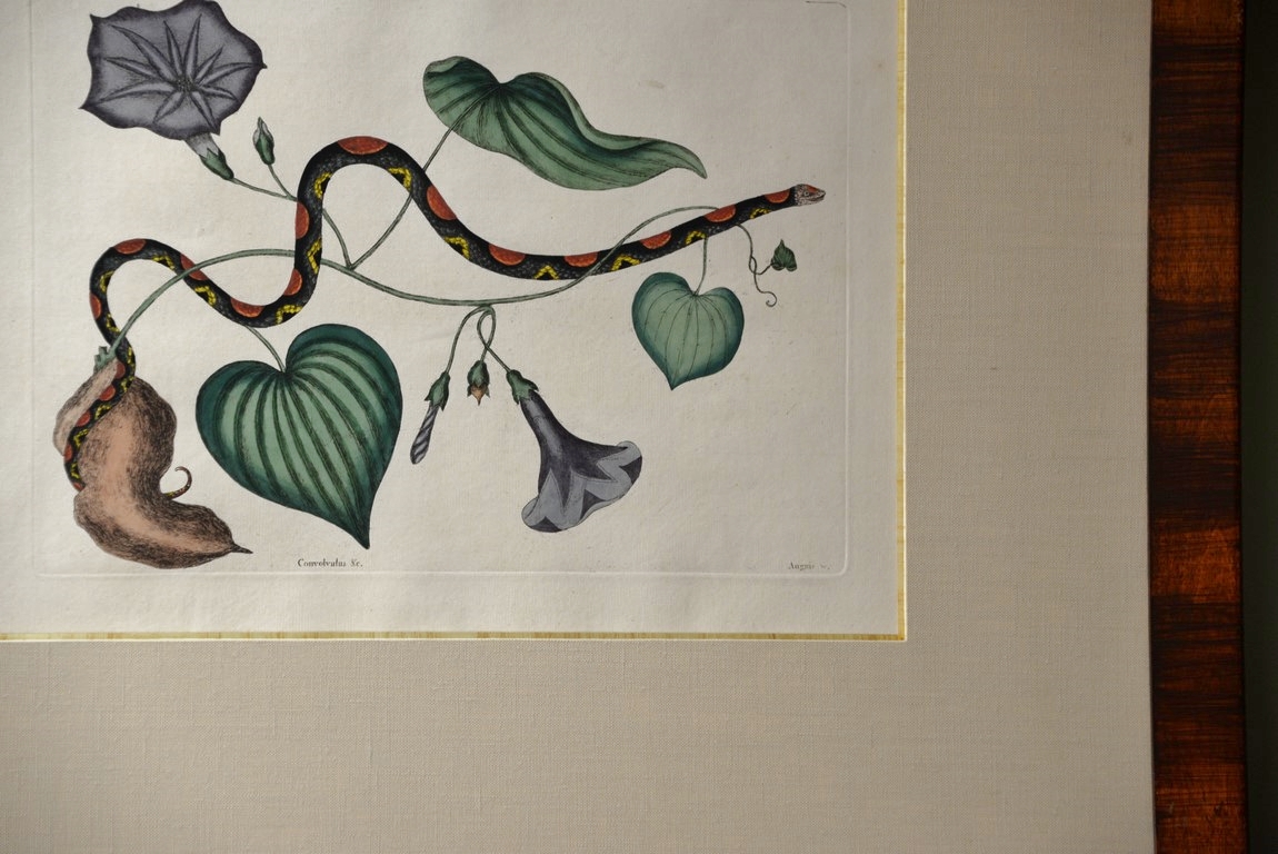 Mark Catesby 1679-1749 pair of hand colored copper plate engravings The Coach-Whip Snake Anguis Flagelli Formis Plate #54 and Convolus Anguis Plate #60 From The Natural History of Carolina, Florida and the Bahama Islands Second Edition London 1754 framed by W. Graham Arader III sight size: 11 1/2 x 15 Provenance: Property from Credit Suisse’s Americana Collection