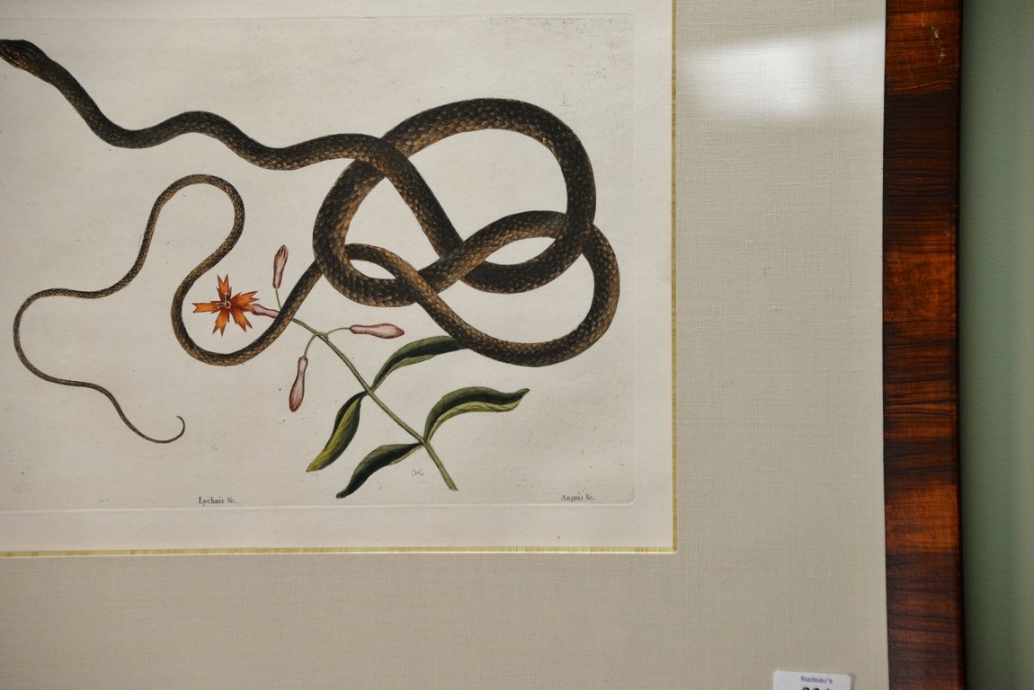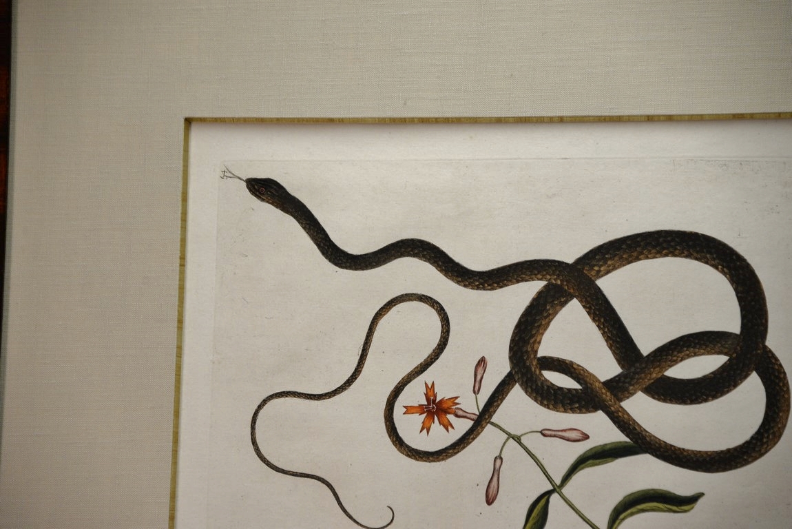 Lot 264: Mark Catesby 1679-1749 pair of hand colored copper plate engravings The Coach-Whip Snake Anguis Flagelli Formis Plate #5…