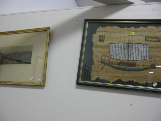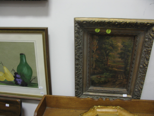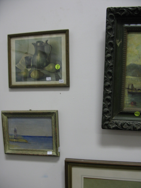Nine piece framed lot including small paintings, two porcelain plaques and Wallace Nutting print.