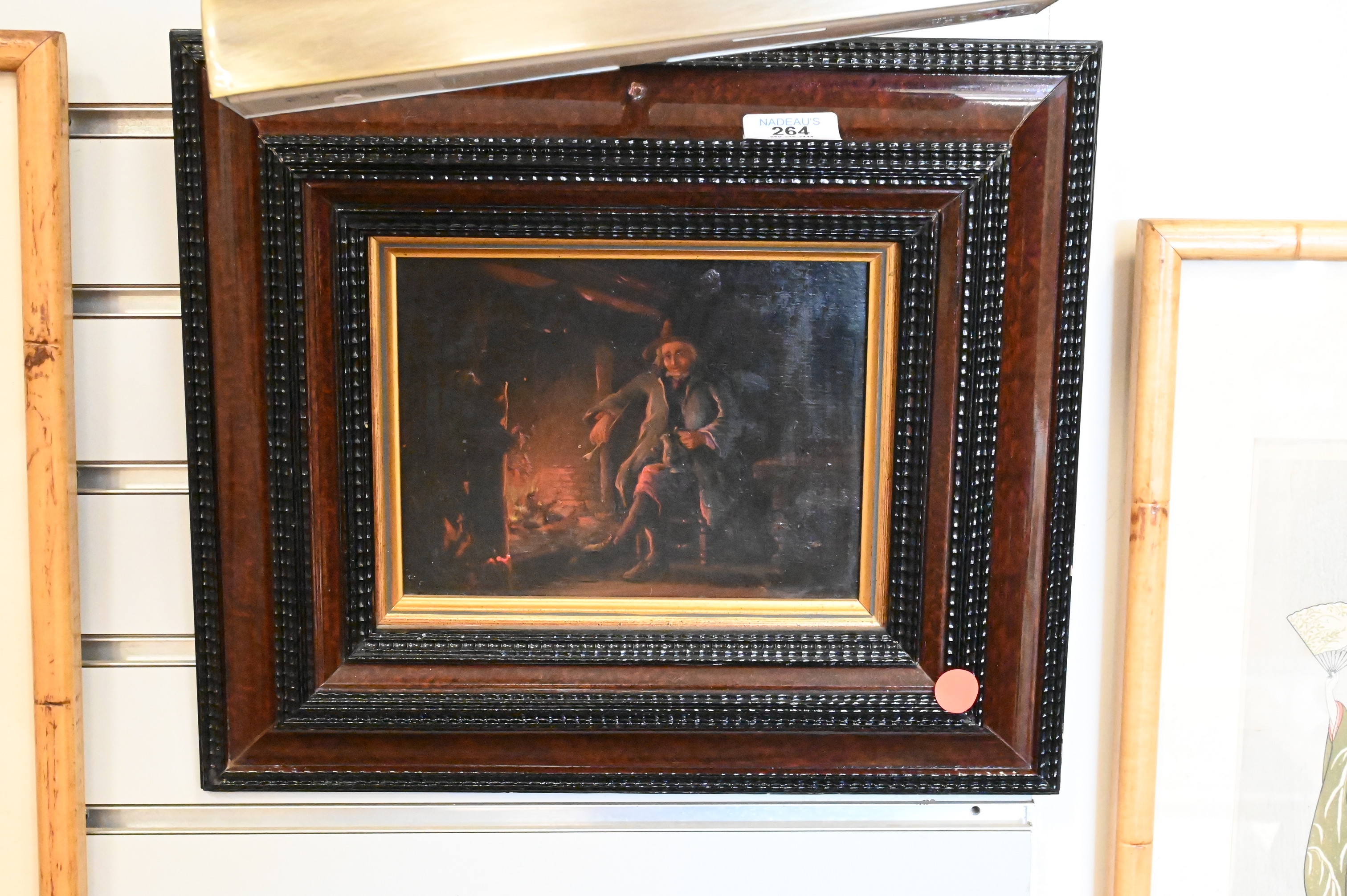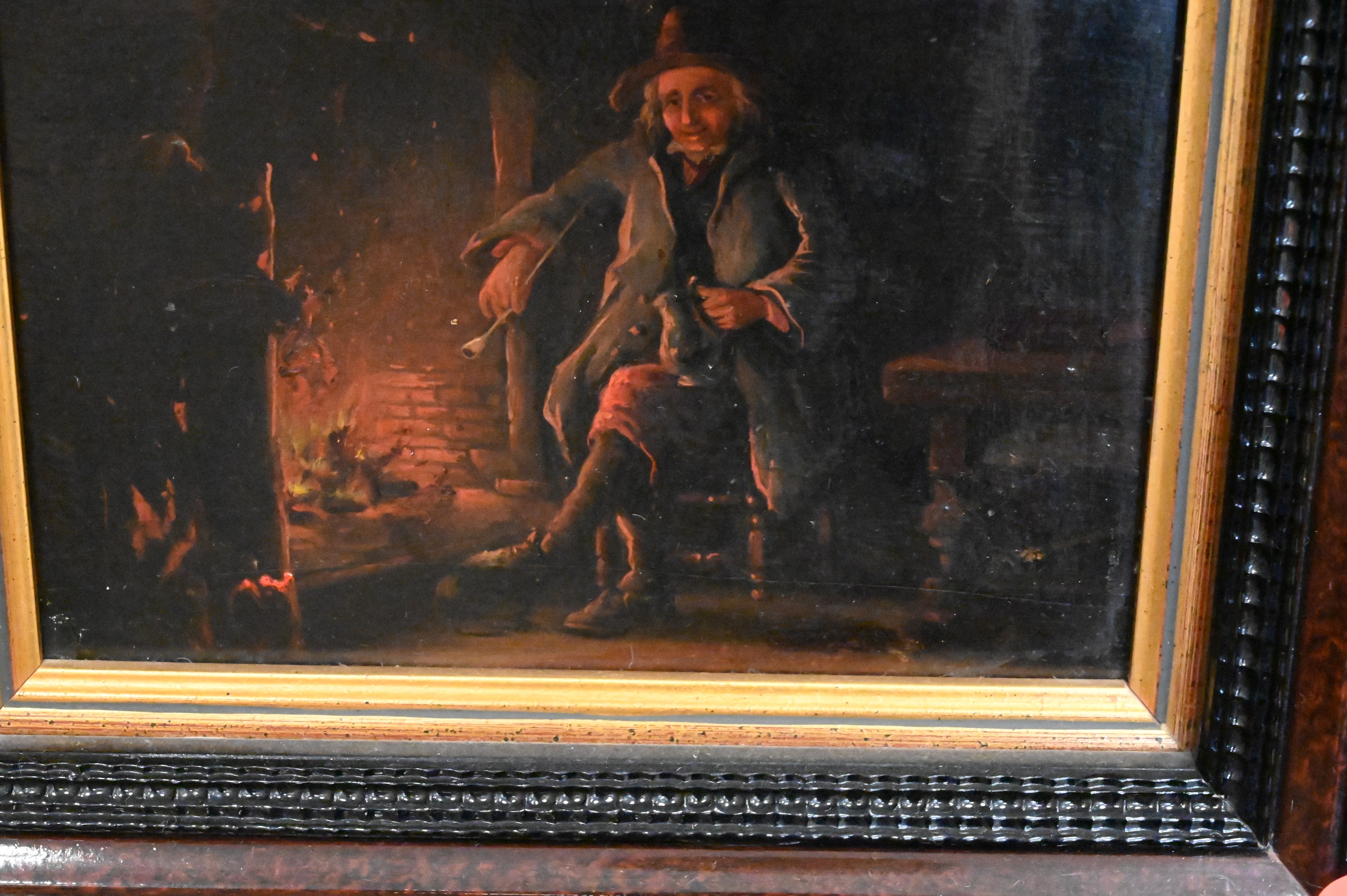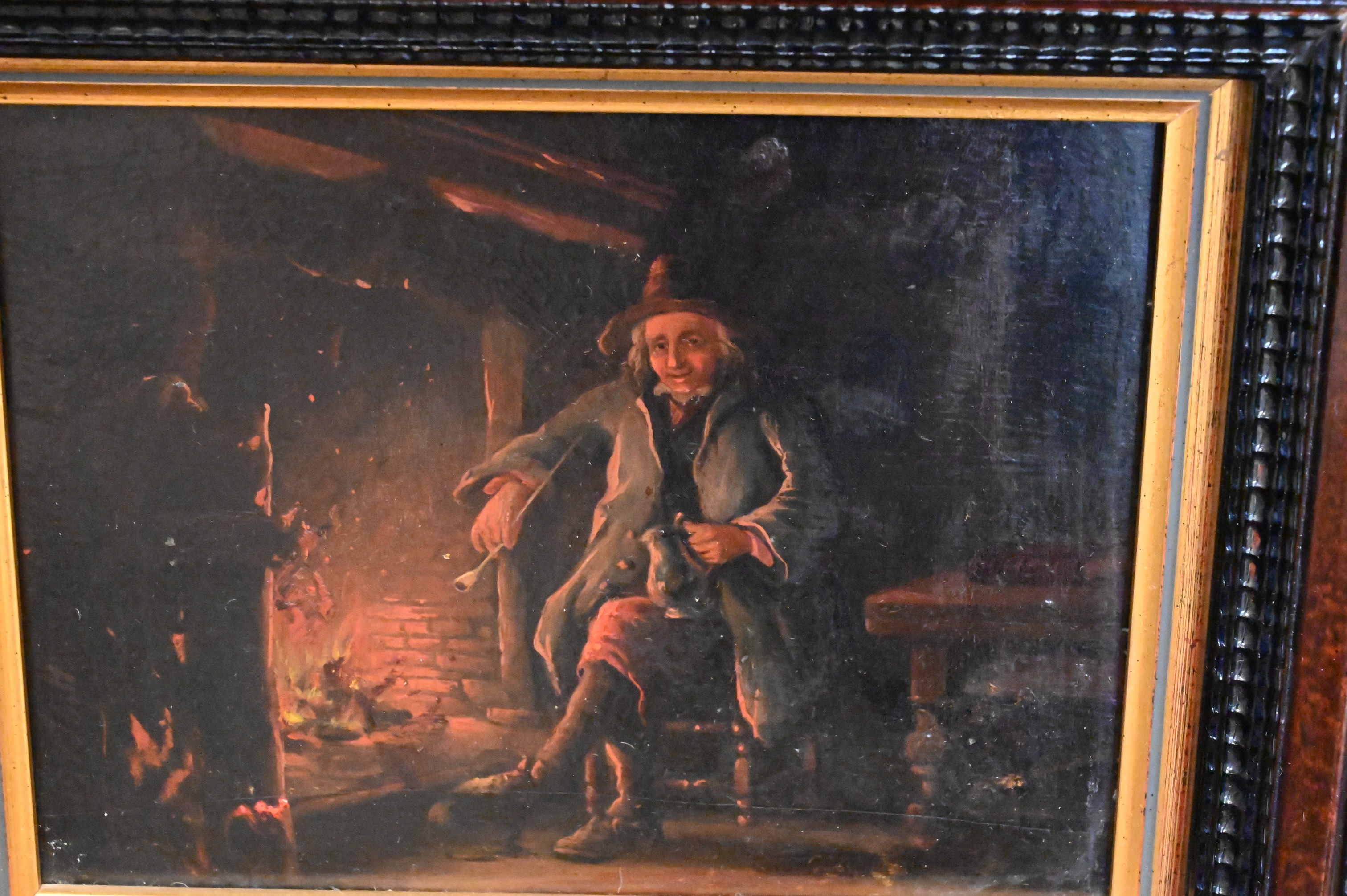 Oil on Panel Interior Dutch Scene sitting by fire smoking a pipe unsigned 6″ x 8″