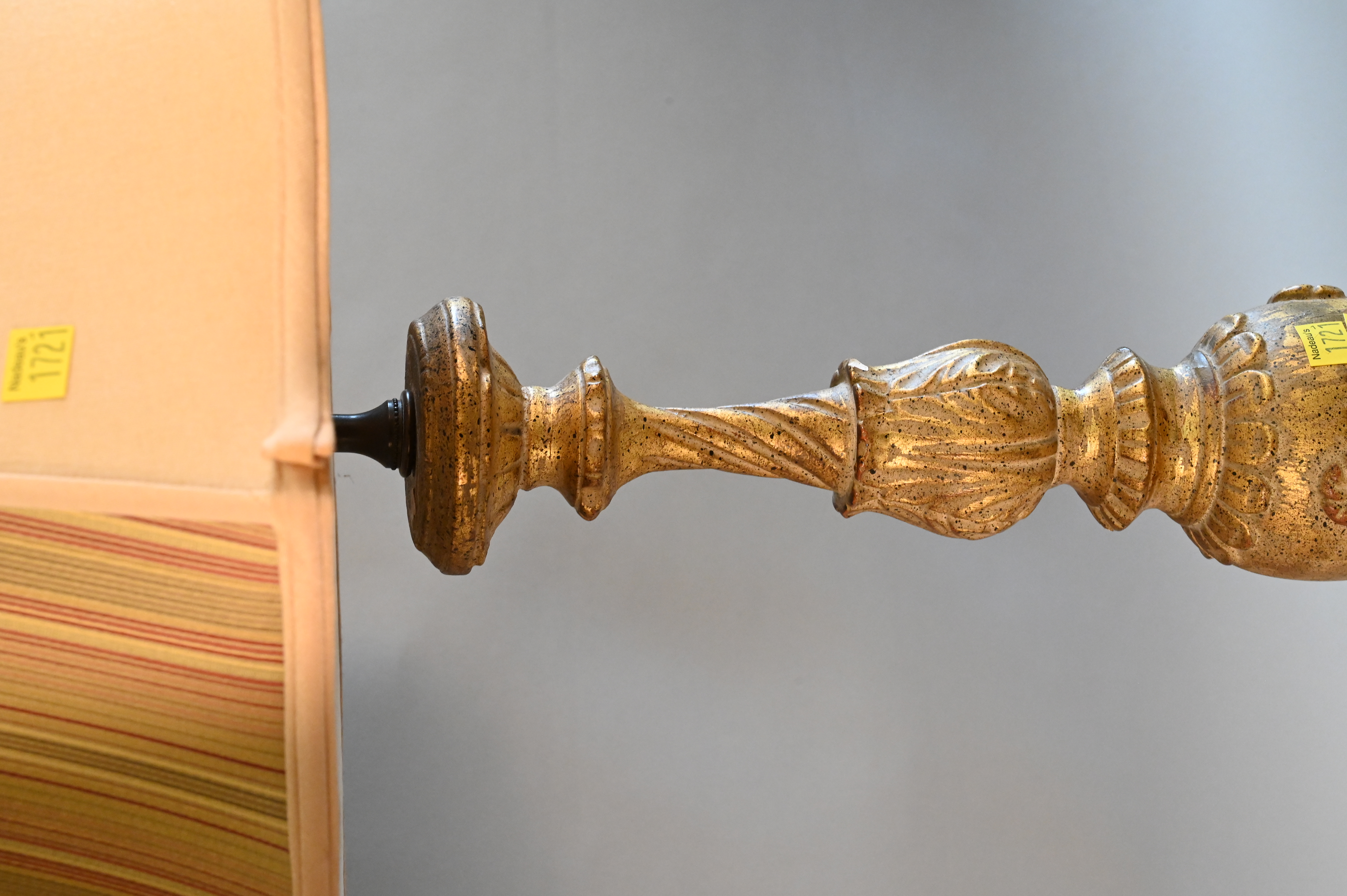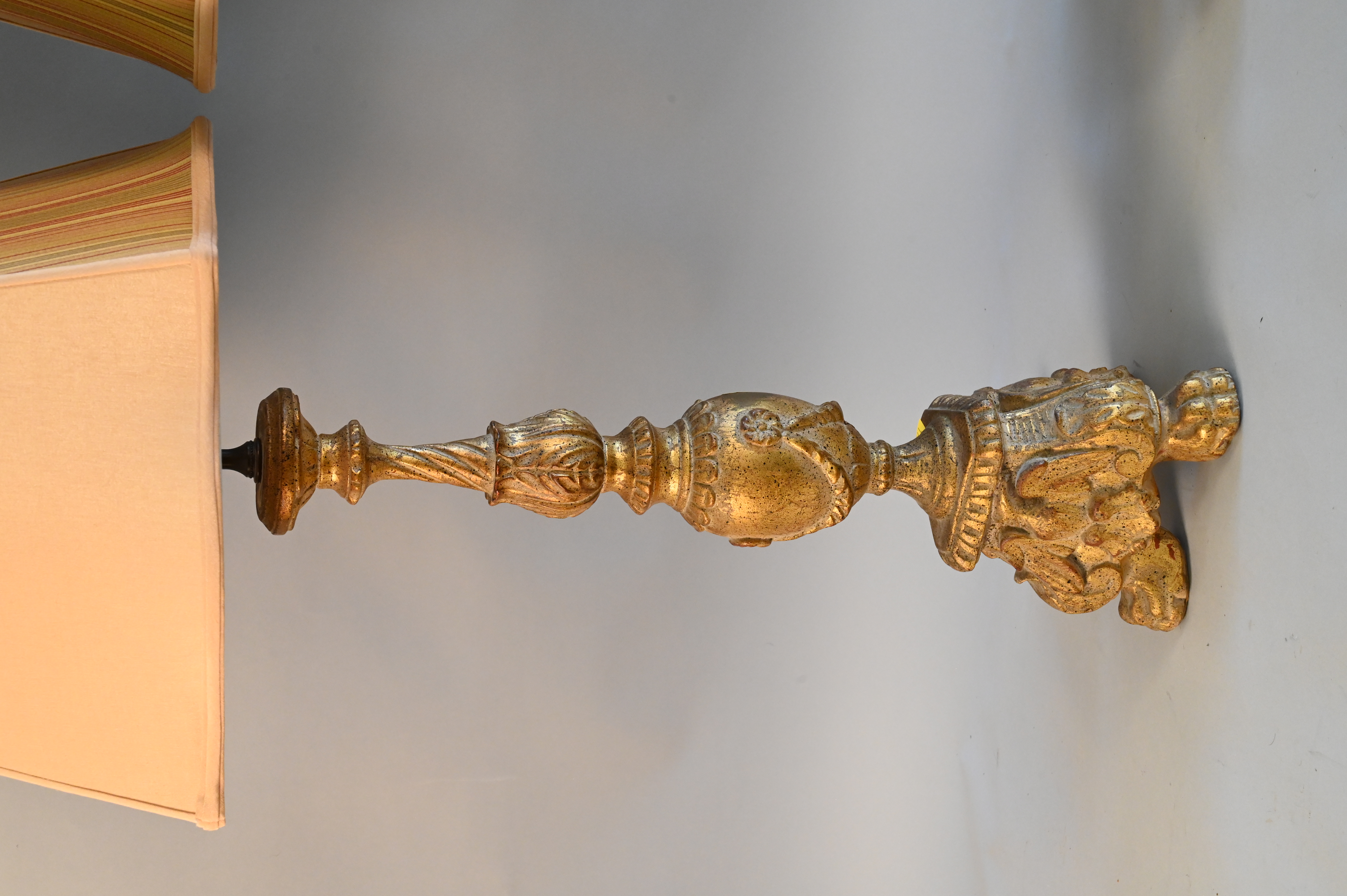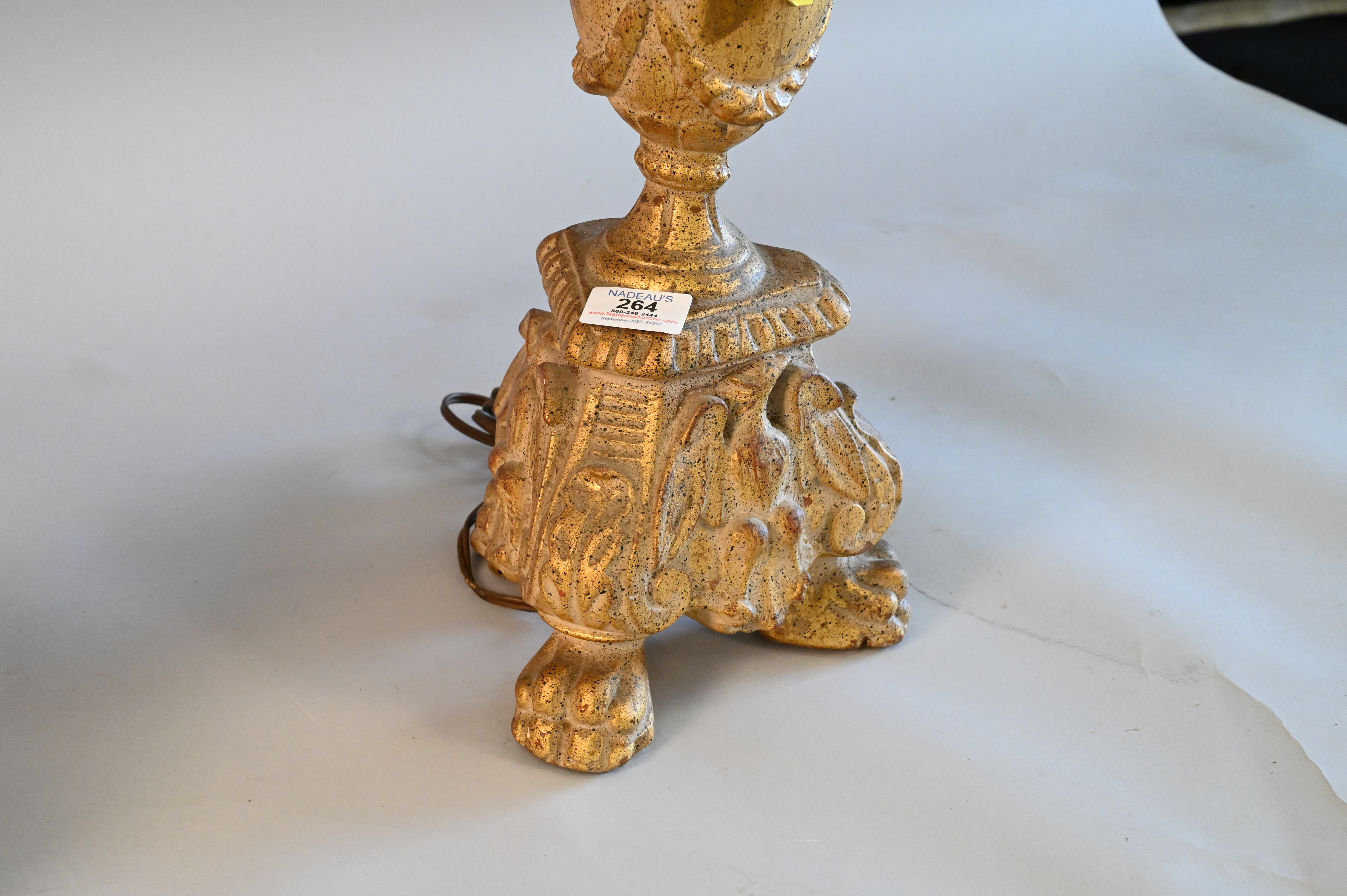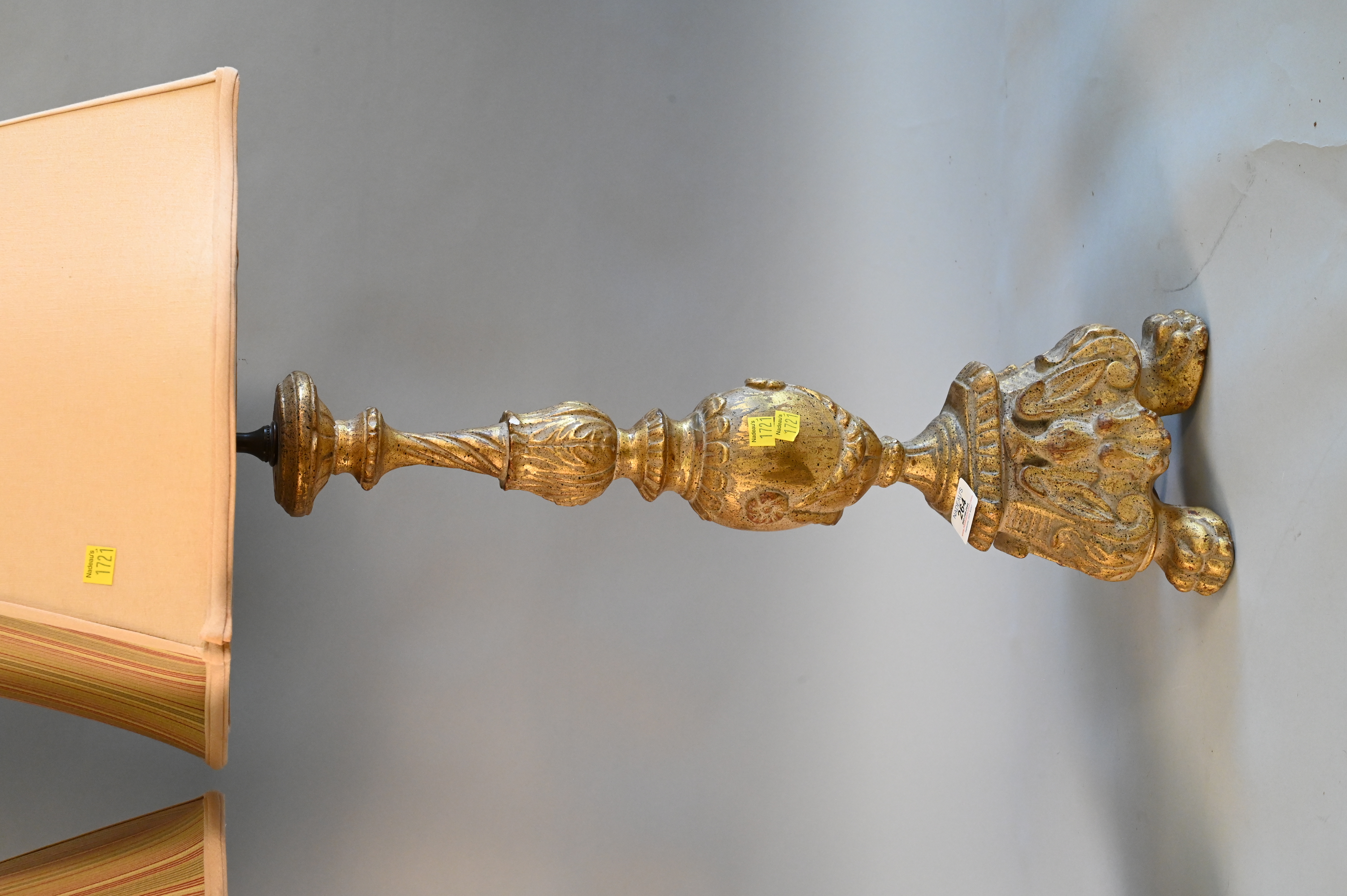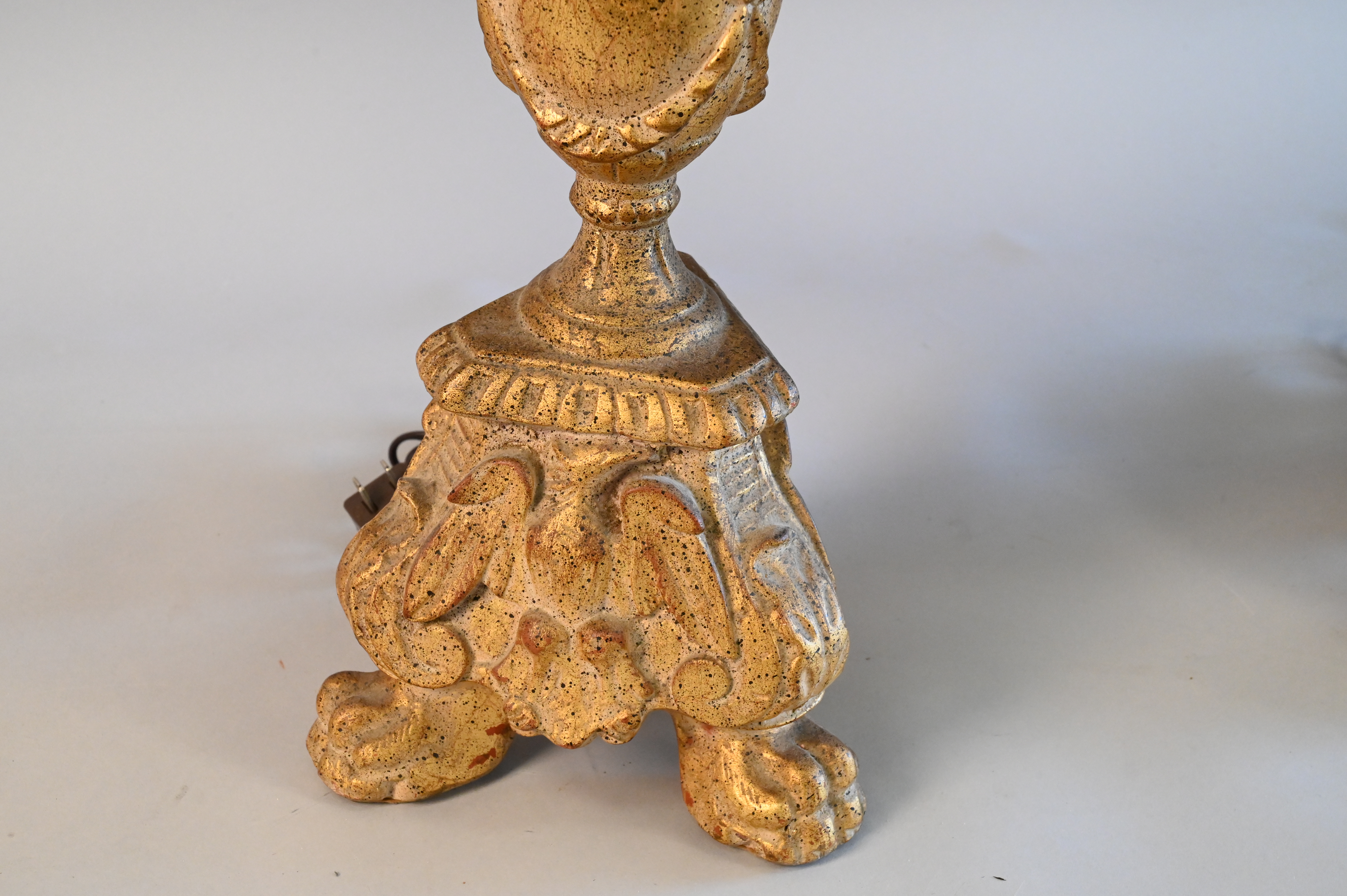Pair of Gilt Decorated Carved Lamps, having urn shaft set on three paw feet, having oust shades, height 36 inches.