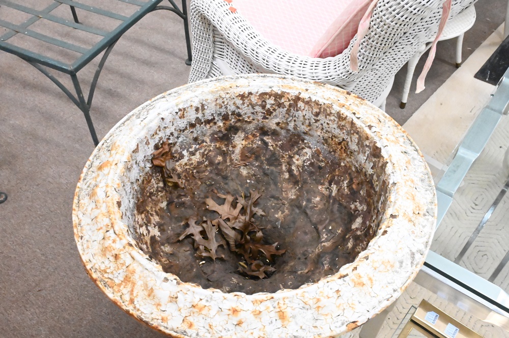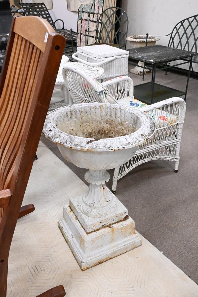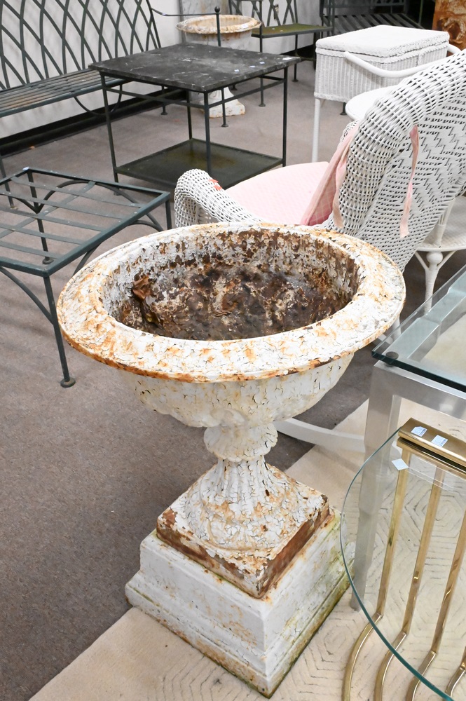 Lot 264: Pair of Victorian Iron Urns on Square Pedestals, total height 28 inches, inside diameter 15 inches.