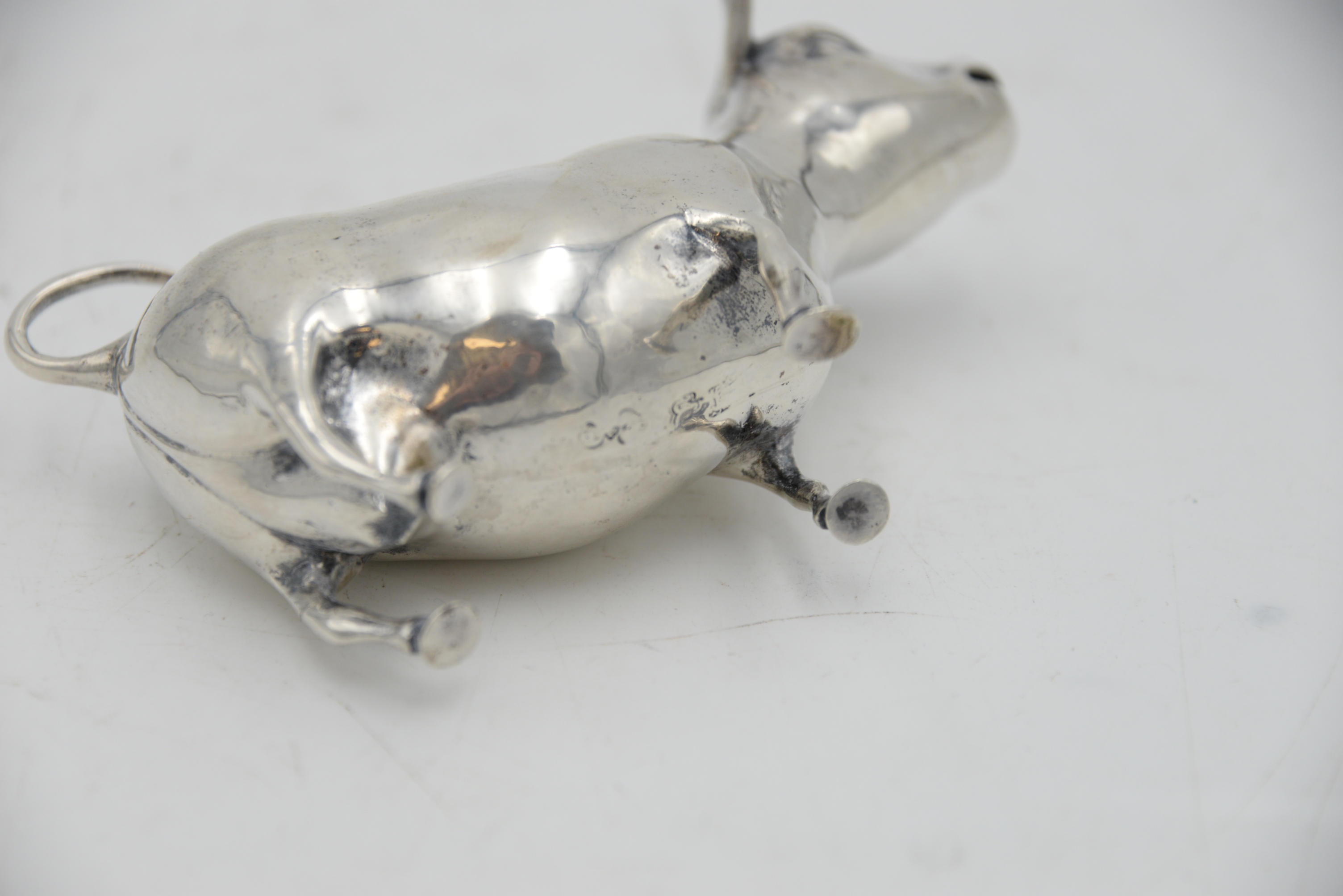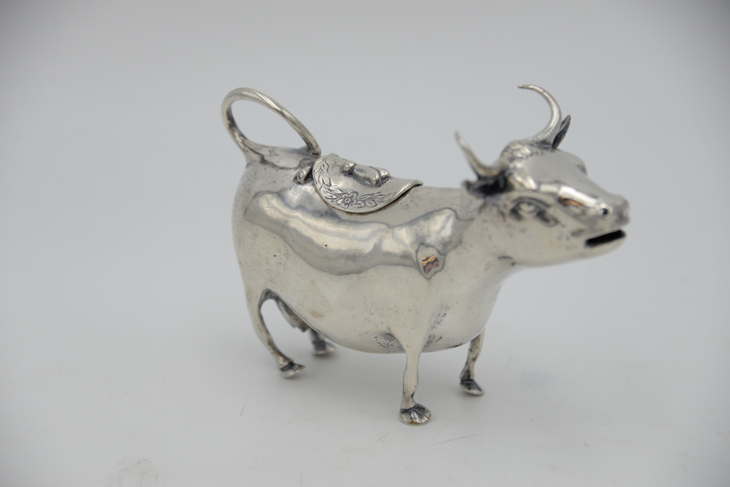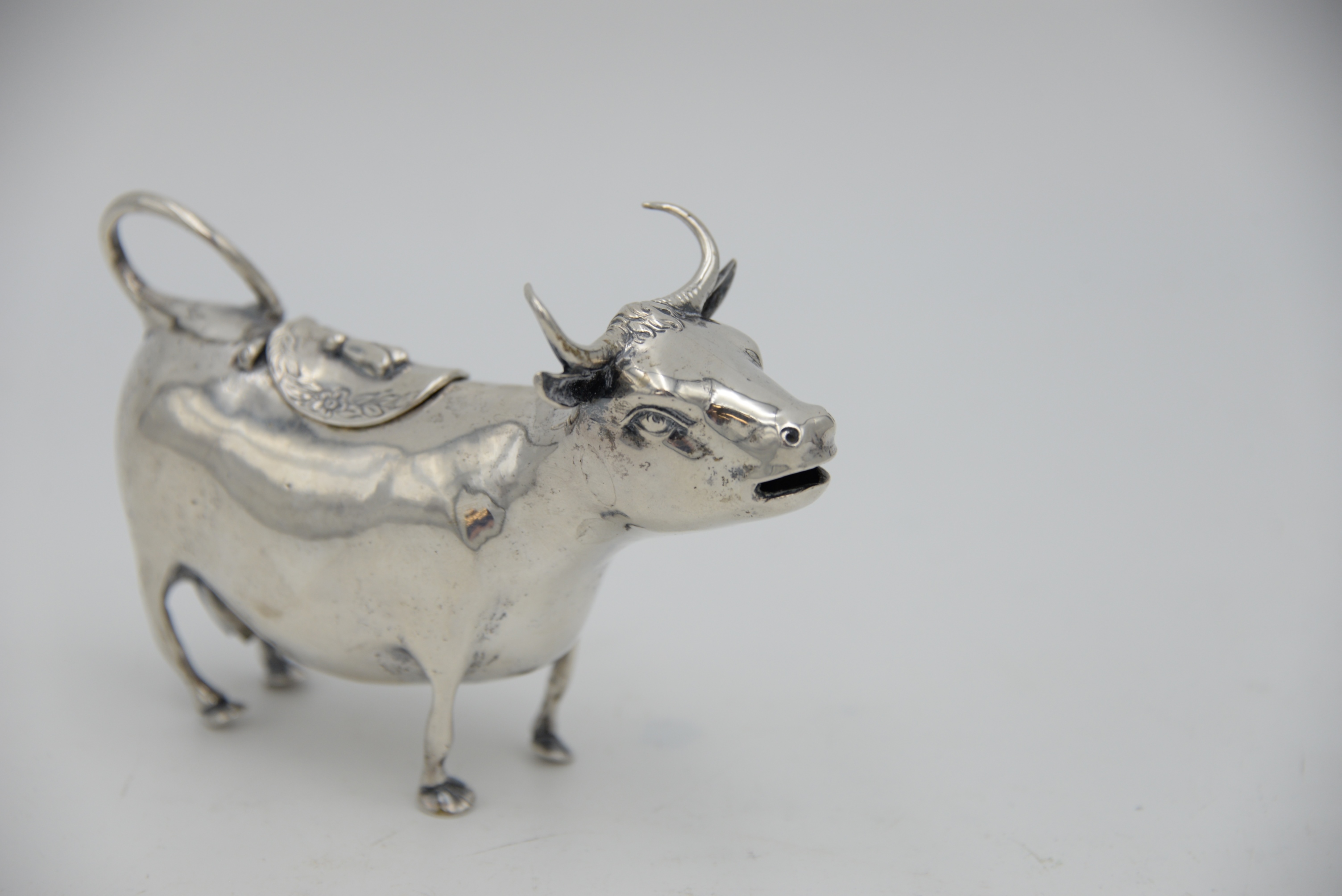 Silver Cow Creamer, having hinged lid on back, probably German 19th century, height 3 1/2 inches, length 5 1/2 inches, 5.3 oz.