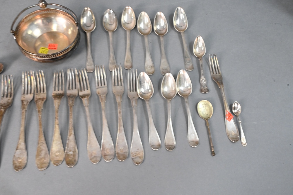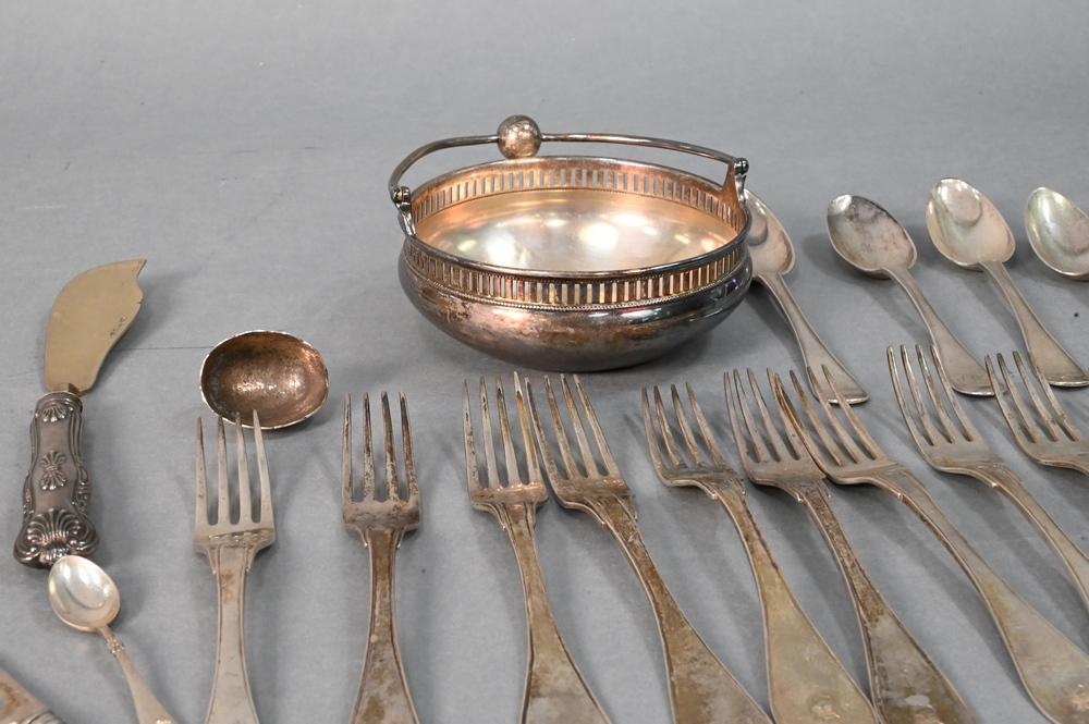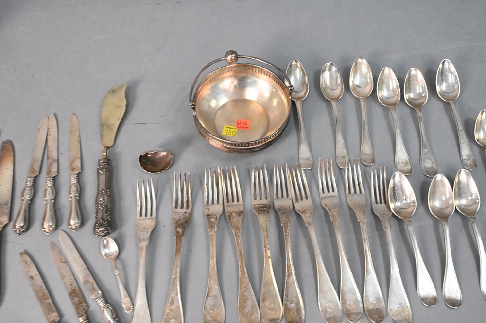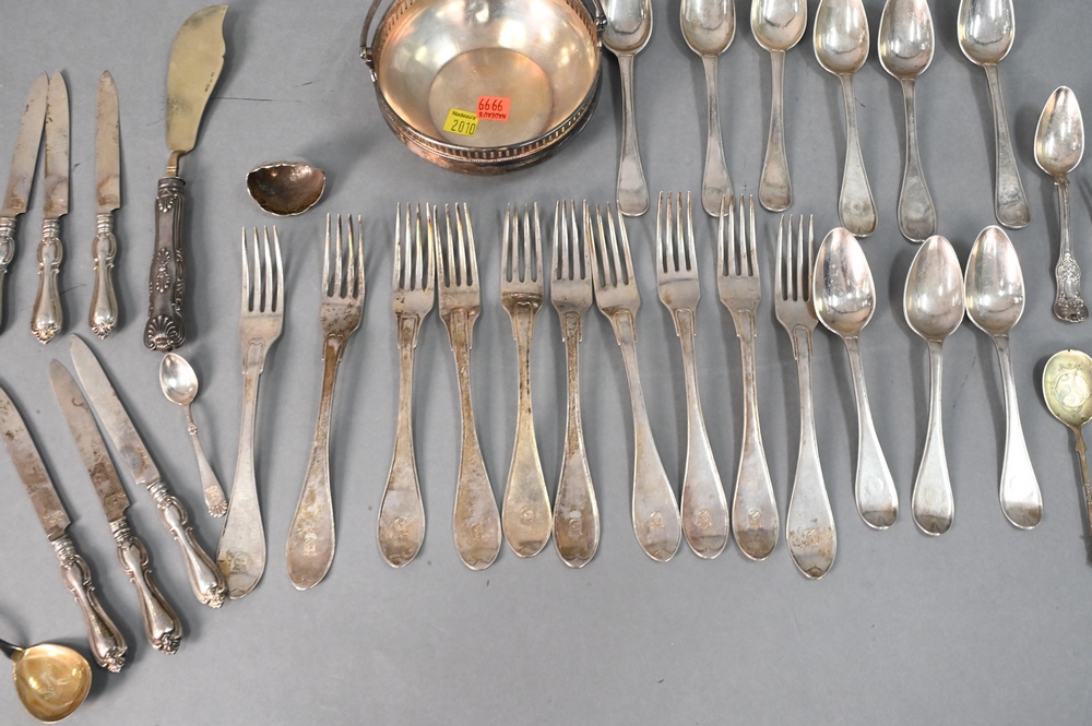 Lot 264: Swedish Silver Flatware Partial Set, 44 total pieces to include 11 dinner forks, 14 various spoons, 9 various weighted knives, 1 bowl, 1 odd, length 8 inches, diameter 9 inches, 44.6 t.oz., plus knives.