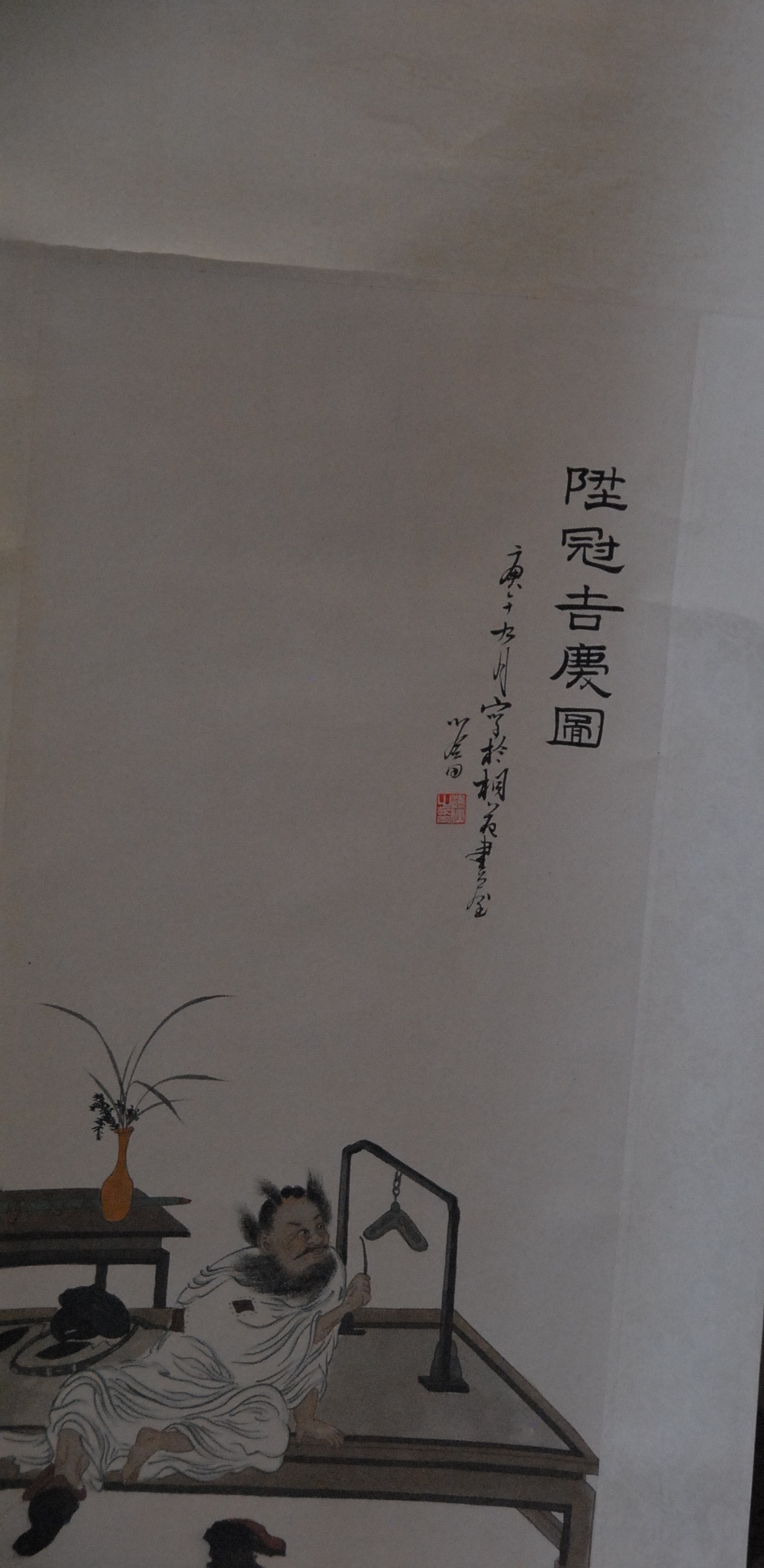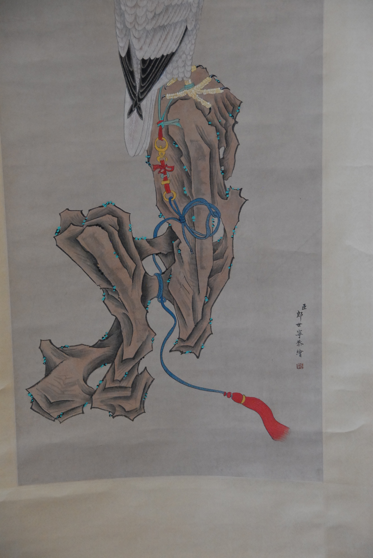 Lot 264: Three Oriental scrolls watercolor Falcon tied to tree 35 x 16, watercolor of man ringing bell 25 x 12, and watercolor of six bl…