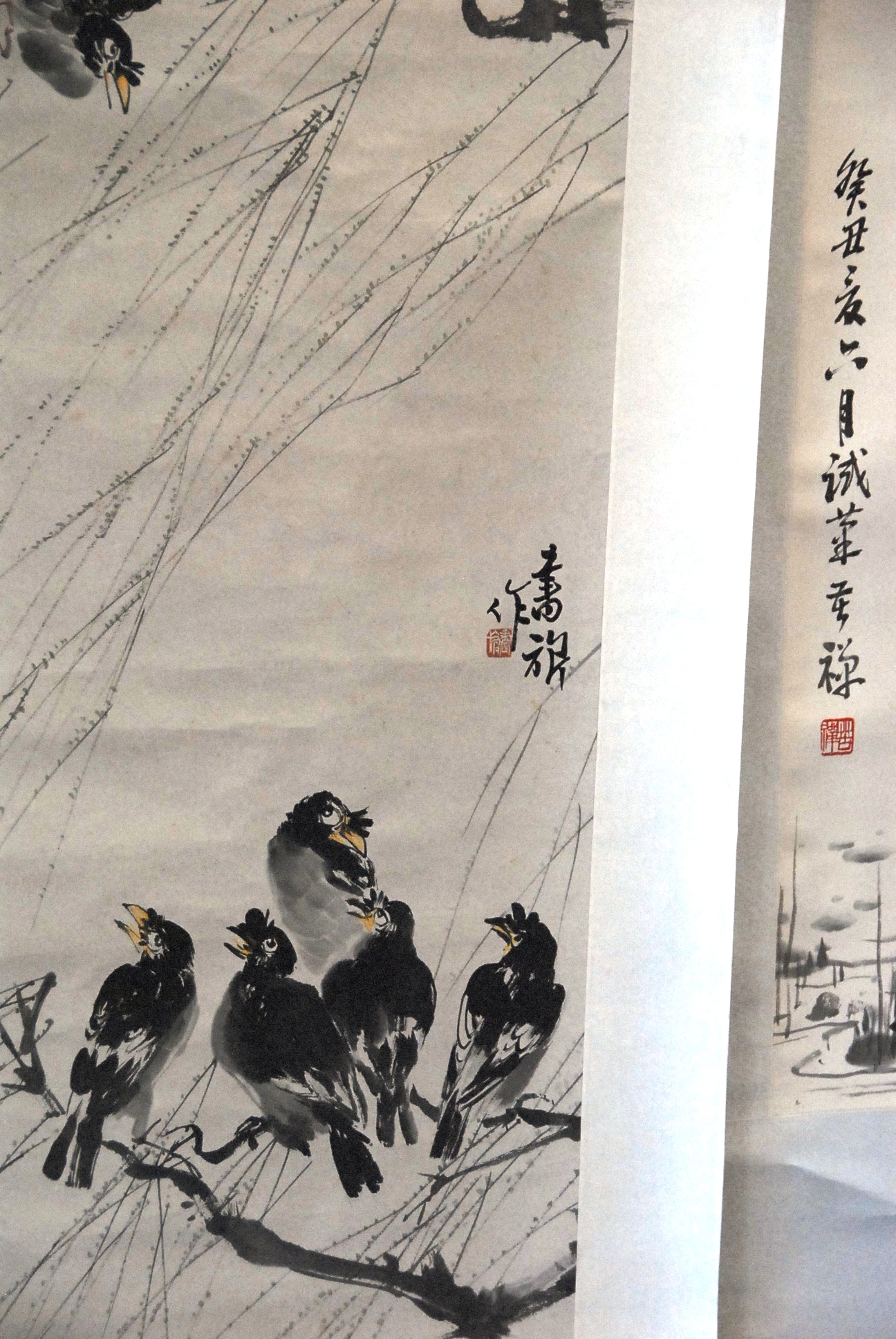 Three Oriental scrolls watercolor Falcon tied to tree 35 x 16, watercolor of man ringing bell 25 x 12, and watercolor of six black birds 27 x 17.