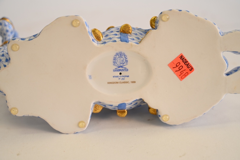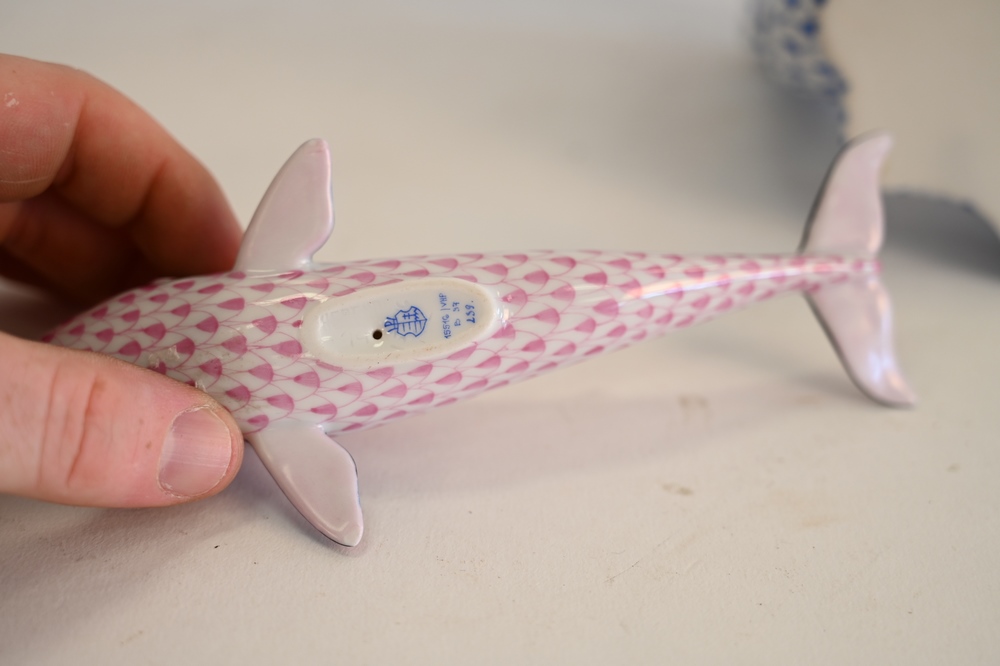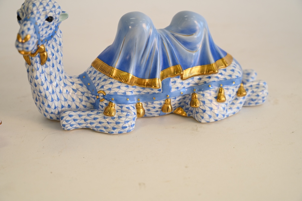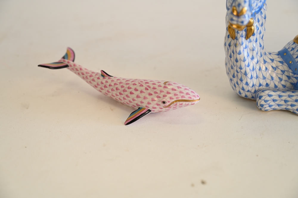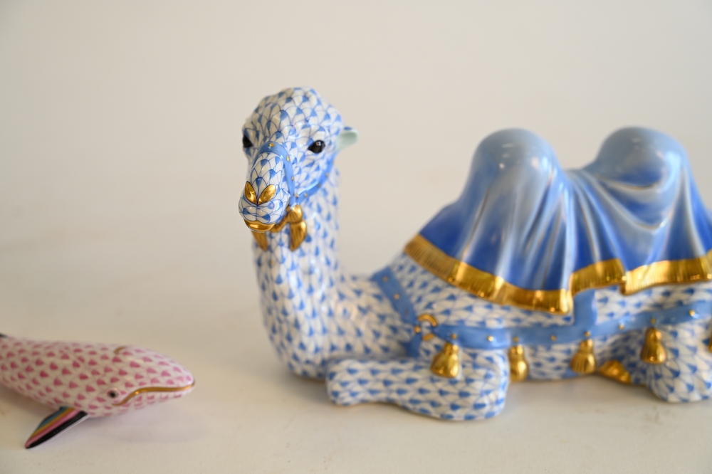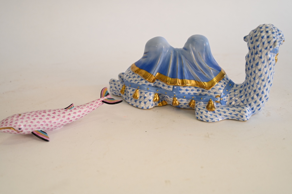 Lot 264: Two Piece Herend Lot, to include a camel with blue fishnet and gilt details, along with a pink fishnet whale, both marked to the underside, camel length 10 inches.