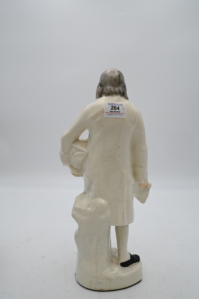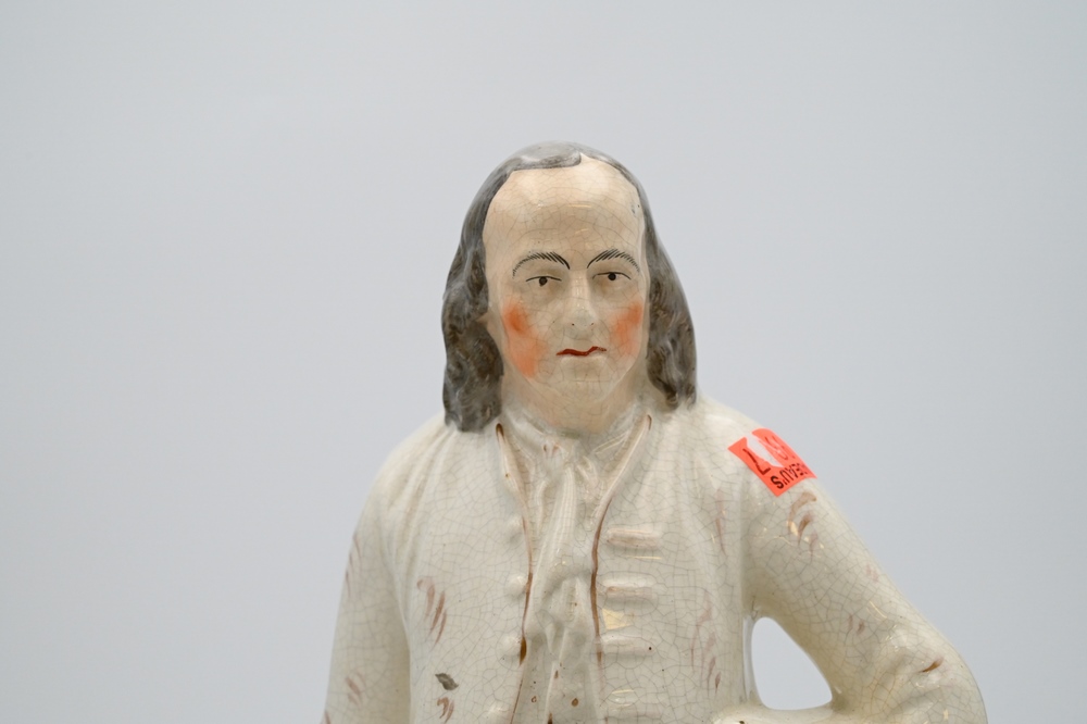 Lot 264: Victorian Staffordshire Figure, titled “Washington”, gilt and paint decorated standing figure, model holding tricorn hat under left arm, similarly modeled as depiction of Benjamin Franklin, height 15 1/2 inches.
