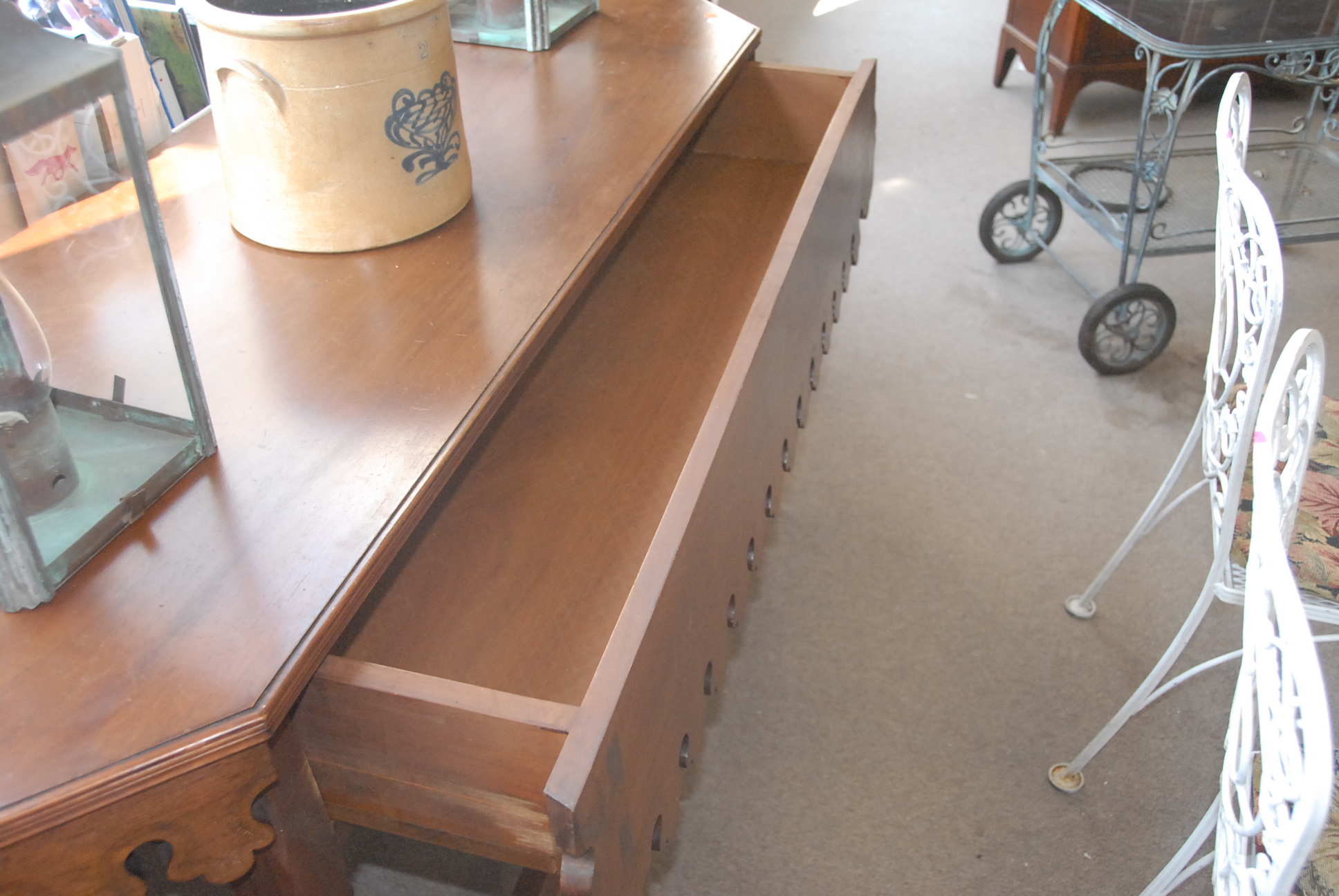 Walnut hall table with scalloped apron, ht. 33in. lg. 81in.