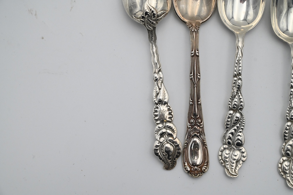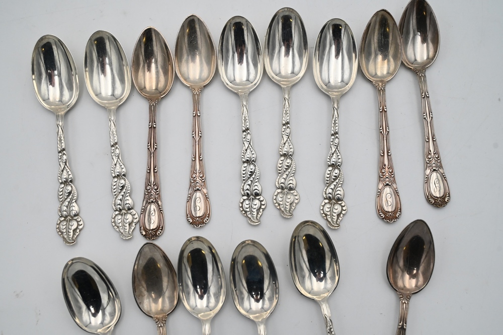 Lot 265: 15 Piece Lot, to include 9 sterling silver Tiffany & Company teaspoons, 9.77 t.oz, along with 6 Tiffany silver plate teaspoons.