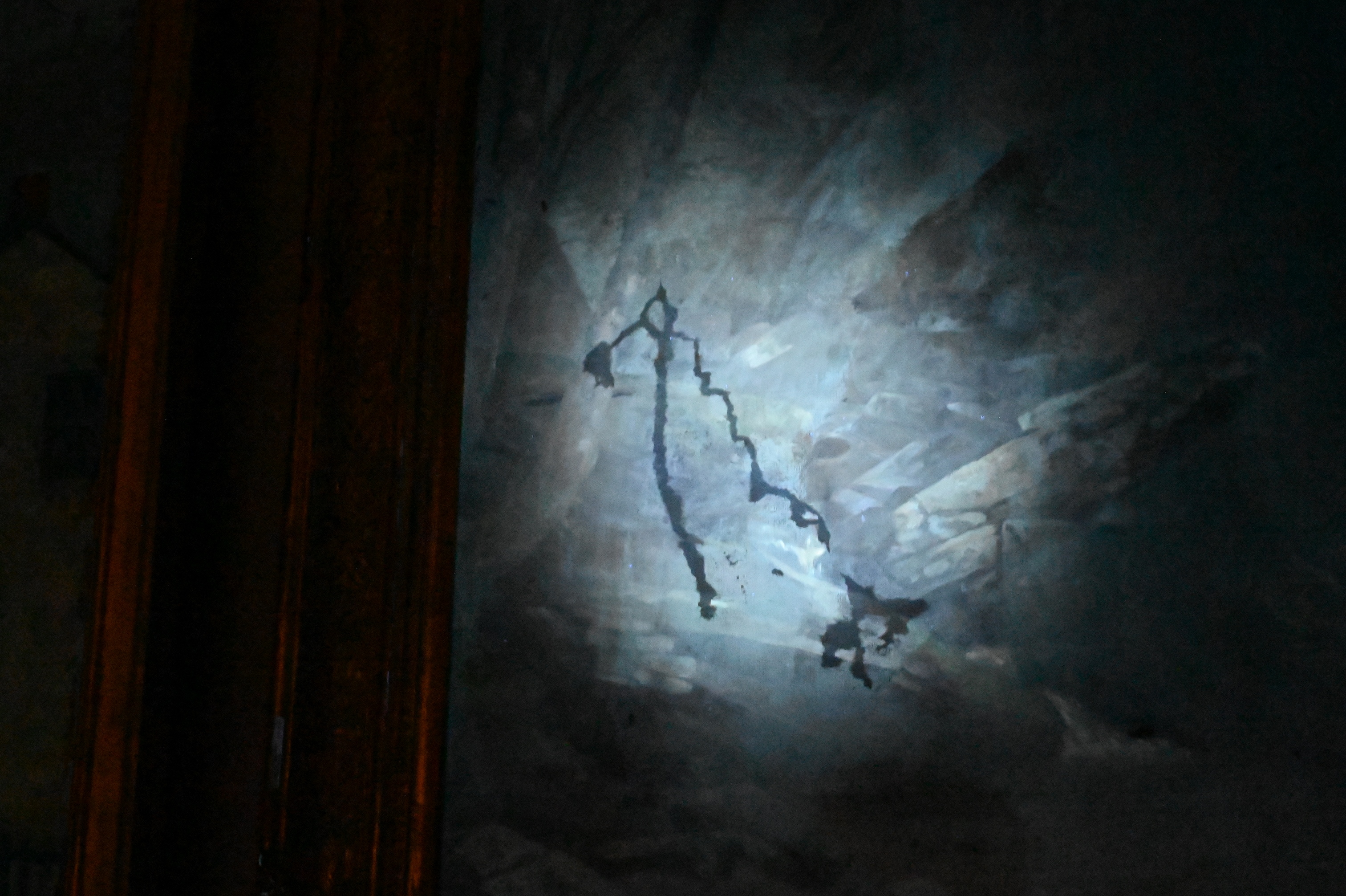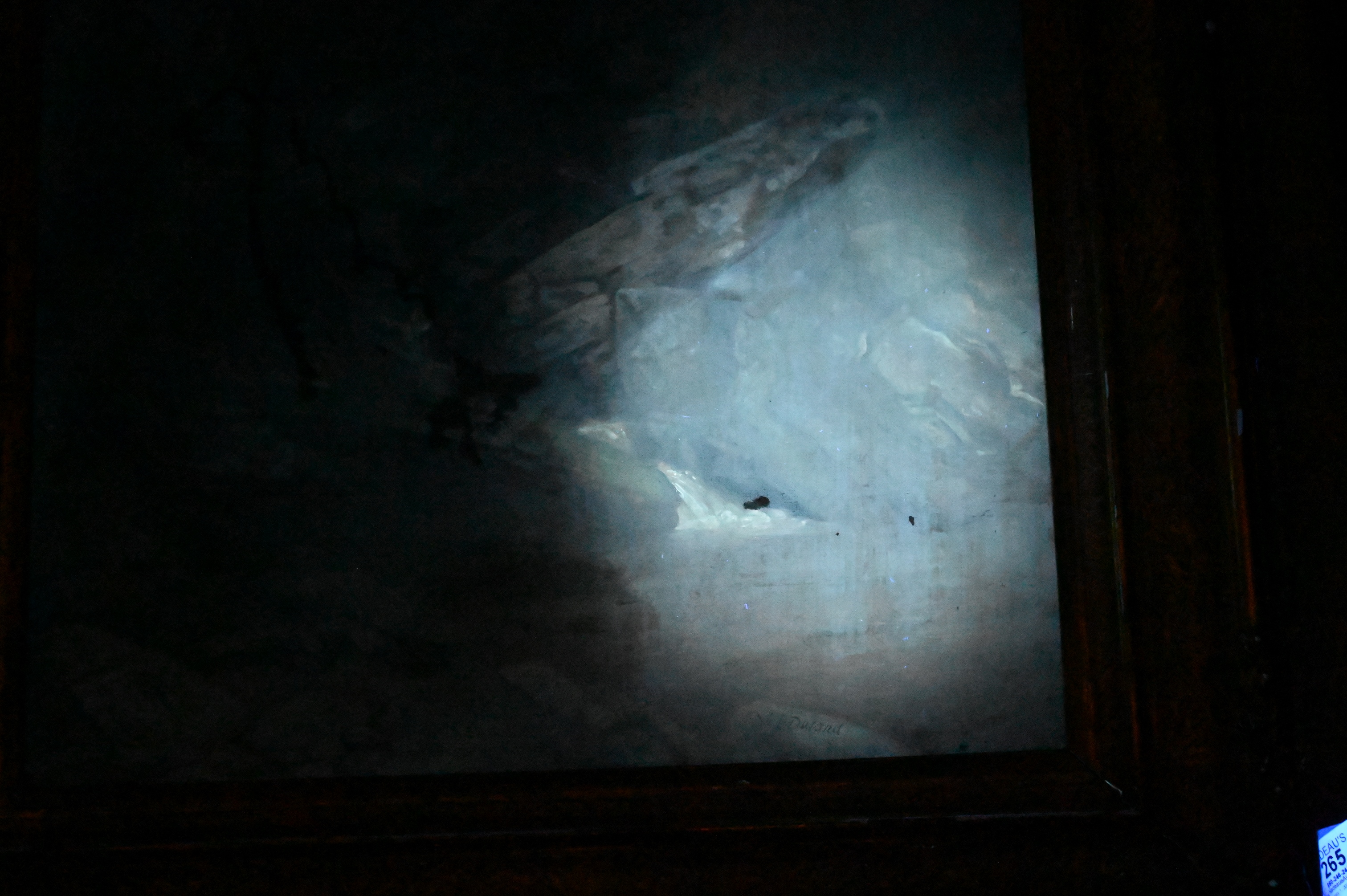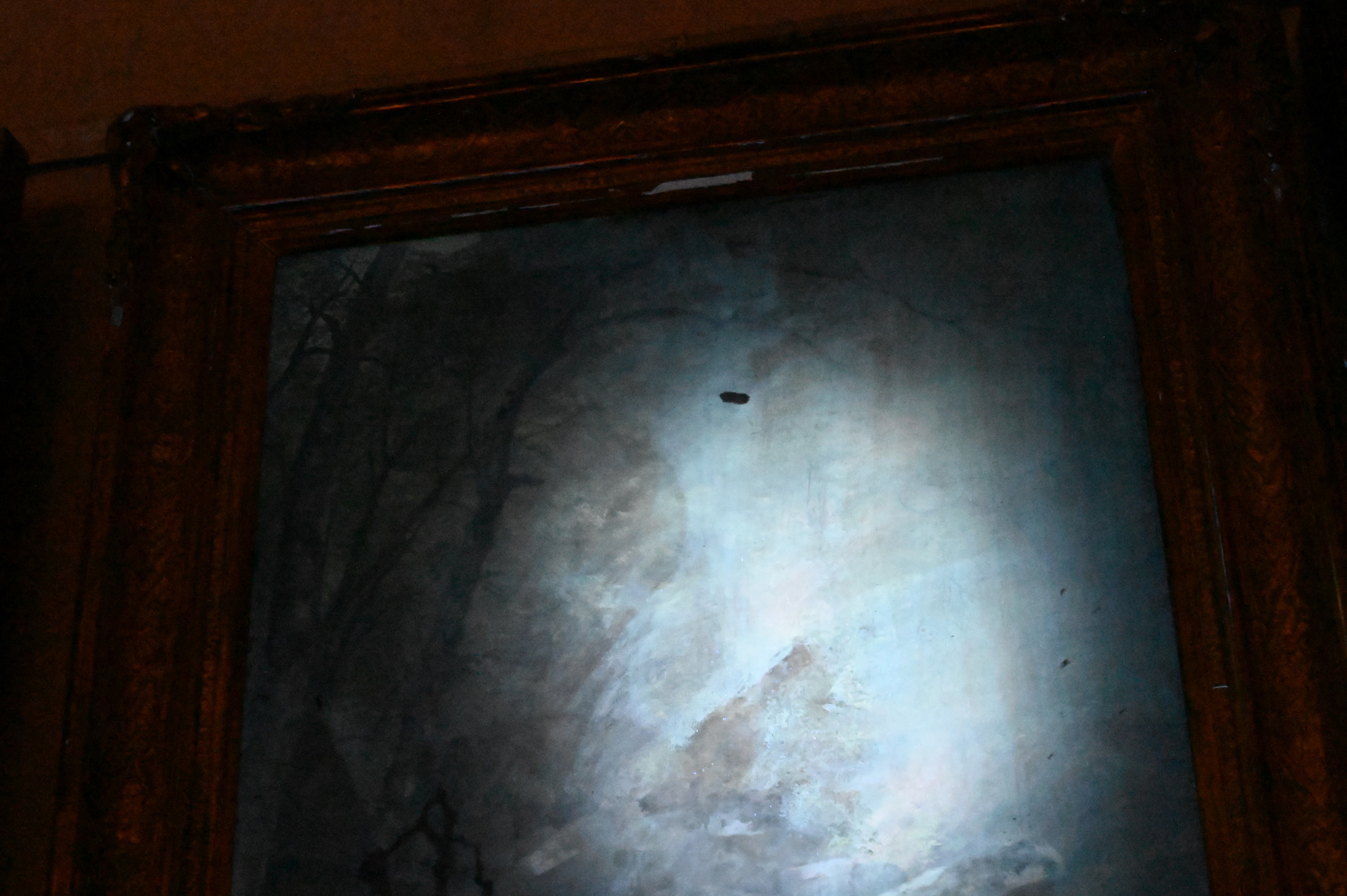 Black light: heavy varnish, large inpainting/repair to middle of canvas, see photos