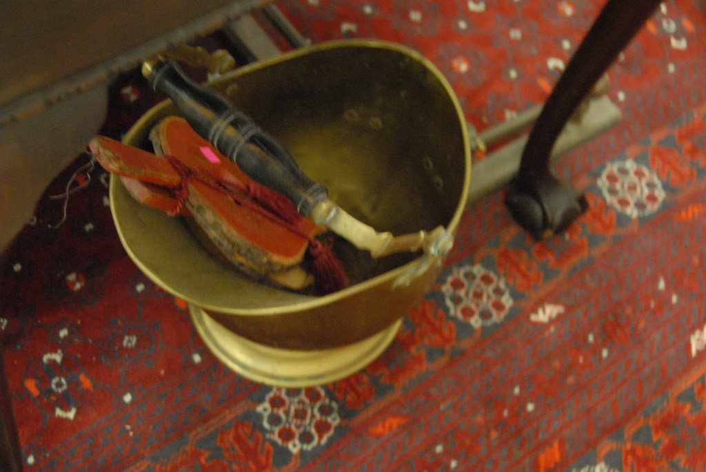 Brass lot to include pair of andirons, fire fender, bucket, strainer, and warmer.