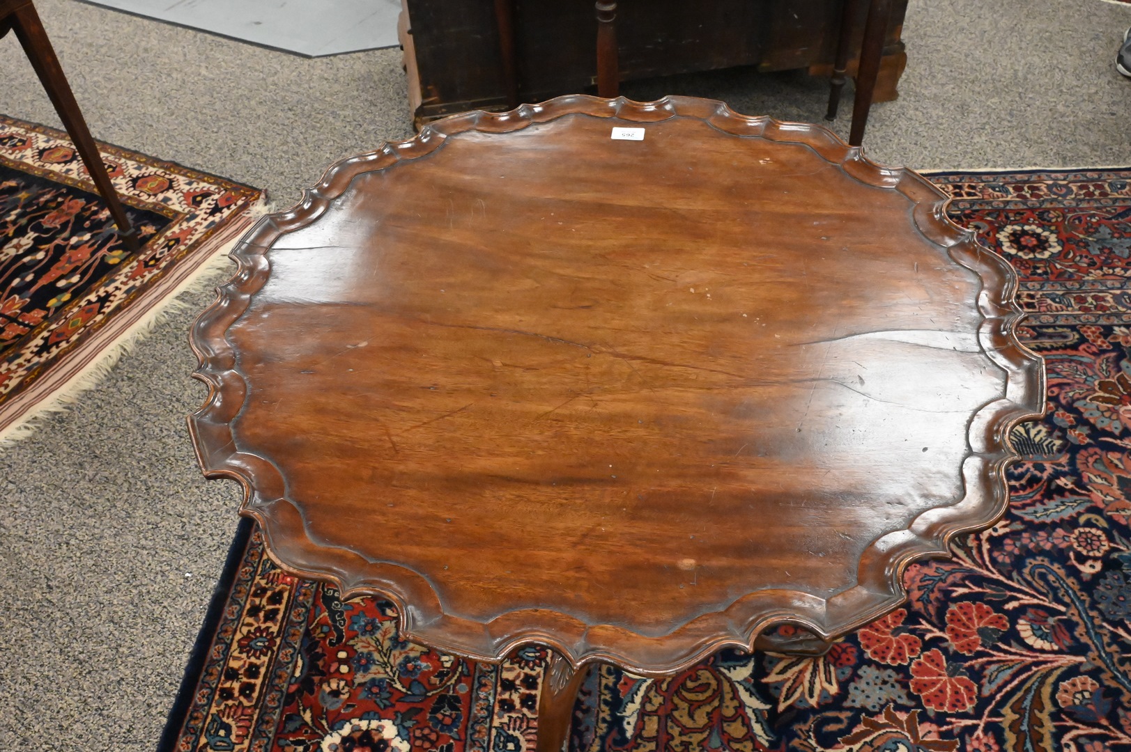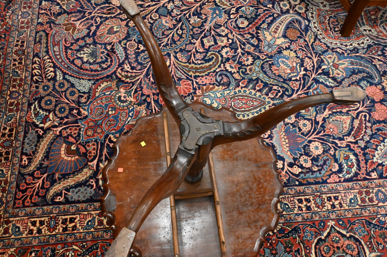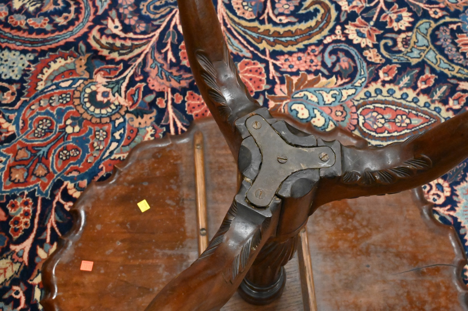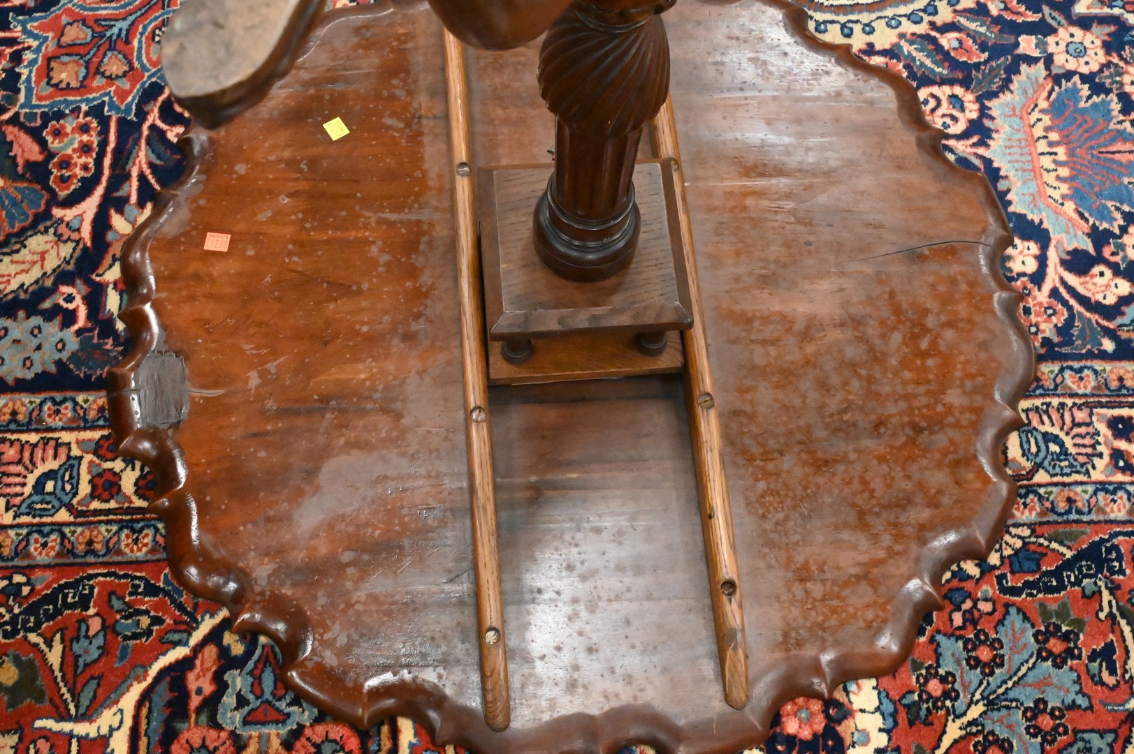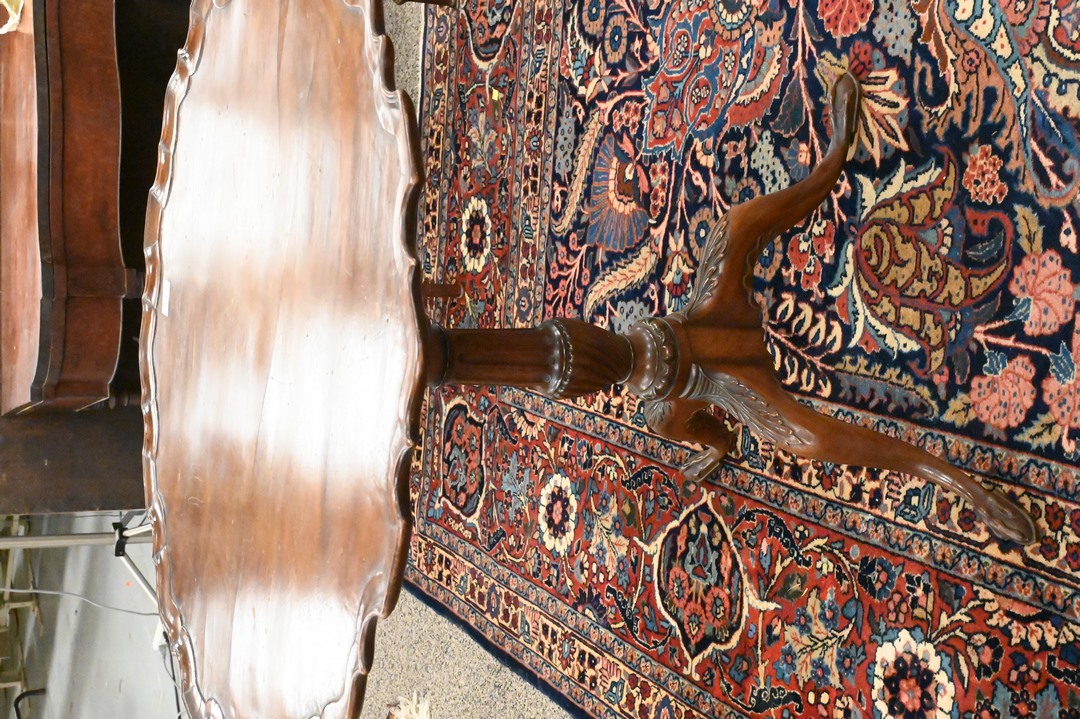 Chippendale Mahogany Tip Table, having pie crust edge, on carved and fluted pedestal and tripod base with carved knees, on ball and claw feet, height 28 3/4 inches, top 31″ x 31 1/2″, Provenance: Estate of Peter Tillou, Litchfield, Connecticut
